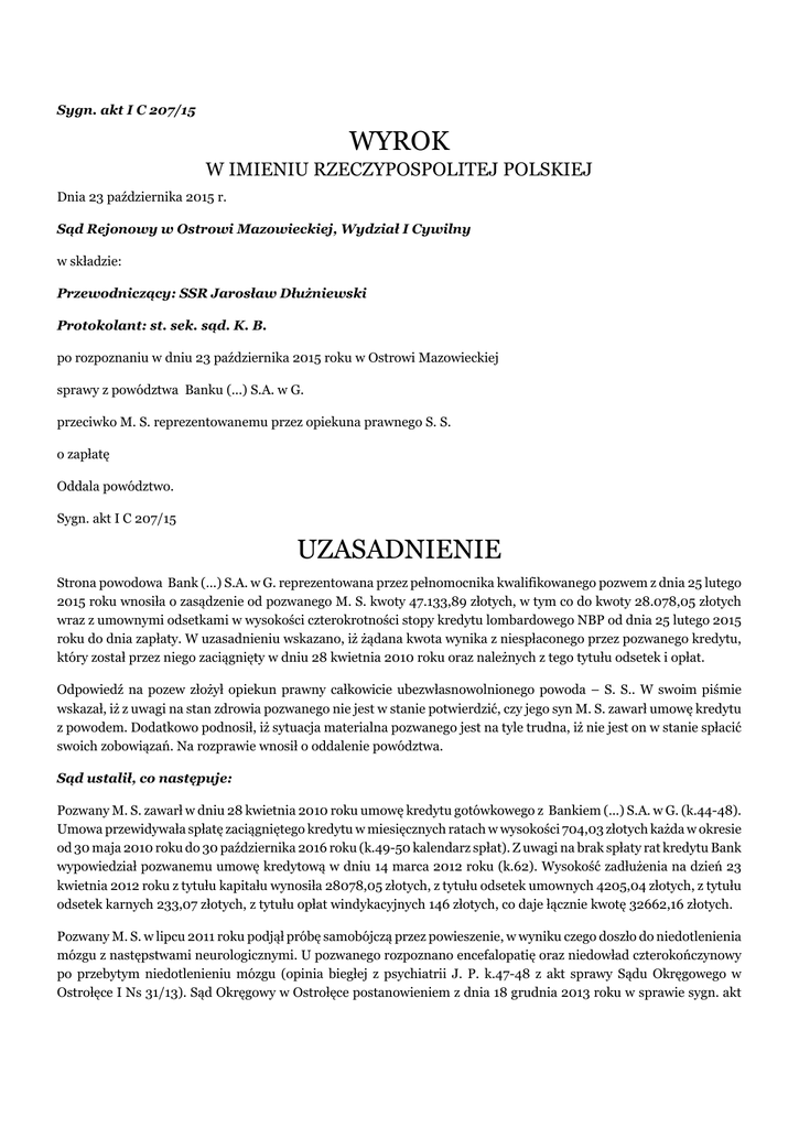 Sygn. akt I C 207/15 WYROK W IMIENIU RZECZYPOSPOLITEJ POLSKIEJ Dnia 23 października 2015 r. Sąd Rejonowy w Ostrowi Mazowieckiej, Wydział I Cywilny w składzie: Przewodniczący: SSR Jarosław Dłużniewski Protokolant: st. sek. sąd. K. B. po rozpoznaniu w dniu 23 października 2015 roku w Ostrowi Mazowieckiej sprawy z powództwa Banku (...) S.A. w G. przeciwko M. S. reprezentowanemu przez opiekuna prawnego S. S. o zapłatę Oddala powództwo. Sygn. akt I C 207/15 UZASADNIENIE Strona powodowa Bank (...) S.A. w G. reprezentowana przez pełnomocnika kwalifikowanego pozwem z dnia 25 lutego 2015 roku wnosiła o zasądzenie od pozwanego M. S. kwoty 47.133,89 złotych, w tym co do kwoty 28.078,05 złotych wraz z umownymi odsetkami w wysokości czterokrotności stopy kredytu lombardowego NBP od dnia 25 lutego 2015 roku do dnia zapłaty. W uzasadnieniu wskazano, iż żądana kwota wynika z niespłaconego przez pozwanego kredytu, który został przez niego zaciągnięty w dniu 28 kwietnia 2010 roku oraz należnych z tego tytułu odsetek i opłat. Odpowiedź na pozew złożył opiekun prawny całkowicie ubezwłasnowolnionego powoda – S. S.. W swoim piśmie wskazał, iż z uwagi na stan zdrowia pozwanego nie jest w stanie potwierdzić, czy jego syn M. S. zawarł umowę kredytu z powodem. Dodatkowo podnosił, iż sytuacja materialna pozwanego jest na tyle trudna, iż nie jest on w stanie spłacić swoich zobowiązań. Na rozprawie wnosił o oddalenie powództwa. Sąd ustalił, co następuje: Pozwany M. S. zawarł w dniu 28 kwietnia 2010 roku umowę kredytu gotówkowego z Bankiem (...) S.A. w G. (k.44-48). Umowa przewidywała spłatę zaciągniętego kredytu w miesięcznych ratach w wysokości 704,03 złotych każda w okresie od 30 maja 2010 roku do 30 października 2016 roku (k.49-50 kalendarz spłat). Z uwagi na brak spłaty rat kredytu Bank wypowiedział pozwanemu umowę kredytową w dniu 14 marca 2012 roku (k.62). Wysokość zadłużenia na dzień 23 kwietnia 2012 roku z tytułu kapitału wynosiła 28078,05 złotych, z tytułu odsetek umownych 4205,04 złotych, z tytułu odsetek karnych 233,07 złotych, z tytułu opłat windykacyjnych 146 złotych, co daje łącznie kwotę 32662,16 złotych. Pozwany M. S. w lipcu 2011 roku podjął próbę samobójczą przez powieszenie, w wyniku czego doszło do niedotlenienia mózgu z następstwami neurologicznymi. U pozwanego rozpoznano encefalopatię oraz niedowład czterokończynowy po przebytym niedotlenieniu mózgu (opinia biegłej z psychiatrii J. P. k.47-48 z akt sprawy Sądu Okręgowego w Ostrołęce I Ns 31/13). Sąd Okręgowy w Ostrołęce postanowieniem z dnia 18 grudnia 2013 roku w sprawie sygn. akt I Ns 31/13 ubezwłasnowolnił całkowicie M. S. z powodu encefalopatii (k.71 akta I Ns 31/13 - postanowienie Sądu Okręgowego). S. S. (opiekun prawny pozwanego) (k. 37 zaświadczenie) wyjaśnił przed Sądem (k.94-95), iż przed próbą samobójczą jego syn nie był chory psychicznie, a jego targnięcie się na własne życie było spowodowane silnym przeżyciem osobistym. Wskazał, iż pozwany obecnie przebywa w placówce opiekuńczo – leczniczej w T. i nie można nawiązać z nim kontaktu słownego, co nie znaczy, iż pozwany nie wie, co się z nim dzieje. Opiekun okazał na rozprawie Sądowi, iż pozwany otrzymuje rentę w wysokości 648,40 złotych, nie mniej jednak kwota ta podlega egzekucji z powodu zasądzonych od pozwanego świadczeń alimentacyjnych na jego pięcioro dzieci. S. S. wskazał także, iż jego syn nie ma żadnego majątku, ani nie uzyskuje dodatkowych dochodów. Niezależnie od powyższego ojciec pozwanego wyjaśnił, iż wciąż ma nadzieję, że stan zdrowia jego syna kiedyś ulegnie poprawie, dlatego też nie szczędzi pieniędzy na opiekę i leczenie syna. Sąd zważył, co następuje: Powództwo wywiedzione przez stronę powodową podlegało oddaleniu z powodu uznania, iż stanowi ono naruszenie zasad współżycia społecznego. Materiał dowodowy zgromadzony w sprawie nie pozostawiał wątpliwości, iż pozwany zawarł z powodem umowę kredytu, jednak wskutek niewywiązywania się z jej warunków poprzez spłatę rat kredytu doprowadził do wypowiedzenia jej przez kredytodawcę. Sąd nie powziął również wątpliwości, co do ważności przedmiotowej umowy kredytu – biorąc pod uwagę wyjaśnienia opiekuna prawnego tj. ojca pozwanego, iż jego syn przed próbą samobójczą nie cierpiał na chorobę psychiczną. Wobec braku przeciwstawnych dowodów Sąd uznał, iż po stronie pozwanego nie zachodziły okoliczności, które by wskazywały, iż M. S. w chwili zawarcia umowy był w stanie wyłączającym świadome albo swobodne powzięcie decyzji i wyrażenie woli, a tym samym zawarta przez pozwanego umowa kredytowa jest ważna. Niezależnie od powyższego należało w sprawie uznać, iż wskutek nadzwyczajnych okoliczności, jakim była późniejsza próba samobójcza przez powieszenie podjęta przez pozwanego oraz obecny stan zdrowia M. S., koniecznym było rozważenie, czy roszczenie z jakim wystąpił powód nie jest sprzeczne z zasadami współżycia społecznego. W tym przedmiocie pełnomocnik powoda wywodził (k. 41-43 pismo procesowe), iż pozwany w chwili zawierania umowy posiadał pełną zdolność do czynności prawnych, zaś ubezwłasnowolnienie nastąpiło już po zawarciu i wypowiedzeniu umowy. Fakt zaś, iż udzielony kredyt przeznaczony został na spłatę innych zobowiązań oraz to, iż pozwany przez przeszło rok od zawarcia umowy dokonywał regularnej spłaty zobowiązań, wysokości wskazanej precyzyjnie w harmonogramie spłaty – zdaniem pełnomocnika powoda – świadczyć by miało, iż umowę pozwany zawarł w stanie umożliwiającym świadome i swobodne podjęcie decyzji i złożenie oświadczenia woli jej zawarcia. Dodatkowo pełnomocnik podnosił, iż obecny stan zdrowia pozwanego oraz jego sytuacja majątkowa nie powinna mieć wpływu na oddalenie powództwa, ponieważ w przypadku braku 