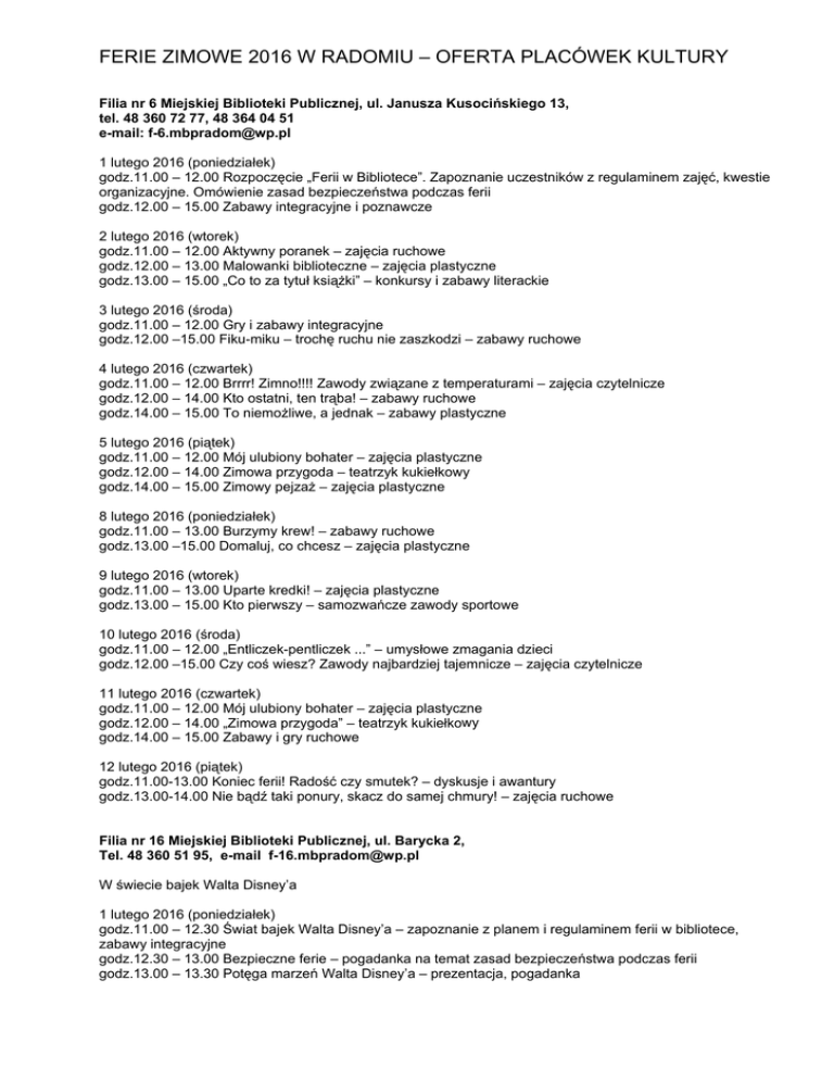 FERIE ZIMOWE 2016 W RADOMIU – OFERTA PLACÓWEK KULTURY Filia nr 6 Miejskiej Biblioteki Publicznej, ul. Janusza Kusocińskiego 13, tel. 48 360 72 77, 48 364 04 51 e-mail: [email protected] 1 lutego 2016 (poniedziałek) godz.11.00 – 12.00 Rozpoczęcie „Ferii w Bibliotece”. Zapoznanie uczestników z regulaminem zajęć, kwestie organizacyjne. Omówienie zasad bezpieczeństwa podczas ferii godz.12.00 – 15.00 Zabawy integracyjne i poznawcze 2 lutego 2016 (wtorek) godz.11.00 – 12.00 Aktywny poranek – zajęcia ruchowe godz.12.00 – 13.00 Malowanki biblioteczne – zajęcia plastyczne godz.13.00 – 15.00 „Co to za tytuł książki” – konkursy i zabawy literackie 3 lutego 2016 (środa) godz.11.00 – 12.00 Gry i zabawy integracyjne godz.12.00 –15.00 Fiku-miku – trochę ruchu nie zaszkodzi – zabawy ruchowe 4 lutego 2016 (czwartek) godz.11.00 – 12.00 Brrrr! Zimno!!!! Zawody związane z temperaturami – zajęcia czytelnicze godz.12.00 – 14.00 Kto ostatni, ten trąba! – zabawy ruchowe godz.14.00 – 15.00 To niemożliwe, a jednak – zabawy plastyczne 5 lutego 2016 (piątek) godz.11.00 – 12.00 Mój ulubiony bohater – zajęcia plastyczne godz.12.00 – 14.00 Zimowa przygoda – teatrzyk kukiełkowy godz.14.00 – 15.00 Zimowy pejzaż – zajęcia plastyczne 8 lutego 2016 (poniedziałek) godz.11.00 – 13.00 Burzymy krew! – zabawy ruchowe godz.13.00 –15.00 Domaluj, co chcesz – zajęcia plastyczne 9 lutego 2016 (wtorek) godz.11.00 – 13.00 Uparte kredki! – zajęcia plastyczne godz.13.00 – 15.00 Kto pierwszy – samozwańcze zawody sportowe 10 lutego 2016 (środa) godz.11.00 – 12.00 „Entliczek-pentliczek ...” – umysłowe zmagania dzieci godz.12.00 –15.00 Czy coś wiesz? Zawody najbardziej tajemnicze – zajęcia czytelnicze 11 lutego 2016 (czwartek) godz.11.00 – 12.00 Mój ulubiony bohater – zajęcia plastyczne godz.12.00 – 14.00 „Zimowa przygoda” – teatrzyk kukiełkowy godz.14.00 – 15.00 Zabawy i gry ruchowe 12 lutego 2016 (piątek) godz.11.00-13.00 Koniec ferii! Radość czy smutek? – dyskusje i awantury godz.13.00-14.00 Nie bądź taki ponury, skacz do samej chmury! – zajęcia ruchowe Filia nr 16 Miejskiej Biblioteki Publicznej, ul. Barycka 2, Tel. 48 360 51 95, e-mail [email protected] W świecie bajek Walta Disney’a 1 lutego 2016 (poniedziałek) godz.11.00 – 12.30 Świat bajek Walta Disney’a – zapoznanie z planem i regulaminem ferii w bibliotece, zabawy integracyjne godz.12.30 – 13.00 Bezpieczne ferie – pogadanka na temat zasad bezpieczeństwa podczas ferii godz.13.00 – 13.30 Potęga marzeń Walta Disney’a – prezentacja, pogadanka godz.13.30 – 15.00 Bajkowe witraże – zajęcia plastyczne 2 lutego 2016 (wtorek) godz.11.00 – 12.00 Jaka to bajka? – czytanie fragmentów książek i pogadanka na temat tolerancji godz.12.00 – 13.00 Inny nie znaczy gorszy – zabawy integracyjne oparte na wspólnym działaniu i akceptacji godz.13.00 – 14.00 Podniebne podróże małego słonika – zajęcia plastyczne godz.14.00 – 15.00 Co było dalej? – zabawa z tekstem literackim 3 lutego 2016 (środa) godz.11.00 – 12.00 Jaka to bajka? – czytanie fragmentów książek i pogadanka na temat przyjaźni godz.12.00 – 13.00 Łapacze snów – zajęcia plastyczne godz.13.00 – 14.00 Podaj rękę – zabawy integracyjne godz.14.00 – 15.00 Przyjaźń to największy skarb - zajęcia literackie 4 lutego 2016 (czwartek) godz.11.00 – 12.00 Jaka to bajka? – czytanie fragmentów książek i pogadanka o łakomstwie godz.12.00 – 13.00 Jak się zachować przy stole – scenki rodzajowe godz.13.00 – 14.00 Niezłe z nas ziółka – zajęcia plastyczne z wykorzystaniem ziół godz.14.00 – 15.00 Spalamy kalorie – zabawy ruchowe 5 lutego 2016 (piątek) godz.11.00 – 12.30 Magia karnawału – zajęcia plastyczne godz.12.30 – 13.00 Na wybiegu - pokaz mody karnawałowej godz.13.00 – 15.00 Bal karnawałowy z Kopciuszkiem 8 lutego 2016 (poniedziałek) godz.11.00 – 11.30 Jaka to bajka? – czytanie fragmentów książek godz.11.30 – 13.00 Na lądzie i w powietrzu – zajęcia plastyczno-techniczne godz.13.00 – 14.00 Dalekie i bliskie podróże – pogadanka na temat bezpiecznej podróży godz.14.00 – 15.00 3, 2, 1 ... start – gry i zabawy integracyjne 9 lutego 2016 (wtorek) godz.11.00 – 12.00 Jaka to bajka? – czytanie fragmentów książek i pogadanka na temat odwagi godz.12.00 – 13.00 Akademia bohaterów – ćwiczenia dla ciała i umysłu godz.13.00 – 14.00 Wszystko zaczyna się od marzeń – zajęcia plastyczne z wykorzystaniem techniki domalowywania godz.14.00 – 15.00 Czy każdy może być bohaterem? – zajęcia literackie 10 lutego 2016 (środa) godz.11.00 – 12.00 Jaka to bajka? – czytanie fragmentów książek i pogadanka na temat zimowej opieki nad zwierzętami godz.12.00 – 14.00 Zimowe schronienie dla zwierząt – zajęcia plastyczno-techniczne godz.14.00 – 15.00 Ślady na śniegu – zimowe zabawy integracyjne 11 lutego 2016 (czwartek) godz.11.00 – 12.00 Jaka to bajka? – czytanie fragmentów książek o tematyce zimowej i zabawa z tekstem literackim godz.12.00 – 12.30 Śnieżne igraszki – zimowe zabawy integracyjne godz.12.30 – 13.30 Zimowe pejzaże 3D – zajęcia plastyczne godz.13.30 - 15.00 W świecie bajek Walta Disney’a – quiz wiedzy podsumowujący ferie w bibliotece 12 lutego 2016 (piątek) godz.11.00 – 12.00 Jaka to bajka? – czytanie fragmentów książek i dyskusja na temat miłości godz.12.00 – 13.00 Wiadomość od serca – kartki walentynkowe godz.13.00 – 14.00 Miłość niejedno ma imię – quiz walentynkowy godz.14.00 – 15.00 Uroczyste zakończenie ferii w bibliotece Na wszystkie zajęcia wstęp jest wolny Ośrodek Kultury i Sztuki „Resursa Obywatelska”, ul. Malczewskiego 16, tel. 48 362 42 63, www.resursa.radom.pl, e-mail [email protected] 1 lutego 2016 (poniedziałek) godz. 10.00 – 11.00 Aerobik nastolatki godz. 11.00 – 14.0