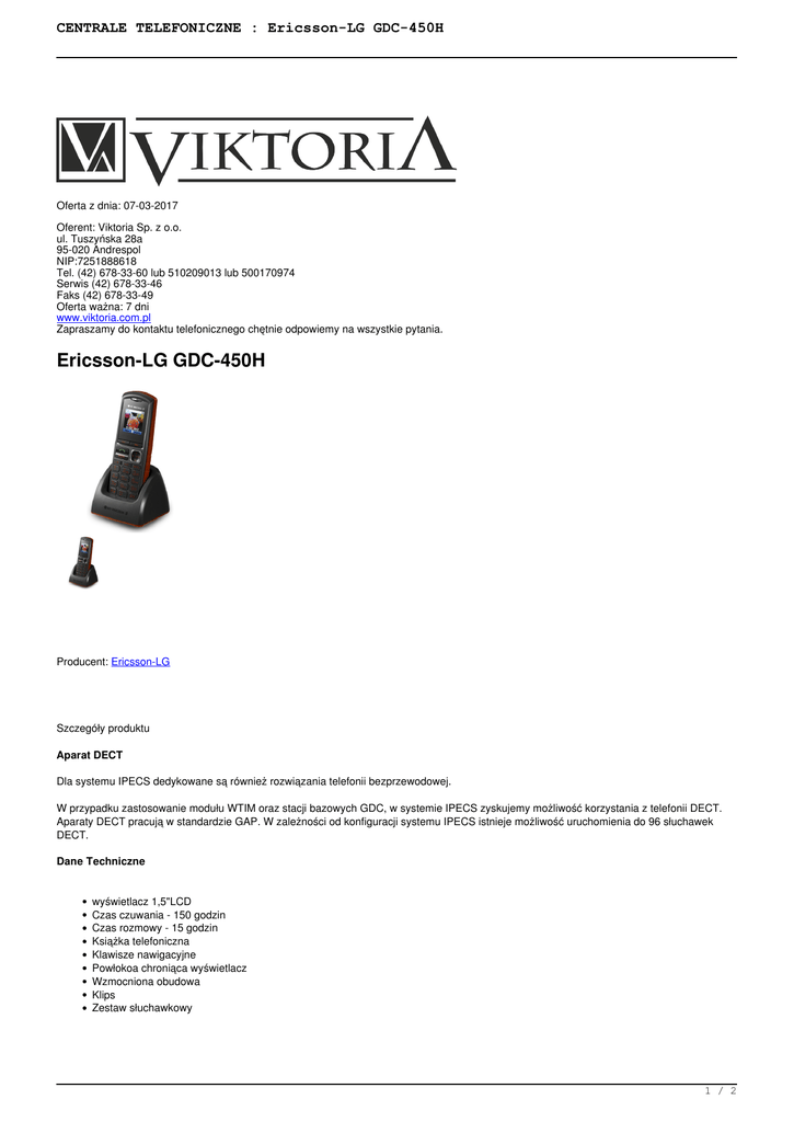 CENTRALE TELEFONICZNE : Ericsson-LG GDC-450H Oferta z dnia: 07-03-2017 Oferent: Viktoria Sp. z o.o. ul. Tuszyńska 28a 95-020 Andrespol NIP:7251888618 Tel. (42) 678-33-60 lub 510209013 lub 500170974 Serwis (42) 678-33-46 Faks (42) 678-33-49 Oferta ważna: 7 dni www.viktoria.com.pl Zapraszamy do kontaktu telefonicznego chętnie odpowiemy na wszystkie pytania. Ericsson-LG GDC-450H Producent: Ericsson-LG Szczegóły produktu Aparat DECT Dla systemu IPECS dedykowane są również rozwiązania telefonii bezprzewodowej. W przypadku zastosowanie modułu WTIM oraz stacji bazowych GDC, w systemie IPECS zyskujemy możliwość korzystania z telefonii DECT. Aparaty DECT pracują w standardzie GAP. W zależności od konfiguracji systemu IPECS istnieje możliwość uruchomienia do 96 słuchawek DECT. Dane Techniczne wyświetlacz 1,5"LCD Czas czuwania - 150 godzin Czas rozmowy - 15 godzin Książka telefoniczna Klawisze nawigacyjne Powłokoa chroniąca wyświetlacz Wzmocniona obudowa Klips Zestaw słuchawkowy 1 / 2 CENTRALE TELEFONICZNE : Ericsson-LG GDC-450H 2 / 2 Powered by TCPDF (www.tcpdf.org)