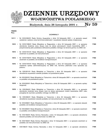 DZIENNIK URZĘDOWY WOJEWÓDZTWA PODLASKIEGO Białystok, dnia 26 listopada 2001 r. Nr 59 TREŚĆ: Poz.: UCHWAŁY 1 0 1 1 − Nr XXX/292/01 Rady Gminy Augustów z dnia 16 listopada 2001 r. w sprawie zasad ustalenia i poboru oraz terminów płatności i wysokości stawek opłaty miejscowej 7179 1012 − Nr XXVI/189/01 Rady Miejskiej w Rajgrodzie z dnia 23 listopada 2001 r. w sprawie obniżenia średniej ceny skupu żyta za okres pierwszych trzech kwartałów 2001 r. przyjmowanej jako podstawa obliczania podatku rolnego na terenie gminy na 2002 rok 7180 1013 − Nr XXVI/191/01 Rady Miejskiej w Rajgrodzie z dnia 23 listopada 2001 r. w sprawie zwolnień w podatku od nieruchomości 7181 1014 − Nr XXVI/192/01 Rady Miejskiej w Rajgrodzie z dnia 23 listopada 2001 r. w sprawie zwolnień w podatku od środków transportowych 7182 1015 − Nr XXVI/197/01 Rady Miejskiej w Rajgrodzie z dnia 23 listopada 2001 r. w sprawie ustalenia opłaty administracyjnej na 2002 rok, terminu płatności oraz sposobu jej poboru 7183 1016 − Nr XXI/201/01 Rady Miejskiej w Tykocinie z dnia 25 listopada 2001 r. w sprawie określenia wysokości stawek podatku od posiadania psów 7184 1017 − Nr XXI/202/01 Rady Miejskiej w Tykocinie z dnia 25 listopada 2001 r. w sprawie zwolnień w podatku od posiadania psów 7185 1018 − Nr XXI/203/01 Rady Miejskiej w Tykocinie z dnia 25 listopada 2001 r. w sprawie opłaty targowej 7186 1019 − Nr XXI/204/01 Rady Miejskiej w Tykocinie z dnia 25 listopada 2001 r. w sprawie obniżenia średniej ceny skupu żyta za okres pierwszych trzech kwartałów 2001 roku przyjętej do wymiaru podatku rolnego na 2002 rok 7187 1020 − Nr XXI/206/01 Rady Miejskiej w Tykocinie z dnia 25 listopada 2001 r. w sprawie określenia wysokości stawek podatku od nieruchomości na rok 2002 7188 1021 − Nr XXI/208/01 Rady Miejskiej w Tykocinie z dnia 25 listopada 2001 r. w sprawie stawek podatku od środków transportowych 7190 1022 − Nr XXI/209/01 Rady Miejskiej w Tykocinie z dnia 25 listopada 2001 r. w sprawie zwolnień w podatku od środków transportowych 7192 1023 − Nr XXI/183/01 Rady Gminy Narewka z dnia 12 listopada 2001 r. w sprawie określenia stawek podatku od nieruchomości na 2002 rok 7193 1024 − Nr XXI/184/01 Rady Gminy Narewka z dnia 12 listopada 2001 r. w sprawie zwolnień w podatku od nieruchomości na 2002 rok 7194 1025 − XXI/185/01 Rady Gminy Narewka z dnia 12 listopada 2001 r. w sprawie określenia 7195 Dziennik Urzędowy Województwa Podlaskiego Nr 59 ⎯ 7174 ⎯ Poz. wysokości stawek podatku od środków transportowych 1026 − Nr 157/XXXII/01 Rady Gminy Zambrów z dnia 20 listopada 2001 r. w sprawie stawek podatku od środków transportowych 7197 1027 − Nr 158/XXXII/01 Rady Gminy Zambrów z dnia 20 listopada 2001 r. w sprawie określenia wysokości stawek podatku od posiadania psów 7199 1028 − Nr XXI//127/01 Rady Gminy Filipów z dnia 21 listopada 2001 r. w sprawie obniżenia średniej ceny skupu żyta do celów obliczenia podatku rolnego 7200 1029 − Nr XXI/129/01 Rady Gminy Filipów z dnia 21 listopada 2001 r. w sprawie zwolnień w podatku od środków transportowych 7201 1030 − Nr XXIX/251/01 Rady Gminy Juchnowiec Kościelny z dnia 21 listopada 2001 r. w sprawie uchwalenia miejscowego planu zagospodarowania przestrzennego wyodrębnionych 7202 1031 − Nr XXIX/260/01 Rady Gminy Juchnowiec Kościelny z dnia 21 listopada 2001 r. w sprawie ustalenia stawek opłaty targowej 7207 1032 − Nr XXIX/261/01 Rady Gminy Juchnowiec Kościelny z dnia 21 listopada 2001 r. w sprawie ustalenia opłaty administracyjnej na 2002 r. terminu płatności oraz sposobu jej poboru 7208 1033 − Nr XXIX/264/01 Rady Gminy Juchnowiec Kościelny z dnia 21 listopada 2001 r. w sprawie stawek podatku od środków transportowych 7209 1034 − Nr XXIX/267/01 Rady Gminy Juchnowiec Kościelny z dnia 21 listopada 2001 r. w sprawie zwolnień w podatku od nieruchomości 7210 1035 − Nr XXVI/168/01 Rady Gminy w Augustowie z dnia 22 listopada 2001 r. w sprawie obniżenia średniej ceny skupu żyta za okres pierwszych trzech kwartałów 2001 roku przyjętej do wymiaru podatku rolnego na 2002 rok 7211 1036 − Nr XXVI/169/01 Rady Gminy w Augustowie z dnia 22 listopada 2001 r. w sprawie określenia wysokości stawek podatku od nieruchomości na 2002 rok 7212 1037 − Nr XXVI/170/01 Rady Gminy w Augustowie z dnia 22 listopada 2001 r. w sprawie zwolnień w podatku od nieruchomości 7213 1038 − Nr XXVI/172/01 Rady Gminy w Augustowie z dnia 22 listopada 2001 r. w sprawie zwolnień w podatku od nieruchomości 7214 1039 − Nr XXVI/173/01 Rady Gminy w Augustowie z dnia 22 listopada 2001 r. w sprawie określenia wysokości stawek podatku od posiadania psów 7215 1040 − Nr XXVI/174/01 Rady Gminy w Augustowie z dnia 22 listopada 2001 r. w sprawie zwolnienia mieszkańców gminy z podatku od posiadania psów 7216 1041 − Nr XXXI/170/01 Rady Gminy Hajnówka z dnia 22 listopada 2001 r. w sprawie określenia wysokości stawek podatku od nieruchomości na 2002 rok 7217 1042 − Nr XXXI/171/01 Rady Gminy Hajnówka z dnia 22 listopada 2001 r. w sprawie zwolnień w podatku od nieruchomości na 2002 rok o7218 1043 − Nr XXXI/173/01 Rady Gminy Hajnówka z dnia 22 listopada 2001 r. w sprawie zwolnień w podatku od środków transportowych 7219 Dziennik Urzędowy Województwa Podlaskiego Nr 59 ⎯ 7175 ⎯ Poz. 1044 − Nr XXXI/173/01 Rady Gminy Hajnówka z dnia 22 listopada 2001 r. w sprawie zwolnień w podatku od środków transportowych 7220 1045 − Nr XXXI/174/01 Rady Gminy Hajnówka z dnia 22 listopada 2001 r. w sprawie obniżenia średniej ceny skupu żyta za okres pierwszych trzech kwartałów 2001 roku przyjętej do wymiaru podatku rolnego na 2002 rok 7221 1046 − Nr XXXI/178/01 Rady Gminy Hajnówka z dnia 22 listopada 2001 r. w sprawie określenia wzoru deklaracji i wykazu nieruchomości 7222 1047 − Nr XXIV/168/01 Rady Gminy Płaska z dnia 22 listopada 2001 r. w sprawie opłaty administracyjnej 7228 1048 − Nr X