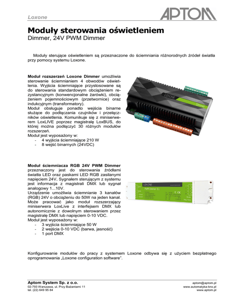 Loxone Moduły sterowania oświetleniem Dimmer, 24V PWM Dimmer Moduły sterujące oświetleniem są przeznaczone do ściemniania różnorodnych źródeł światła przy pomocy systemu Loxone. Moduł rozszerzeń Loxone Dimmer umożliwia sterowanie ściemnianiem 4 obwodów oświetlenia. Wyjścia ściemniające przystosowane są do sterowania standardowym obciążeniem rezystancyjnym (konwencjonalne żarówki), obciążeniem pojemnościowym (przetwornice) oraz indukcyjnym (transformatory). Moduł obsługuje ponadto wejścia binarne służące do podłączania czujników i przełączników oświetlenia. Komunikuje się z miniserwerem LoxLIVE poprzez magistralę LoxBUS, do której można podłączyć 30 różnych modułów rozszerzeń. Moduł jest wyposażony w: - 4 wyjścia ściemniające 210 W - 8 wejść binarnych (24VDC) Moduł ściemniacza RGB 24V PWM Dimmer przeznaczony jest do sterowania źródłami światła LED oraz paskami LED RGB zasilanymi napięciem 24V. Sygnałem sterującym z systemu jest informacja z magistrali DMX lub sygnał analogowy 1...10V. Urządzenie umożliwia ściemnianie 3 kanałów (RGB) 24V o obciążeniu do 50W na jeden kanał. Może pracować jako moduł rozszerzający miniserwera LoxLive z interfejsem DMX lub autonomicznie z dowolnym sterowaniem przez magistralę DMX lub napięciem 0-10 VDC. Moduł jest wyposażony w: - 3 wyjścia ściemniające 50 W - 2 wejścia 0-10 VDC (barwa, jasność) - 1 port DMX Konfigurowanie modułów do pracy z systemem Loxone odbywa się z użyciem bezpłatnego oprogramowania „Loxone configuration software”. Aptom System Sp. z o.o. 02-793 Warszawa, ul. Przy Bażantarni 11 tel. (22) 649 95 84 [email protected] www.automatyka-knx.pl www.aptom.pl Loxone Parametry techniczne: Moduł ściemniacza 24V PWM Dimmer Moduł ściemniacza Loxone Dimmer 12-24 V DC 24 V DC 6,3 A 60 mA 1 dioda LED 2 diody LED Wejścia 2 analogowe 0-10 VDC 8 binarnych 24 VDC Wyjścia 3 ściemniane, każde 50 W 4 ściemniane, każde 210 W Interfejsy DMX - zaciski LoxBUS - zaciski Temperatura 05 C - 40C 0 C - 55C Urządzenie Napięcie zasilania Pobór prądu Wskaźniki Wilgotność Montaż 20-80% bez kondensacji nawierzchniowy Obudowa Wymiary Masa Stopień ochrony Aptom System Sp. z o.o. 02-793 Warszawa, ul. Przy Bażantarni 11 tel. (22) 649 95 84 Szyna DIN 35 mm tw. sztuczne 185 x 45 x 20 mm 155 x 85 x 49 mm 100 g ok. 500 g IP20 [email protected] www.automatyka-knx.pl www.aptom.pl