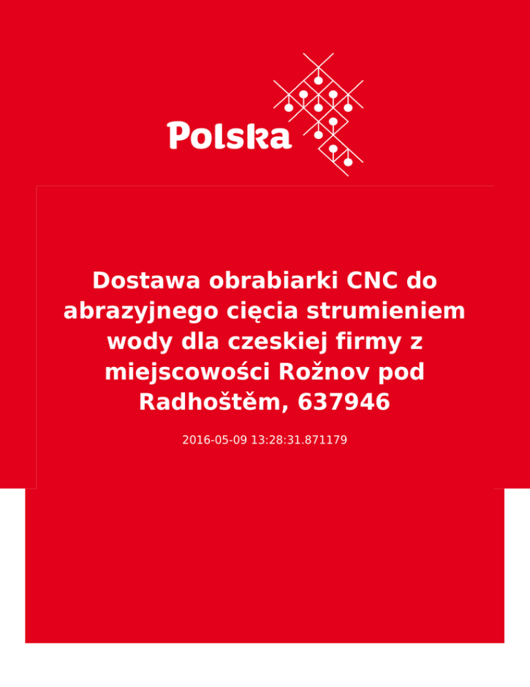 Dostawa obrabiarki CNC do abrazyjnego cięcia strumieniem wody dla czeskiej firmy z miejscowości Rožnov pod Radhoštěm, 637946 2016-05-09 13:28:31.871179 2 3 Tato nabídka nepředstavuje obchodní informace Adresa instituce / společnost vyhlašuje výběrové řízení STROZA s.r.o. 756 61 Rožnov pod Radhoštěm Bezručova 663/0 Czech Republic Kontaktní osoba Ing. Pavel Sasák [email protected] Tel: +420 603555834 www.profilzadavatele.cz/profil-zadavatele/STROZA-s-r-o-_3694/ Popis řádu CPV ● ● Industrial machinery Special-purpose machine tools Formulář tender Země Czech Republic 4 Webová adresa www.vestnikverejnychzakazek.cz/pl-PL/Form/Display/644397 Lhůta pro doručení nabídek 30.05.2016 Platnost od 09.05.2016 Odvětví Maszyny i urządzenia, 5