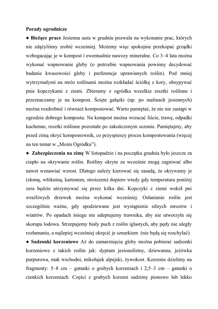 Porady ogrodnicze ● Bieżące prace Jesienna aura w grudniu pozwala na wykonanie prac, których nie zdążyliśmy zrobić wcześniej. Możemy więc spokojnie przekopać grządki wzbogacając je w kompost i ewentualnie nawozy mineralne. Co 3–4 lata można wykonać wapnowanie gleby (o potrzebie wapnowania powinny decydować badanie kwasowości gleby i preferencje uprawianych roślin). Pod mniej wytrzymałymi na mróz roślinami można rozkładać ściółkę z kory, obsypywać pnie kopczykami z ziemi. Zbieramy z ogródka wszelkie resztki roślinne i przeznaczamy je na kompost. Ścięte gałązki (np. po malinach jesiennych) można rozdrobnić i również kompostować. Warto pamiętać, że nic nie zastąpi w ogrodzie dobrego kompostu. Na kompost można wrzucać liście, trawę, odpadki kuchenne, resztki roślinne pozostałe po zakończonym sezonie. Pamiętajmy, aby przed zimą okryć kompostownik, co przyspieszy proces kompostowania (więcej na ten temat w „Moim Ogródku”). ● Zabezpieczenia na zimę W listopadzie i na początku grudnia było jeszcze za ciepło na okrywanie roślin. Rośliny okryte za wcześnie mogą zagniwać albo nawet wznawiać wzrost. Dlatego należy kierować się zasadą, że okrywamy je (słomą, włókniną, kartonem, stroiszem) dopiero wtedy gdy temperatura poniżej zera będzie utrzymywać się przez kilka dni. Kopczyki z ziemi wokół pni wrażliwych drzewek można wykonać wcześniej. Osłanianie roślin jest szczególnie ważne, gdy spodziewane jest wystąpienie silnych mrozów i wiatrów. Po opadach śniegu nie udeptujemy trawnika, aby nie utworzyła się skorupa lodowa. Strzepujemy biały puch z roślin iglastych, aby pędy nie uległy rozłamaniu, a najlepiej wcześniej okręcić je sznurkiem (nie będą się rozchylać). ● Sadzonki korzeniowe Aż do zamarznięcia gleby można pobierać sadzonki korzeniowe z takich roślin jak: dyptam jesionolistny, dziewanna, jeżówka purpurowa, mak wschodni, mikołajek alpejski, żywokost. Korzenie dzielimy na fragmenty: 5–8 cm – gatunki o grubych korzeniach i 2,5–3 cm – gatunki o cienkich korzeniach. Części z grubych korzeni sadzimy pionowo lub lekko skośnie, a z cienkich – poziomo do doniczek lub skrzynek z podłożem. Ważne jest, aby sadzonka zachowała orientację góra-dół. Sadzonki obficie podlewamy i ustawiamy w ciepłym miejscu. ● Sadzonki zdrewniałe Jeśli chcemy rozmnożyć krzewy, np. derenie, forsycje, jaśminowce, tawuły, pięciorniki, krzewuszki, możemy przygotować sadzonki z rocznych lub dwuletnich, dobrze zdrewniałych pędów o wykształconych pąkach. Sadzonki tniemy ostrym nożem na 10–30 cm odcinki, wiążemy w pęczki, etykietujemy i umieszczamy w piwnicy, zagłębione w wilgotnym piasku do 3/4 wysokości. Przechowujemy je tak aż do wiosny, kiedy to zostaną wysadzone. ● Duże w wersji mini Większość popularnych drzew osiąga zbyt duże rozmiary, aby można było posadzić je na działce. Powstało jednak wiele wolno rosnących odmian o atrakcyjnym pokroju i ulistnieniu, które osiągają znacznie mniejsze rozmiary. Często są to odmiany o parasolowatej lub kulistej koronie, o wysokości uzależnionej od miejsca szczepienia. Kto zatem marzy np. o lipie, buku, modrzewiu, brzozie na działce ma z czego wybierać! – zainteresowanym polecamy artykuł w grudniowym „Moim Ogródku”. ● Ozdobne w przechowalni Sprawdzamy stan przechowywanych karp dalii, bulw mieczyków, cebul. Usuwamy te suche lub z oznakami chorób. Podczas przechowywania ważna jest temperatura – optymalna to 5–10°C, a dla roślin balkonowych – 8–10°C. Rośliny podlewamy sporadycznie, aby nie dopuścić do przesuszenia korzeni. Przycinamy pędy suche i chore. ● Święta tuż, tuż Trudno sobie wyobrazić aby święta Bożego Narodzenia obyły się bez dekoracji. Pomysłów na nie jest wiele, a działka stanowi nieocenione źródło roślin, które można do tego wykorzystać. Z „Działkowca” można dowiedzieć się, jak „magicznie” udekorować świąteczny stół, zrobić mini choinkę z sosnowych szyszek, proste dekoracje z jabłek, wiszącą ozdobę na okno, efektowną świąteczną girlandę, stroiki, wianki na drzwi bądź wieńce na stół. Warto skorzystać z dostępnych materiałów i zainspirować się efektownymi, prostymi do wykonania aranżacjami – świąteczny efekt „murowany”! ● Choinka bez kłopotu Coraz częściej chcemy być „eko” i jako świąteczną dekorację wybieramy choinkę, którą później posadzimy na działce. Istnieje jednak duże ryzyko, że po wysadzeniu bardzo szybko zamieni się w potężnych rozmiarów drzewo. Wszystkim, którzy chcą kupić świąteczne drzewko, które zawsze pozostanie małe, polecamy artykuł „Choinka w miniaturze” w grudniowym „Działkowcu”. A jak dbać o drzewko w domu? Ziemia w doniczce powinna być wilgotna. Dobrze jest też ustawić w pobliżu pojemnik z wodą (zwiększy wilgotność powietrza). Nie należy trzymać choinki zbyt długo w mieszkaniu (rozhartuje się). Po Nowym Roku przenosimy ją na zewnątrz, zabezpieczmy donicę przed mrozem, podlewamy (zwłaszcza gdy jest ciepło i słonecznie). W czasie odwilży warto wkopać donicę do ziemi. ● Podlewanie zimozielonych Wiele gatunków roślin nawet w okresie zimowego spoczynku wymaga podlewania. Dotyczy to np. różaneczników, trzmieliny, bukszpanów. Zanim zamarznie gleba rośliny podlewamy regularnie i obficie, a później zabieg kontynuujemy w czasie odwilży. Dzięki temu nie ucierpią od suszy fizjologicznej i piękniejsze powitają nowy sezon. Więcej na ten temat – w „Działkowcu”. ● Pędzenie warzyw W domu na parapetach można rozpocząć pędzenie pietruszki, cebuli, szczypiorku. Ważne, aby zapewnić roślinom jak najwięcej światła. Aby „przełamać” spoczynek roślin cebulowych, można je moczyć w ciepłej wodzie (35–40°C) – odpowiednio cebula 3–4 godziny, 12 godzin szczypiorek. Wysiewamy sukcesywnie nasi
