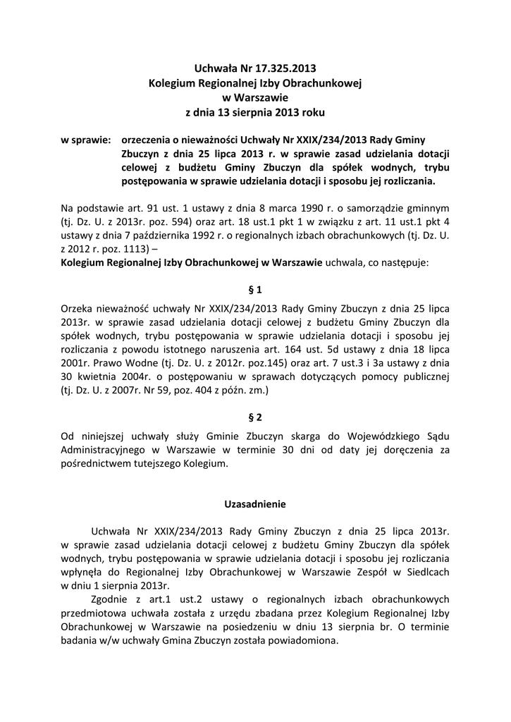 Uchwała Nr 17.325.2013 Kolegium Regionalnej Izby Obrachunkowej w Warszawie z dnia 13 sierpnia 2013 roku w sprawie: orzeczenia o nieważności Uchwały Nr XXIX/234/2013 Rady Gminy Zbuczyn z dnia 25 lipca 2013 r. w sprawie zasad udzielania dotacji celowej z budżetu Gminy Zbuczyn dla spółek wodnych, trybu postępowania w sprawie udzielania dotacji i sposobu jej rozliczania. Na podstawie art. 91 ust. 1 ustawy z dnia 8 marca 1990 r. o samorządzie gminnym (tj. Dz. U. z 2013r. poz. 594) oraz art. 18 ust.1 pkt 1 w związku z art. 11 ust.1 pkt 4 ustawy z dnia 7 października 1992 r. o regionalnych izbach obrachunkowych (tj. Dz. U. z 2012 r. poz. 1113) – Kolegium Regionalnej Izby Obrachunkowej w Warszawie uchwala, co następuje: §1 Orzeka nieważność uchwały Nr XXIX/234/2013 Rady Gminy Zbuczyn z dnia 25 lipca 2013r. w sprawie zasad udzielania dotacji celowej z budżetu Gminy Zbuczyn dla spółek wodnych, trybu postępowania w sprawie udzielania dotacji i sposobu jej rozliczania z powodu istotnego naruszenia art. 164 ust. 5d ustawy z dnia 18 lipca 2001r. Prawo Wodne (tj. Dz. U. z 2012r. poz.145) oraz art. 7 ust.3 i 3a ustawy z dnia 30 kwietnia 2004r. o postępowaniu w sprawach dotyczących pomocy publicznej (tj. Dz. U. z 2007r. Nr 59, poz. 404 z późn. zm.) §2 Od niniejszej uchwały służy Gminie Zbuczyn skarga do Wojewódzkiego Sądu Administracyjnego w Warszawie w terminie 30 dni od daty jej doręczenia za pośrednictwem tutejszego Kolegium. Uzasadnienie Uchwała Nr XXIX/234/2013 Rady Gminy Zbuczyn z dnia 25 lipca 2013r. w sprawie zasad udzielania dotacji celowej z budżetu Gminy Zbuczyn dla spółek wodnych, trybu postępowania w sprawie udzielania dotacji i sposobu jej rozliczania wpłynęła do Regionalnej Izby Obrachunkowej w Warszawie Zespół w Siedlcach w dniu 1 sierpnia 2013r. Zgodnie z art.1 ust.2 ustawy o regionalnych izbach obrachunkowych przedmiotowa uchwała została z urzędu zbadana przez Kolegium Regionalnej Izby Obrachunkowej w Warszawie na posiedzeniu w dniu 13 sierpnia br. O terminie badania w/w uchwały Gmina Zbuczyn została powiadomiona. W toku badania powyższej uchwały organ nadzoru stwierdził, że projekt badanej uchwały nie został przedłożony Prezesowi Urzędu Ochrony Konkurencji i Konsumentów oraz Ministrowi Rolnictwa, do czego zobowiązują przepisy art.164 ust.5d ustawy Prawo wodne oraz art. 7 ust.3 i ust.3a ustawy o postępowaniu w sprawach dotyczących pomocy publicznej. Wprawdzie spółki wodne, zgodnie z art.164 ust.1 i 2 ustawy Prawo wodne są formami organizacyjnymi, które nie działają z reguły w celu osiągnięcia zysków, to jednak mogą one zrzeszać także przedsiębiorców oraz prowadzić działalność mającą charakter gospodarczy. W tej sytuacji w przypadku gdy dotacja mogłaby stanowić pomoc publiczną lub de minimis, jej udzielenie następuje z uwzględnieniem warunków dopuszczalności tej pomocy określonych w przepisach UE. A zatem projekt badanej uchwały winien był być zgłoszony w trybie art.7 ust.3 ustawy o postępowaniu w sprawach dotyczących pomocy publicznej Prezesowi Urzędu Ochrony Konkurencji i Konsumentów w celu uzyskania ewentualnych sugestii i zastrzeżeń dotyczących przejrzystości zasad udzielania pomocy. Z tych samych powodów projekt powyższej uchwały winien był być zgłoszony do Ministra Rolnictwa w trybie art.7 ust.3a w/w ustawy z uwagi na fakt, że udzielenie dotacji może dotyczyć finansowania infrastruktury wodnej na terenach rolniczych. Brak powyższych konsultacji stanowi istotne naruszenie przytoczonych przepisów prawa. W tym stanie rzeczy Kolegium Regionalnej Izby Obrachunkowej w Warszawie postanowiło jak w sentencji uchwały. Przewodniczący Kolegium Wojciech Tarnowski