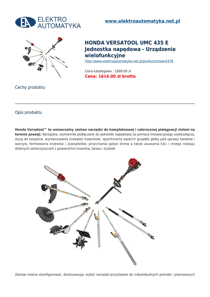 www.elektroautomatyka.net.pl HONDA VERSATOOL UMC 435 E Jednostka napędowa - Urządzenie wielofunkcyjne http://www.elektroautomatyka.net.pl/product/show/4378 Cena katalogowa : 1699.00 zł Cena: 1614.00 zł brutto Cechy produktu Opis produktu Honda Versatool™ to uniwersalny zestaw narzędzi do kompleksowej i całorocznej pielęgnacji zieleni na terenie posesji. Narzędzia, wymiennie podłączane do jednostki napędowej za pomocą innowacyjnego szybkozłącza, służą do koszenia, wyrównywania krawędzi trawników, spulchniania wąskich grządek gleby pod uprawy kwiatów i warzyw, formowania krzewów i żywopłotów, przycinania gałęzi drzew a także usuwania liści i innego rodzaju drobnych zanieczyszczeń z powierzchni trawnika, tarasu i ścieżek. Zestaw można skonfigurować, dostosowując wybór narzędzi-przystawek do indywidualnych potrzeb i planowanych czynności. Zobacz narzędzia w akcji: Honda Versatool™ jest wydajny, paliwo-oszczędny i wygodny w użytkowaniu nawet przez osoby bez doświadczenia w posługiwaniu się sprzętem mechanicznym. Dzięki zastosowanym rozwiązaniom technicznym Honda, zestaw jest także przyjazny dla otoczenia, zarówno dla samego użytkownika, pozostałych domowników jak i sąsiadów. Łatwy w konserwacji i w przechowywaniu – do każdego elementu dołączany jest specjalny haczyk, na którym można zawieszać narzędzie, zachowując ład i porządek w niewielkiej przestrzeni garażu czy komórki ogrodowej. Pełny zestaw Honda Versatool™ składa się z jednostki napędowej UMC435 E i 9 przystawek: 2 przedłużek (krótkiej i długiej), głowicy żyłkowej (wykaszarki), 2 modeli nożyc (długich i krótkich),podkrzesywarki, glebogryzarki, dmuchawy i krawędziarki. Szybkozłącze W zestawie Honda Versatool™ zastosowano innowacyjny i bardzo łatwy w użyciu sposób łączenia jednostki napędowej UMC 435 E z wybranym narzędziem - przystawką. Szybkozłącze Honda zapewnia błyskawiczną wymianę elementów zestawu, a mechanizm zatrzaskujący zapewnia niezawodność i bezpieczeństwo posługiwania się urządzeniem. Wygodne przechowywanie Pełny zestaw Honda Versatool™ w komplecie zawiera jednostkę napędową UMC 435 i 9 dodatkowych elementów. Cały zestaw został tak zaprojektowany i wykonany, by przede wszystkim był niezawodny, przyjazny dla otoczenia, zapewniał efektywne i wygodne wykonywanie prac, ale również był łatwy w przechowywaniu. W zestawie każdy element ma odrębny haczyk, na którym można bezpiecznie zawiesić przystawkę jak i jednostkę napędową, zachowując ład i porządek przestrzeni. Kompletny zestaw zajmuje niewielką część ściany garażu czy ogrodowej komórki. UMC 435 E - JEDNOSTKA NAPĘDOWA Hon da UMC 435 E jest jedn ostk ą napę dow ą zest awu Hon da Vers atool ™, do któr ej podł ącza ne są pozo stałe narz ędzi a. Wyp osaż ona jest w wyd ajny 4-su wow y silnik spali now y Hon da GX3 5 o moc y mak sym alnej 1,3K M. Ten jedn ocyli ndro wy górn o zawo rowy i chło dzon y powi etrze m silnik jest najle pszy m silnik iem w swoj ej klasi e i jedn ym z najlż ejszy ch na świe cie. Speł nia najb ardzi ej restr ykcyj ne nor my obo wiąz ując e w Unii Euro pejs kiej oraz USA. Pozi om emit owa nyc h spal in jest o 85% niżs zy od tego wyd ziel ane go prze z klas yczn e urzą dze nia z silni kie m 2-su wow ym, dzię ki cze mu użyt kow nik nie jest nara żony na wdyc hani e zani eczy szcz oneg o powi etrza. Silni k prac uje na czyst ej bezo łowio wej benz ynie (etyli na 95 Pb) i zuży wa jej oraz oleju mnie j niż silnik i 2-su wow e o podo bnej moc y (2/3 benz yny i 1/7 oleju) . Dod atko wo, GX3 5 ma najn iższ yw swoj ej klas ie pozi om wibr acji, który jest bard ziej przyj azny dla użyt kow nika, zwła szcz a podc zas wydł użon ego czas u ciągł ej prac yw ogro dzie. Dźwi ęk gene rowa ny prze z silnik z niski m pozi ome m wibr acji jest mnie j uciąż liwy czy draż niąc y dla ucha. Zast osow any w silnik u syst em smar owa nia olejo weg o pow oduj e pows tawa nie mgie łki olejo wej w skrz yni korb owej, smar ując ej zesp ół tłokcylin der co umo żliwi a prac ę oraz prze cho wyw anie urzą dze nia dosł own ie w każ dej poz ycji. Erg ono micz ne uch wyty zape wnia ją wyg odne i bezp ieczn e wyko nyw anie prac y. D A N E T E C H NI C Z N E: 1. 2. 3. 4. 5. 6. Typ silnika: 4-suwowy Honda GX 35 Moc maksymalna silnika: 1,3 KM Rodzaj paliwa: etylina 95 Pb Głośność: 109dB(A Wymiary (dł. x szer. x wys.): 114,5 x 31,5 x 25,8 cm Masa: 6,4kg ELEKTRO-AUTOMATYKA Sprzedaż elektronarzędzi, urządzeń spawalniczych, maszyn budowlanych, pneumatyki, narzędzi warsztatowych, firmowych ubrań roboczych oraz maszyn ogrodowo leśnych. Sklep Bochnia ul. Brzeska 50 32-700 Bochnia Sklep Brzesko ul. Szarych Szeregów 23 32-800 Brzesko Serwis, Magazyn ul. Św. Brata Alberta 4 32-800 Brzesko tel. 691 572 333 e-mail: [email protected] tel. 609 523 230 e-mail: [email protected] tel. 609 523 645 e-mail: [email protected]