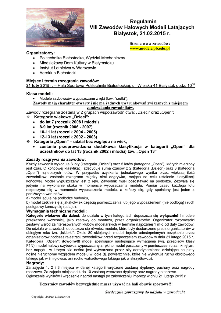 Regulamin VIII Zawodów Halowych Modeli Latających Białystok, 21.02.2015 r. Strona www zawodów: www.modele.pb.edu.pl Organizatorzy: Politechnika Białostocka, Wydział Mechaniczny Młodzieżowy Dom Kultury w Białymstoku Instytut Lotnictwa w Warszawie Aeroklub Białostocki Miejsce i termin rozegrania zawodów: 21 luty 2015 r. – Hala Sportowa Politechniki Białostockiej, ul. Wiejska 41 Białystok godz. 1000 Klasa modeli: Modele szybowców wypuszczane z ręki (tzw. ”rzutki”); Zawody mają charakter otwarty i nie ma żadnych uwarunkowań związanych z miejscem zamieszkania zawodników. Zawody rozegrane zostaną w 2 grupach współzawodnictwa: „Dzieci” oraz „Open”: Kategorie wiekowe „Dzieci”: do lat 7 (rocznik 2008 i młodsi) 8-9 lat (rocznik 2006 - 2007) 10-11 lat (rocznik 2004 - 2005) 12-13 lat (rocznik 2002 - 2003) Kategoria „Open” – udział bez względu na wiek, zostanie przeprowadzona dodatkowa klasyfikacja w kategorii „Open” dla uczestników do lat 13 (rocznik 2002 i młodsi) tzw. „Open 13” Zasady rozgrywania zawodów: Każdy zawodnik wykonuje 3 loty (kategoria „Dzieci”) oraz 5 lotów (kategoria „Open”), których mierzony jest czas. O końcowej klasyfikacji zdecyduje suma czasów z 2 (kategoria „Dzieci”) oraz 3 (kategoria „Open”) najlepszych lotów. W przypadku uzyskania jednakowego wyniku przez większą ilość zawodników, zostanie rozegrana między nimi dogrywka, mająca na celu ustalenie klasyfikacji końcowej. Model wypuszczany jest z ręki. Zawodnik musi pozostawać na podłodze. Zezwala się jedynie na wykonanie skoku w momencie wypuszczania modelu. Pomiar czasu każdego lotu rozpoczyna się w momencie wypuszczenia modelu, a kończy się, gdy spełniony jest jeden z poniższych warunków: a) model ląduje na podłodze budynku, b) model zetknie się z jakąkolwiek częścią pomieszczenia lub jego wyposażeniem (nie podłogą) i ruch postępowy kończy się (ustaje). Wymagania techniczne modeli: Kategorie wiekowe dla dzieci: do udziału w tych kategoriach dopuszcza się wyłącznie!!! modele przekazane wcześniej, jako zestawy do montażu, przez organizatorów. Organizator rozprowadzi zestawy wśród zainteresowanych klubów modelarskich w terminie najpóźniej 1 m-c od daty zawodów. Do udziału w zawodach dopuszcza się również modele, które były dostarczone przez organizatorów w ubiegłym roku tzn. „Iskierki”. Około 80 sklejonych modeli będzie udostępnionych bezpłatnie przez organizatorów podczas rejestracji zawodników przed rozpoczęciem zawodów w dniu 21 lutego 2015 r. Kategoria „Open”: dowolny!!! model spełniający następujące wymagania (wg. przepisów klasy F1N): model halowy szybowca wypuszczany z ręki to model puszczany w pomieszczeniu zamkniętym, bez napędu, w którym siła nośna jest wytwarzana przez siły aerodynamiczne działające na płaty nośne nieruchome względem modelu w locie (tj. powierzchnie, które nie wykonują ruchu obrotowego takiego jak w śmigłowcu, ani ruchu wahadłowego takiego jak w skrzydłowcu). Nagrody: Za zajęcie 1, 2 i 3 miejsca w danej kategorii wręczone zostaną dyplomy, puchary oraz nagrody rzeczowe. Za zajęcie miejsc od 4 do 10 zostaną wręczone dyplomy oraz nagrody rzeczowe. Ogłoszenie wyników i wręczenie nagród nastąpi po zakończeniu imprezy w dniu 21 lutego 2015 r. Uczestnicy zawodów bezwzględnie muszą używać na hali obuwie sportowe!!! Serdecznie zapraszamy do udziału w zawodach! Copyright: Andrzej Łukaszewicz