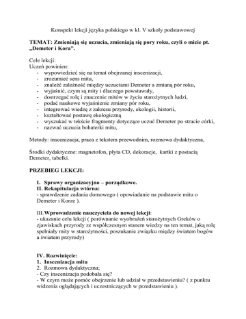 Konspekt lekcji języka polskiego w kl. V szkoły podstawowej TEMAT: Zmieniają się uczucia, zmieniają się pory roku, czyli o micie pt. „Demeter i Kora”. Cele lekcji: Uczeń powinien: - wypowiedzieć się na temat obejrzanej inscenizacji, - zrozumieć sens mitu, - znaleźć zależność między uczuciami Demeter a zmianą pór roku, - wyjaśnić, czym są mity i dlaczego powstawały, - dostrzegać rolę i znaczenie mitów w życiu starożytnych ludzi, - podać naukowe wyjaśnienie zmiany pór roku, - integrować wiedzę z zakresu przyrody, ekologii, historii, - kształtować postawę ekologiczną - wyszukać w tekście fragmenty dotyczące uczuć Demeter po stracie córki, - nazwać uczucia bohaterki mitu, Metody: inscenizacja, praca z tekstem przewodnim, rozmowa dydaktyczna, Środki dydaktyczne: magnetofon, płyta CD, dekoracje, kartki z postacią Demeter, tabelki. PRZEBIEG LEKCJI: I. Sprawy organizacyjno – porządkowe. II. Rekapitulacja wtórna: - sprawdzenie zadania domowego ( opowiadanie na podstawie mitu o Demeter i Korze ). III. Wprowadzenie nauczyciela do nowej lekcji: - ukazanie celu lekcji ( porównanie wyobrażeń starożytnych Greków o zjawiskach przyrody ze współczesnym stanem wiedzy na ten temat, jaką rolę spełniały mity w starożytności, poszukanie związku między światem bogów a światem przyrody) IV. Rozwinięcie: 1. Inscenizacja mitu 2. Rozmowa dydaktyczna; - Czy inscenizacja podobała się? - W czym może pomóc obejrzenie lub udział w przedstawieniu? ( z punktu widzenia oglądających i uczestniczących w przedstawieniu ). - O jakim zjawisku przyrody opowiada ten mit? - W jaki sposób starożytni Grecy tłumaczyli zmianę pór roku? - Jaka była zależność między uczuciami Demeter a porą roku? - Odczytajcie fragment, który mówi o tej zależności. Pory roku zmieniały się w zależności od uczuć Demeter, bogini urodzaju, która czuła radość , gdy jej córka była z nią i smutek , kiedy Kora schodziła do Hadesu. („Od owego czasu co roku na wiosnę Ziemia – Demeter stroi się w szaty radosne na powitanie swej córki, a późną jesienią, gdy ma ją stracić, płacze deszczem i szarugą nad swą dolą.”). 3. Zapisanie tematu lekcji: Zmieniają się uczucia, zmieniają się pory roku, czyli o micie pt. Demeter i Kora”. 4. Koło zmian (narysujcie i wpiszcie pory roku UCZUCIA DEMETER = ZMIANY PÓR ROKU 5. Odczytajcie fragmenty mówiące o uczuciach Demeter, kiedy jej córka schodzi do Hadesu i nazwijcie je. ( uczniowie wpisują do schematu przy polach : jesień , zima). Boleść, żal, smutek, tęsknota, nadzieja. 6. Odczytajcie fragmenty mówiące o uczuciach Demeter, kiedy Kora powraca do niej na Ziemię i nazwijcie je. ( Po odczytaniu i nazwaniu uczuć Demeter uczniowie wpisują je do schematu w polach: wiosna, lato ). Radość, szczęście, zadowolenie. 7. Uzupełnijcie rysunek z postacią Demeter: - wpiszcie rzeczowniki z określeniami bogini obok rysunku - w punkcie a) określenia bogini - w punkcie b) nazwy jej uczuć i przeżyć 8. Rozmowa dydaktyczna: - Dlaczego starożytni wymyślali takie fantastyczne historie? - Co to jest mit? Jaką rolę spełniał mit w starożytności? - W jaki sposób współczesne nauki przyrodnicze wyjaśniają zjawisko zmiany pór roku? ( encyklopedia, rozdać skserowany rysunek ). - Kto w przeszłości odkrył, że Ziemia krąży wokół Słońca? - Kto w starożytnym Rzymie zreformował kalendarz? - Czy dzisiaj klimat się zmienia? - Co powoduje zmiany klimatyczne na Ziemi? ( na podstawie wiadomości, obserwacji, jak powinniśmy dbać o Ziemię) 9. Zapisanie wniosku z lekcji. Starożytni Grecy sądzili, że pory roku zmieniają się w zależności od uczuć Demeter, bogini urodzaju. Wiosną i latem matka cieszy się, że ma córkę przy sobie, dlatego przyroda rozkwita. Jesienią i zimą, gdy Kora przebywa w Hadesie, jej matka jest smutna, więc dookoła panuje szaruga. Wymyślając mity, Grecy próbowali wyjaśnić niezrozumiałe zjawiska przyrody. Nie dysponowali zdobyczami współczesnej wiedzy, która tłumaczy zmianę pór roku ruchem Ziemi wokół Słońca i nachyleniem osi ziemskiej do płaszczyzny orbity. ( rysunek ) V. Rekapitulacja pierwotna: - Podsumowanie zajęć. VI. Zadanie domowe: Uzupełnij rysunek przedstawiający Demeter określeniami dotyczącymi jej wyglądu. Napisz list do Kory w imieniu Demeter, która jej poszukuje. ( do zeszytu na środę). VII. Ocena uczniów. Dodatkowa tabelka z określeniami do uczuć Demeter ( praca ze słownikiem wyrazów bliskoznacznych ): Uczucia i przeżycia Demeter boleść żal smutek tęsknota rozpacz gniew ból Określenia uczuć i przeżyć Głęboka, ciężka, niewysłowiona, milcząca, obezwładniająca Głuchy, nieutulony, niezmierny, ściska serce, umierać z żalu Cichy, nieustanny, nieznośny, pogrążyć się w smutku, smutek ogarnia Glęboka, niezmierzona, usychać z tęsknoty, niewysłowiona Ciężka, beznadziejna, nieopisana, wypełnia serce Słuszny, gwałtowny, płonąć gniewem, wybuchnąć gniewem Dotkliwy, ostry, przeszywa serce, obezwladnia