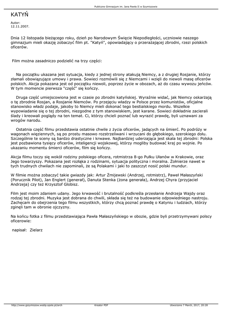 Publiczne Gimnazjum im. Jana Pawła II w Szymiszowie KATYŃ Autor: 12.11.2007. Dnia 12 listopada bieżącego roku, dzień po Narodowym Święcie Niepodległości, uczniowie naszego gimnazjum mieli okazję zobaczyć film pt. "Katyń", opowiadający o przerażającej zbrodni, rzezi polskich oficerów. Film można zasadniczo podzielić na trzy części: Na początku ukazana jest sytuacja, kiedy z jednej strony atakują Niemcy, a z drugiej Rosjanie, którzy złamali obowiązujące umowy i prawa. Sowieci rozmówili się z Niemcami i wzięli do niewoli masę oficerów polskich. Akcja pokazana jest od początku niewoli, poprzez życie w obozach, aż do czasu wywozu jeńców. W tym momencie pierwsza "część" się kończy. Druga część umiejscowiona jest w czasie po zbrodni katyńskiej. Wyraźnie widać, jak Niemcy oskarżają o tę zbrodnie Rosjan, a Rosjanie Niemców. Po przejęciu władzy w Polsce przez komunistów, oficjalne stanowisko władz podaje, jakoby to Niemcy mieli dokonać tego bestialskiego mordu. Wszelkie wypowiadanie się o tej zbrodni, niezgodne z tym stanowiskiem, jest karane. Sowieci dokładnie zacierali ślady i kreowali poglądy na ten temat. Ci, którzy chcieli poznać lub wyrazić prawdę, byli uznawani za wrogów narodu. Ostatnia część filmu przedstawia ostatnie chwile z życia oficerów, jadących na śmierć. Po podróży w wagonach więziennych, są po prostu masowo rozstrzeliwani i wrzucani do głębokiego, szerokiego dołu. Szczególnie te sceny są bardzo drastyczne i krwawe. Najbardziej uderzająca jest skala tej zbrodni: Polska jest pozbawiona tysięcy oficerów, inteligencji wojskowej, którzy mogliby budować kraj po wojnie. Po ukazaniu momentu śmierci oficerów, film się kończy. Akcja filmu toczy się wokół rodziny polskiego oficera, rotmistrza 8-go Pułku Ułanów w Krakowie, oraz Jego towarzyszy. Pokazana jest rozłąka z rodzinami, sytuacja polityczna i moralna. Żołnierze nawet w tych trudnych chwilach nie zapominali, że są Polakami i jaki to zaszczyt nosić polski mundur. W filmie można zobaczyć takie gwiazdy jak: Artur Żmijewski (Andrzej, rotmistrz), Paweł Małaszyński (Porucznik Pilot), Jan Englert (generał), Danuta Stenka (żona generała), Andrzej Chyra (przyjaciel Andrzeja) czy też Krzysztof Globisz. Film jest moim zdaniem udany. Jego krwawość i brutalność podkreśla przesłanie Andrzeja Wajdy oraz rodzaj tej zbrodni. Muzyka jest dobrana do chwili, składa się też na budowanie odpowiedniego nastroju. Zachęcam do obejrzenia tego filmu wszystkich, którzy chcą poznać prawdę o Katyniu i ludziach, którzy zginęli tam w obronie ojczyzny. Na końcu fotka z filmu przedstawiająca Pawła Małaszyńskiego w obozie, gdzie byli przetrzymywani polscy oficerowie: napisał: Zielarz http://www.gszymiszow.wodip.opole.pl/arch Kreator PDF Utworzono 7 March, 2017, 20:28