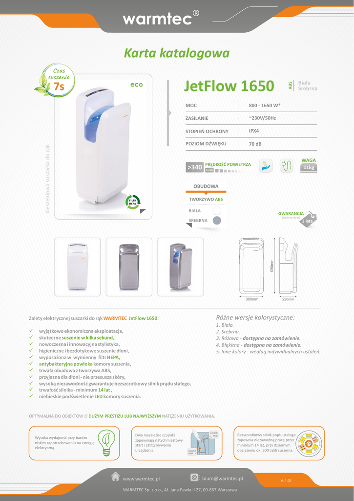 Karta katalogowa eco kieszeniowa suszarka do rąk 7s JetFlow 1650 ABS Czas suszenia MOC 800 - 1650 W* ZASILANIE ~230V/50Hz STOPIEŃ OCHRONY IPX4 POZIOM DŹWIĘKU 70 dB >340 Biała Srebrna WAGA 11kg PRĘDKOŚĆ POWIETRZA km/h OBUDOWA TWORZYWO ABS BIAŁA GWARANCJA (door-to-door) 3 lata 690mm SREBRNA 300mm Różne wersje kolorystyczne: Zalety elektrycznej suszarki do rąk WARMTEC JetFlow 1650: ü ü ü ü ü ü ü ü ü ü ü 220mm 1. Biała. 2. Srebrna. 3. Różowa - dostępna na zamówienie. 4. Błękitna - dostępna na zamówienie. 5. Inne kolory - według indywidualnych ustaleń. wyjątkowo ekonomiczna eksploatacja, skuteczne suszenie w kilka sekund, nowoczesna i innowacyjna stylistyka, higieniczne i bezdotykowe suszenie dłoni, wyposażona w wymienny filtr HEPA, antybakteryjna powłoka komory suszenia, trwała obudowa z tworzywa ABS, przyjazna dla dłoni - nie przesusza skóry, wysoką niezawodność gwarantuje bezszczotkowy silnik prądu stałego, trwałość silnika - minimum 14 lat , niebieskie podświetlenie LED komory suszenia. OPTYMALNA DO OBIEKTÓW O DUŻYM PRESTIŻU LUB NAJWYŻSZYM NATĘŻENIU UŻYTKOWANIA. Wysoka wydajność przy bardzo niskim zapotrzebowaniu na energię elektryczną. Dwa niezależne czujniki zapewniają natychmiastowy start i zatrzymywanie urządzenia. www.warmtec.pl Czujnik stop Czujnik start Bezszczotkowy silnik prądu stałego zapewnia niezawodną pracę przez minimum 14 lat, przy dziennym obciążeniu ok. 500 cykli suszenia. [email protected] WARMTEC Sp. z o.o., Al. Jana Pawła II 27, 00-867 Warszawa V. 1.01