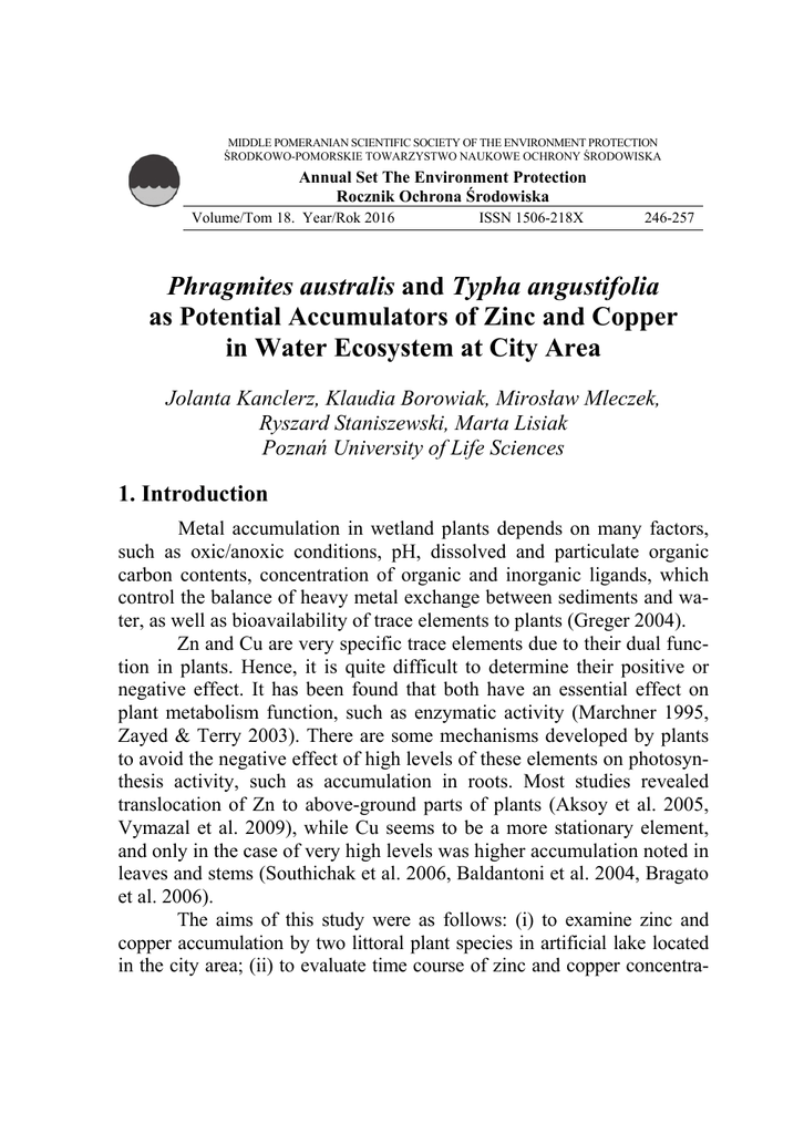 MIDDLE POMERANIAN SCIENTIFIC SOCIETY OF THE ENVIRONMENT PROTECTION ŚRODKOWO-POMORSKIE TOWARZYSTWO NAUKOWE OCHRONY ŚRODOWISKA Annual Set The Environment Protection Rocznik Ochrona Środowiska Volume/Tom 18. Year/Rok 2016 ISSN 1506-218X 246-257 Phragmites australis and Typha angustifolia as Potential Accumulators of Zinc and Copper in Water Ecosystem at City Area Jolanta Kanclerz, Klaudia Borowiak, Mirosław Mleczek, Ryszard Staniszewski, Marta Lisiak Poznań University of Life Sciences 1. Introduction Metal accumulation in wetland plants depends on many factors, such as oxic/anoxic conditions, pH, dissolved and particulate organic carbon contents, concentration of organic and inorganic ligands, which control the balance of heavy metal exchange between sediments and water, as well as bioavailability of trace elements to plants (Greger 2004). Zn and Cu are very specific trace elements due to their dual function in plants. Hence, it is quite difficult to determine their positive or negative effect. It has been found that both have an essential effect on plant metabolism function, such as enzymatic activity (Marchner 1995, Zayed & Terry 2003). There are some mechanisms developed by plants to avoid the negative effect of high levels of these elements on photosynthesis activity, such as accumulation in roots. Most studies revealed translocation of Zn to above-ground parts of plants (Aksoy et al. 2005, Vymazal et al. 2009), while Cu seems to be a more stationary element, and only in the case of very high levels was higher accumulation noted in leaves and stems (Southichak et al. 2006, Baldantoni et al. 2004, Bragato et al. 2006). The aims of this study were as follows: (i) to examine zinc and copper accumulation by two littoral plant species in artificial lake located in the city area; (ii) to evaluate time course of zinc and copper concentra- Phragmites australis and Typha angustifolia as Potential Accumulators… 247 tions in water and selected plant species during the growing season; (iii) to examine the translocation of analysed trace elements in the plant organs. 2. Materials and methods Characteristics of survey site According to the physical and geographical classification of Poland, the Cybina river lies in Wielkopolska Lakeland (Kondracki 2009). This river is a third order river, and the right tributary of the Warta river. The river catchment area is 190.61 km2 (Fig. 1). According to the code system of the European Union, the river received the code 1858 (Czarnecka 2005). Fig. 1. Cybina river catchment with labeled investigation sites Rys. 1. Zlewnia rzeki Cybiny wraz z zaznaczonymi punktami pomiarowokontrolnymi Malta Lake is located in the lower part of the Cybina catchment. The reservoir covers a maximal area of 65.5 ha, with a length of 2.2 km, which makes it the biggest artificial water reservoir in the city of Poznan. The mean depth is over 3.13 m, while the maximum is 5 m. This water reservoir was built for water sports, active and passive recreation and fire-protection purposes (Bogucki & Staniewska-Zątek 1996). Once eve- 248 Jolanta Kanclerz et al. ry four years the water is drained and the lake is deepened together with conservation activities. Collection of samples The water samples were analysed from three sites – along the Cybina river course (inflow and outflow of Malta Lake) and from Malta Lake (Fig. 1). Measurements were performed every month from April to September, excluding July. Plants were collected only from the lake area at the beginning and at the end of the growing season – in May and September. Common reed (Phragmites australis Cav. Trin ex. Steudel) and narrow-leaved cattail (Typha angustifolia L.) were chosen for heavy metal concentration investigations. Five plants of each species were selected, and divided into plant organs. In the case of Phragmites australis three plant organs, rhizomes, stem and leaves, while from Typha angustifolia rhizomes and leaves were collected. The water and plant zinc and copper analysis were performed according methodology previously described by Borowiak et al. (2016). Accumulation and translocation indices The follow indexes were calculate to analysed water and plant contamination, bioaccumulation and translocation in plant organs. The contamination factor was calculated as follows: (1) where Ci is the mean concentration of substance in water, and Cn i is the reference level for the substance. The following criteria are used to describe the values of the contamination factor: Cfi < 1, low contamination factor (LCF); 1 ≤ Cfi < 3 moderate contamination factors (MCF); 3 ≤ Cfi < 6, considerable contamination factors (CCF); and Cfi ≥ 6, very high contamination factor (VHCF) (Zarei et al. 2014). The accumulation efficiency of analysed trace elements in plant organs was described using bioaccumulation factor (BAF) values calculated according to Cohen et al. (1998) as the ratio of a trace element concentration in individual plant (rhizomes, stems and leaves) organs and trace element concentrations in water: Phragmites australis and Typha angustifolia as Potential Accumulators… 249 μ μ (2) BAF values greater than 1 indicate accumulation, while those lower than one indicate a lack of accumulation. Additionally, in order to describe trace elements’ transport from water to the plants, the translocation factor (TF) was calculated according to Yu & Zhou (2009) applying the following formula: μ μ (3) Wherein TF>1 indicates that the plant translocates metals effectively. Statistical analyses employed STATISTICA 9.1. Results were analyzed with factorial ANOVA, with period, site and plant species as fixed factors. Tukey's test was used to analyze the differences between measured parameters. For determination of structure and rules in the relations between variables, principal component analysis (PCA) was used. In this analysis, the orthogonal transformation of observed variables to a new set of non-correlated variables (comp