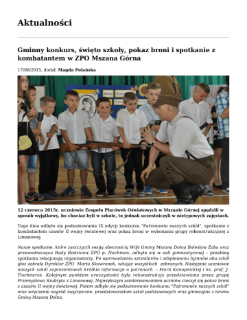 Aktualności Gminny konkurs, święto szkoły, pokaz broni i spotkanie z kombatantem w ZPO Mszana Górna 17/06/2015, dodał: Magda Polańska 12 czerwca 2015r. uczniowie Zespołu Placówek Oświatowych w Mszanie Górnej spędzili w sposób wyjątkowy, bo chociaż byli w szkole, to jednak uczestniczyli w nietypowych zajęciach. Tego dnia odbyło się podsumowanie IX edycji konkursu "Patronowie naszych szkół", spotkanie z kombatantem czasów II wojny światowej oraz pokaz broni w wykonaniu grupy rekonstrukcyjnej z Limanowej. Nasze spotkanie, które zaszczycili swoją obecnością Wójt Gminy Mszana Dolna Bolesław Żaba oraz przewodnicząca Rady Rodziców ZPO p. Nachman, odbyło się w sali gimnastycznej – przebieg spotkania relacjonują organizatorzy. Po wprowadzeniu sztandarów i odśpiewaniu hymnów obu szkół głos zabrała Dyrektor ZPO Marta Skowronek, witając wszystkich zebranych. Następnie uczniowie naszych szkół zaprezentowali krótkie informacje o patronach - Marii Konopnickiej i ks. prof. J. Tischnerze. Kolejnym punktem uroczystości była rekonstrukcja przedstawiona przez grupę Przemysława Szubryta z Limanowej. Największym zainteresowaniem uczniów cieszył się pokaz broni z czasów II wojny światowej. Potem odbyło się podsumowanie konkursu "Patronowie naszych szkół" oraz wręczenie nagród zwycięzcom- przedstawicielom szkół podstawowych oraz gimnazjów z terenu Gminy Mszana Dolna. Celem tego konkursu było upowszechnienie wiedzy o życiu, działalności, twórczości patronów szkół gminnych, propagowanie ich postaci jako realnych wzorców osobowych, rozwijanie myślenia twórczego uczniów oraz ich uzdolnień plastycznych. Udział w IX edycji konkursu polegał na przygotowaniu plakatu propagującego postać patrona. Wzięło w nim udział 48 uczniów z 16 szkół z terenu gminy Mszana Dolna. Komisja konkursowa pod przewodnictwem Anny Mrózek-Kotarskiej, nauczycielki plastyki w ZPO w Mszanie Górnej, oceniła prace w 3 kategoriach: klasy I-III i IV-VI szkoła podstawowa oraz klasy I-III gimnazjum. Nagrodzono 16 prac i przyznano 6 wyróżnień. Pierwsze miejsce w kategorii klas I-III zajęła praca Gabrieli Czerwińskiej ze Szkoły Podstawowej nr 2 w Lubomierzu prezentująca św. Stanisława Kostkę. Drugie miejsce przyznano pracy Marii Szybiak ze Szkoły Podstawowej w Rabie Niżnej. Trzy trzecie miejsca zajęły plakaty wykonane przez Katarzynę Niżnik ze Szkoły Podstawowej w Rabie Niżnej, Weronikę Kołodziejczyk ze Szkoły Podstawowej nr 1 w Lubomierzu oraz Gabrielę Oleksy reprezentującą Szkołę Podstawową w Glisnem. Ponadto przyznano wyróżnienie Natalii Wojtyczce ze Szkoły Podstawowej nr 2 w Lubomierzu. W kategorii klas IV-VI szkoły podstawowej przyznano dwa równorzędne pierwsze miejsca. Nagrodzeni to Kinga Adamczyk ze Szkoły Podstawowej nr 1 w Lubomierzu za wykonany ciekawą techniką plakat św. Józefa oraz Kamil Sobuń ze Szkoły Podstawowej nr 2 w Mszanie Górnej za pracę poświęconą postaci Kazimierza Przerwy-Tetmajera. Drugie miejsce zajęły plakaty Jessiki Potaczek ze Szkoły Podstawowej nr 1 w Lubomierzu oraz Amelii Białoń ze Szkoły Podstawowej nr 1 w Mszanie Górnej. Przyznano trzy trzecie miejsca za prace wykonane przez Agnieszkę Rzepkę ze Szkoły Podstawowej w Olszówce, Patrycję Bożek ze Szkoły Podstawowej nr 2 w Lubomierzu oraz Agatę Potaczek ze Szkoły Podstawowej w Rabie Niżnej. W tej kategorii wyróżniono afisze Adama Kowalczyka i Sylwii Ceklarz ze Szkoły Podstawowej w Kasinie Wielkiej oraz Joanny Ptaszkowskiej ze Szkoły Podstawowej nr 2 w Kasince Małej. W kategorii gimnazjum pierwsze miejsce zajęła praca Adriany Gil z Gimnazjum nr 3 w Rabie Niżnej propagująca postać Jana Pawła II. Drugie miejsce przyznano Mateuszowi Dudzikowi z Gimnazjum nr 4 w Mszanie Górnej, trzecie zdobyły prace Aleksandry Kowalczyk z Gimnazjum nr 1 w Kasinie Wielkiej oraz Julii Muchy z Gimnazjum nr 2 w Kasince Małej. Przyznano również dwa wyróżnienia, które otrzymali Kamil Walczak z Gimnazjum nr 4 w Mszanie Górnej oraz Natalia Oleksy z Gimnazjum nr 3 w Rabie Niżnej. Należy podkreślić, iż organizatorzy konkursu uzyskali ogromną pomoc ze strony władz Gminy Mszana Dolna, które objęły patronatem konkurs i ufundowały nagrody dla zwycięzców oraz wyróżnionych uczniów – dodają koordynatorzy tegorocznych zmagań. Upominki wręczyli uroczyście Wójt Gminy Bolesław Żaba, dyrektor ZPO Marta Skowronek oraz przewodnicząca Rady Rodziców p. Nachman. Ten nietypowy szkolny dzień zakończył się spotkaniem z Tadeuszem Dębskim, kombatantem czasów II wojny światowej, który w barwny i żywiołowy sposób przedstawił historię swojego życia w czasach wojennych i pierwszych latach po wojnie. Na zakończenie głos zabrał Bolesław Żaba Wójt Gminy, który podziękował za zaproszenie oraz pogratulował organizatorom i uczestnikom konkursu. Marta Skowronek Dyrektor ZPO serdecznie podziękowała wszystkim nauczycielom i uczniom oraz pracownikom, którzy przygotowali tę wyjątkową uroczystość. Szczególne wyrazy wdzięczności skierowała w stronę Tadeusza Dębskiego. Marta Chudzikiewicz Mazur Jarosław