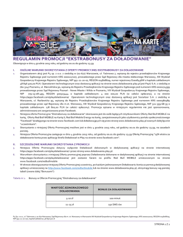 REGULAMIN PROMOCJI "EKSTRABONUSY ZA DOŁADOWANIE" Obowiązuje w dniu 4 grudnia 2015 roku, od godziny 00.01 do godziny 23.59 I. OGÓLNE WARUNKI SKORZYSTANIA Z OFERTY PROMOCYJNEJ EKSTRABONUSY ZA DOŁADOWANIE 1. Organizatorem akcji jest P4 sp. z o.o. z siedzibą w (02-677) Warszawie, ul. Taśmowa 7, wpisaną do rejestru przedsiębiorców Krajowego Rejestru Sądowego pod numerem KRS 0000217207, prowadzonego przez Sąd Rejonowy dla miasta stołecznego Warszawy, XIII Wydział Gospodarczy Krajowego Rejestru Sądowego, NIP 951-21-20-07, REGON 015808609, numer rejestrowy E0008436W o kapitale zakładowym 48 856 500,00 PLN. Operatorem technologicznym oraz dostawcą aplikacji na stronie www.doladowania.play.pl jest PayU S.A. z siedzibą w (60-324) Poznaniu, ul. Marcelińska 90, wpisaną do Rejestru Przedsiębiorców Krajowego Rejestru Sądowego pod numerem KRS 0000274399 prowadzonego przez Sąd Rejonowy Poznań - Nowe Miasto i Wilda w Poznaniu, VIII Wydział Gospodarczy Krajowego Rejestru Sądowego, NIP 779-23-08-495, REGON 300523444 o kapitale zakładowym: 4 000 000,00 PLN (w całości opłacony), a na stronie https://apps.facebook.com/playdoladowania/ Operatorem technologicznym oraz dostawcą aplikacji jest Socializer S.A. z siedzibą w Warszawie, ul. Racławicka 95, wpisaną do Rejestru Przedsiębiorców Krajowego Rejestru Sądowego pod numerem KRS 0000380389 prowadzonego przez sąd Rejonowy dla m.st. Warszawy, XIII Wydział Gospodarczy Krajowego Rejestru Sądowego, NIP 521-359-68-35 o kapitale zakładowym: 178 800,00 PLN (w całości opłacony). Promocja opisana w niniejszym regulaminie nie jest sponsorowana, administrowana ani zorganizowana przez Facebook. Niniejsza oferta Promocyjna "Ekstrabonusy za doładowanie" skierowana jest do osób będących Użytkownikami Oferty Red Bull MOBILE na kartę, Oferty Red Bull MOBILE na Kartę II, Red Bull Mobile Energy na kartę, zarejestrowanych jako użytkownicy portalu społecznościowego "Facebook" działającego na stronie www.facebook.com lub doładowujących się przez stronę www.doladowania.play.pl zwanych dalej łącznie "uczestnikami". Skorzystanie z niniejszej Oferty Promocyjnej możliwe jest w dniu 4 grudnia 2015 roku, od godziny 00.01 do godziny 23.59, na zasadach poniżej. Niniejsza Oferta Promocyjna zastępuje w dniu 4 grudnia 2015 roku, od godziny 00.01 do godziny 23.59 Ofertę Promocyjną "15% ekstra za doładowanie konta przez aplikację Strefa Doładowań w Play na stronie www.facebook.com". 2. 3. 4. II. SZCZEGÓŁOWE WARUNKI SKORZYSTANIA Z PROMOCJI 5. Niniejsza Oferta Promocyjna dotyczy wyłącznie Doładowań dokonanych w dedykowanej aplikacji na stronie internetowej https://apps.facebook.com/playdoladowania/ i przez stronę www.doladowania.play.pl. Warunkiem skorzystania z niniejszej Oferty promocyjnej poprzez Doładowania dokonane w dedykowanej aplikacji na stronie internetowej https://apps.facebook.com/playdoladowania/ jest zostanie fanem na profilu Red Bull MOBILE umieszczonym na stronie www.facebook.com/redbullmobile W okresie obowiązywania niniejszej Oferty Promocyjnej uczestnicy, po każdym jednorazowym Doładowaniu konta za pomocą dedykowanej aplikacji umieszczonej na http://www.facebook.com/redbullmobile lub na stronie www.doladowania.play.pl, otrzymają bonusy wg poniżej tabeli (zwane dalej "Bonusami") 6. 7. Tabela nr 1: Bonusy w Ofercie Promocyjnej "Ekstrabonusy za doładowanie" WARTOŚĆ JEDNORAZOWEGO DOŁADOWANIA BONUS ZA DOŁADOWANIE 5-10 zł 100 minut 11-25 zł 150 SMS-ów P4 Sp. z o.o., ul. Taśmowa 7, 02-677 Warszawa, Sąd Rejonowy dla m. st. Warszawy w Warszawie XIII Wydział Gospodarczy Krajowego Rejestru Sądowego, KRS 0000217207, REGON 015808609, NIP 951-21-20-077, kapitał zakładowy 48 856 500 zł STRONA 1 Z 2 8. 9. 10. 11. 12. 13. 14. 15. 16. 17. WARTOŚĆ JEDNORAZOWEGO DOŁADOWANIA BONUS ZA DOŁADOWANIE 26-50 zł 500 MB-ów 51 zł i więcej 80 % wartości doładowania Z zastrzeżeniem poniższego pkt. 9, Bonus w postaci 150 SMS-ów można wykorzystać na wysłanie 150 krajowych wiadomości SMS (realizowanych z Sieci Telekomunikacyjnej P4) do wszystkich krajowych operatorów komórkowych w ramach oferty, z wyłączeniem numerów zawartych w Tabeli nr 9 w Cenniku Oferty Red Bull MOBILE na kartę, Cenniku Oferty Red Bull MOBILE na kartę II oraz Cenniku Red Bull Mobile Energy. Bonus 150 SMS-ów w Ofercie Red Bull Mobile na karte II, Red Bull Mobile na kartę i Red Bull Mobile Energy darmowe rozmowy i SMSy w Play może zostać wykorzystany tylko na wysłanie 150 krajowych wiadomości SMS (realizowanych z Sieci Telekomunikacyjnej P4) do Sieci Telekomunikacyjnej P4 w ramach oferty, z wyłączeniem numerów zawartych w Tabeli nr 9 w Cenniku Oferty Red Bull Mobile na kartę, Red Bull Mobile na kartę II i Red Bull Mobile Energy. Bonus 500 MB można wykorzystać na transmisję danych na terytorium Rzeczpospolitej Polskiej w zasięgu Sieci Telekomunikacyjnej, przy wykorzystaniu ustawień APN Internet. Po wykorzystaniu pakietu opłata za transmisję danych jest naliczana zgodnie z Cennikiem Oferty Red Bull MOBILE na kartę, Cennikiem Oferty Red Bull MOBILE na kartę II, Cennikiem Oferty Red Bull Mobile Energy. Bonus 100 minut do wszystkich sieci można wykorzystać na krajowe połączenia głosowe do wszystkich sieci komórkowych i stacjonarnych w Polsce realizowane z Sieci Telekomunikacyjnej, z wyłączeniem numerów specjalnych, infolinii i audioteksowych zawartych w Cenniku Oferty Red Bull Mobile na kartę, Red Bull Mobile na kartę II i Red Bull Mobile Energy. Bonus 100 minut do wszystkich sieci można wykorzystać na krajowe połączenia głosowe do wszystkich sieci komórkowych i stacjonarnych w Polsce realizowane z Sieci Telekomunikacyjnej z wyłączeniem numerów stacjonarnych, infolinii i audiotekstowych zawartych w Cenniku Oferty Red Bull MOBILE na kartę, Cenniku Oferty Red Bull MOBILE na kartę II, Cenniku Red Bull Mobile Energy. Bonus 80 % wartości doładowania można wykorzystać na krajowe połączenia 