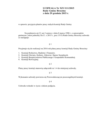 UCHWAŁA Nr XIV/111/2015 Rady Gminy Brzeziny z dnia 29 grudnia 2015 r. w sprawie: przyjęcia planów pracy stałych komisji Rady Gminy Na podstawie art.21 ust.3 ustawy z dnia 8 marca 1990 r. o samorządzie gminnym ( tekst jednolity Dz.U. z 2015 r., poz.1515) Rada Gminy Brzeziny uchwala co następuje: §1 Przyjmuje się do realizacji na 2016 rok plany pracy komisji Rady Gminy Brzeziny: 1. 2. 3. 4. Komisji Rolnictwa, Budżetu i Finansów. Komisji Oświaty, Kultury, Zdrowia i Spraw Socjalnych. Komisji Bezpieczeństwa Publicznego i Gospodarki Komunalnej. Komisji Rewizyjnej. §2 Plany pracy komisji stanowią załączniki nr 1-4 do niniejszej uchwały. §3 Wykonanie uchwały powierza się Przewodniczącym poszczególnych komisji. §4 Uchwała wchodzi w życie z dniem podjęcia. Załącznik Nr 1 do Uchwały Nr XIV/111/2015 Rady Gminy Brzeziny z dnia 29 grudnia 2015 r. PLAN PRACY KOMISJI ROLNICTWA, BUDŻETU I FINANSÓW NA 2016 r. Stosownie do § 60 pkt.1 Statutu Gminy Brzeziny Komisja Rolnictwa, Budżetu i Finansów przedkłada Radzie plan pracy Komisji na 2016 rok 1. Omówienie i zaopiniowanie materiałów na sesję Rady Gminy. 2. Ocena działalności GOPS za 2015 rok. 3. Ocena działalności finansowej GOK w Brzezinach i GOSiR w Brzezinach za 2015 rok. 4. Informacja odnośnie działania i zamierzeń Zakładu Obsługi Komunalnej sp. z o.o. na najbliższy okres. 5. Analiza wykonania budżetu za I półrocze 2016 roku. 6. Analiza wniosków inwestycyjnych na 2017 rok – wyjazdowe posiedzenie komisji. 7. Informacja Referatu Gospodarki i Rozwoju Lokalnego na temat prowadzonych działań związanych z produkcją rolną w gospodarstwach indywidualnych. 8. Opiniowanie projektu budżetu na 2017rok. 9. Opracowanie planu pracy Komisji na 2017 rok. Załącznik Nr 2 do Uchwały Nr XIV/111/2015 Rady Gminy Brzeziny z dnia 29 grudnia 2015 r. PLAN PRACY KOMISJI OŚWIATY, KULTURY, ZDROWIA I SPRAW SOCJALNYCH NA 2016 r. Stosownie do § 60 pkt.1 Statutu Gminy Brzeziny Komisja Oświaty, Kultury, Zdrowia i Spraw Socjalnych przedkłada Radzie plan pracy Komisji na 2016 rok 1. Omawianie projektów, uchwał i opiniowanie 1. Współpraca z dyrektorami szkół w zakresie problematyki oświatowej: a. analiza arkusza organizacyjnego szkół, b. przygotowanie placówek oświatowych do rozpoczęcia nowego roku szkolnego i analiza realizacji wniosków z poprzedniego roku, c. przyjęcie informacji dotyczącej pracy świetlic szkolnych, d. informacja dotycząca wyników egzaminów kompetencyjnych na szczeblu szkół podstawowych i gimnazjum. e. zapoznanie się z raportami po Ewaluacji Kuratorium w Poznaniu w poszczególnych placówkach szkolnych . 3.Sprawozdanie z działalności GOK i GOKSiR za rok 2015 i zapoznanie z planem pracy na 2016 rok. 4.Sprawozdanie kierownika Gminnej Biblioteki Publicznej z działalności w roku 2015 i planem pracy na 2016 rok 5.SprawozdanieKierownika GOPS w Brzezinach za rok 2015 i z planem pracy na 2016 w zakresie; - dożywiania dzieci i młodzieży w szkołach, - pomocy socjalnej dla uczniów - opieki społecznej 6. Informacja Gminnej Komisji Przeciwdziałania Alkoholizmowi i Narkomanii z działalności w roku 2015 (z uwzględnieniem poszczególnych punktów integracyjnych na terenie gminy) i planem pracy na rok 2016. 7. Zapoznanie się z informacją dotyczącą prac społecznie użytecznych, wykonywanych na terenie gminy przez skazanych prawomocnym wyrokiem sądu w roku 2015 oraz z planem tych prac na 2016 rok. 8. Analiza zimowego i letniego wypoczynku dzieci i młodzieży. 9. Analiza dofinansowania przez Gminę klubów sportowych i innych organizacji sportowych działających na terenie gminy Brzeziny. Stypendia sportowe-regulamin ich przyznawania. 10. Opracowanie planu pracy na 2017 rok. 11. Wnioski i propozycje do budżetu gminy na rok 2017, oraz opiniowanie budżetu gminy na rok 2017. Komisja zastrzega sobie prawo uzupełniania planu pracy o tematy wynikające z bieżących potrzeb. Załącznik Nr 3 do Uchwały Nr XIV/111/2015 Rady Gminy Brzeziny z dnia 29 grudnia 2015 r. PLAN PRACY KOMISJI BEZPIECZEŃSTWA PUBLICZNEGO I GOSPODAKI KOMUNALNEJ NA 2016 r Stosownie do § 60 pkt.1 Statutu Gminy Brzeziny Komisja Bezpieczeństwa Publicznego i Gospodarki Komunalnej przedkłada Radzie plan pracy Komisji na 2016 rok 1. Opiniowanie projektów uchwał przed każdą sesją Rady Gminy Brzeziny. 2. Stan bezpieczeństwa w Gminie w roku 2015. Sytuacja dotycząca tej problematyki zostanie przedstawiona przez przedstawiciela Komendy Policji i Straży Pożarnej. 3. Wyjazdowe posiedzenie komisji dotyczące do Pieczysk 4. Posiedzenie wyjazdowe. Ocena infrastruktury drogowej i oświetleniowej. 5. Ocena przygotowania Ośrodka Wypoczynkowego do sezonu letniego. 6. Ocena wykonania budżetu za I półrocze 2016 roku. 7. Omówienie projektu budżetu na rok 2017. 8. Opracowanie planu pracy Komisji na 2017 rok. Załącznik Nr 4 do Uchwały Nr XIV/111/2015 Rady Gminy Brzeziny z dnia 29 grudnia 2015 r. PLAN PRACY KOMISJI REWIZYJNEJ NA 2016 r. Stosownie do § 60 pkt.1 Statutu Gminy Brzeziny Komisja Rewizyjna przedkłada Radzie plan pracy Komisji na 2016 rok 1. Zapoznanie się z projektami uchwał przed każdą sesją Rady Gminy Brzeziny. 2. Analiza budżetu za 2015 rok – wybrane zagadnienia. 3. Kontrola dokumentacji zakończonych inwestycji prowadzonych przez Gminę w roku 2015 – wybrana inwestycja. 4. Wypracowanie opinii w sprawie wykonania budżetu Gminy Brzeziny za 2015 rok i sporządzenie wniosku w sprawie udzielenia lub nieudzielania absolutorium dla Wójta Gminy. 5. Ocena sprawozdania z wykonania budżetu Gminy za I półrocze 2016 roku. 6. Kontrola działalności i realizacji budżetu w wybranej jednostce organizacyjnej gminy – szkoła. 7. Omówienie i zaopiniowanie propozycji stawek podatków i opłat za wodę i ścieki na rok 2017. 8. Zaopiniowanie projektu budżetu na rok 2017. Ustalenie planu Komisji Rewizyjnej na rok 2017. Plan pracy Komisji Rewizyjnej nie obejmuje tematyki kontrolnej zlecanej przez Radę Gmi