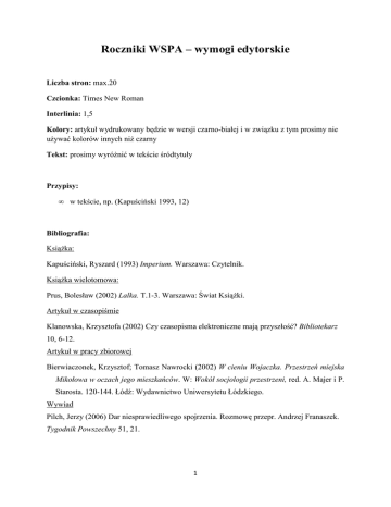 Roczniki WSPA – wymogi edytorskie Liczba stron: max.20 Czcionka: Times New Roman Interlinia: 1,5 Kolory: artykuł wydrukowany będzie w wersji czarno-białej i w związku z tym prosimy nie używać kolorów innych niż czarny Tekst: prosimy wyróżnić w tekście śródtytuły Przypisy: • w tekście, np. (Kapuściński 1993, 12) Bibliografia: Książka: Kapuściński, Ryszard (1993) Imperium. Warszawa: Czytelnik. Książka wielotomowa: Prus, Bolesław (2002) Lalka. T.1-3. Warszawa: Świat Książki. Artykuł w czasopiśmie Klanowska, Krzysztofa (2002) Czy czasopisma elektroniczne mają przyszłość? Bibliotekarz 10, 6-12. Artykuł w pracy zbiorowej Bierwiaczonek, Krzysztof; Tomasz Nawrocki (2002) W cieniu Wojaczka. Przestrzeń miejska Mikołowa w oczach jego mieszkańców. W: Wokół socjologii przestrzeni, red. A. Majer i P. Starosta. 120-144. Łódź: Wydawnictwo Uniwersytetu Łódzkiego. Wywiad Pilch, Jerzy (2006) Dar niesprawiedliwego spojrzenia. Rozmowę przepr. Andrzej Franaszek. Tygodnik Powszechny 51, 21. 1 Strona internetowa Ryszard Kapuściński zawód - reporter [dostęp 23 lutego 2007]. http://www.kapuscinski.hg.pl/index.php Rysunki, wykresy, tabele: Tab. 6. Liczba osób korzystających z placówek wsparcia w latach 2007-2008 w województwie lubelskim 2007 765 422 schroniska i noclegownie jadłodajnie 2008 900 939 Źródło: Opracowanie własne na podstawie: Raporty ROPS w Lublinie Stan pomocy społecznej Do artykułu prosimy dołączyć także: • słowa kluczowe (max 5) • streszczenie w jęz. polskim (12 linijek) • nota biograficzna o autorze (max 12 linijek) Propozycje tytułów oraz artykuły prosimy przysyłać w formie elektronicznej na adres: [email protected] zgodnie z następującym harmonogramem: tytuł artykułu do dnia 30 kwietnia 2010 r. tekst artykułu do dnia 15 sierpnia 2010 r. Prosimy nazwać plik zawierający artykuł: nazwisko, imię, pierwsze trzy słowa tytułu artykułu, np. Kowalski Jan Nowa kultura organizacyjna 2
