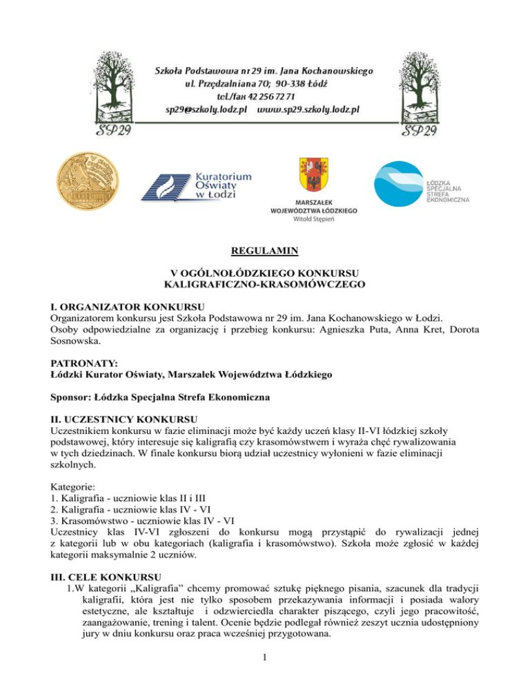 REGULAMIN V OGÓLNOŁÓDZKIEGO KONKURSU KALIGRAFICZNO-KRASOMÓWCZEGO I. ORGANIZATOR KONKURSU Organizatorem konkursu jest Szkoła Podstawowa nr 29 im. Jana Kochanowskiego w Łodzi. Osoby odpowiedzialne za organizację i przebieg konkursu: Agnieszka Puta, Anna Kret, Dorota Sosnowska. PATRONATY: Łódzki Kurator Oświaty, Marszałek Województwa Łódzkiego Sponsor: Łódzka Specjalna Strefa Ekonomiczna II. UCZESTNICY KONKURSU Uczestnikiem konkursu w fazie eliminacji może być każdy uczeń klasy II-VI łódzkiej szkoły podstawowej, który interesuje się kaligrafią czy krasomówstwem i wyraża chęć rywalizowania w tych dziedzinach. W finale konkursu biorą udział uczestnicy wyłonieni w fazie eliminacji szkolnych. Kategorie: 1. Kaligrafia - uczniowie klas II i III 2. Kaligrafia - uczniowie klas IV - VI 3. Krasomówstwo - uczniowie klas IV - VI Uczestnicy klas IV-VI zgłoszeni do konkursu mogą przystąpić do rywalizacji jednej z kategorii lub w obu kategoriach (kaligrafia i krasomówstwo). Szkoła może zgłosić w każdej kategorii maksymalnie 2 uczniów. III. CELE KONKURSU 1.W kategorii „Kaligrafia” chcemy promować sztukę pięknego pisania, szacunek dla tradycji kaligrafii, która jest nie tylko sposobem przekazywania informacji i posiada walory estetyczne, ale kształtuje i odzwierciedla charakter piszącego, czyli jego pracowitość, zaangażowanie, trening i talent. Ocenie będzie podlegał również zeszyt ucznia udostępniony jury w dniu konkursu oraz praca wcześniej przygotowana. 1 2.W kategorii „Krasomówstwo” pragniemy walczyć z bylejakością i niechlujnością języka codziennego. Chcemy pokazać, że warto i należy mówić piękną polszczyzną, aby przekazać więcej znaczeń i zachwycić odbiorcę. 3.Wsparcie merytoryczne uczestników i nauczycieli prowadzących poprzez przygotowanie przez organizatora warsztatów kaligraficznych i krasomówczych poprzedzających konkurs. IV. KRYTERIA OCENY PRAC/WYSTĄPIEŃ KONKURSOWYCH 1. W kategorii „Kaligrafia” oceniane są: czytelność, estetyka, kształt i proporcjonalność liter konsekwencja zapisu przepisywanego podczas konkursu tekstu walory artystyczne pracy estetyka prowadzonego przez ucznia zeszytu, który należy przedstawić komisji w dniu konkursu 2. W kategorii „Krasomówstwo” oceniane są: umiejętność swobodnego, ciekawego wypowiadania się na wskazany temat znajomość zasad poprawności językowej i gramatycznej bogactwo języka, odpowiedni dobór słów błyskotliwość, swoboda wypowiedzi, oryginalność dbałość o dykcję i intonację, kontakt z odbiorcą ogólne wrażenie artystyczne V. STRUKTURA I PRZEBIEG KONKURSU 1. Etap I – szkolny Szkoła macierzysta przeprowadza eliminacje wewnętrzne, w których wyłania szkolnych Mistrzów Mowy Ojczystej i Kaligrafii. 2. Etap II – ogólnołódzki KATEGORIA - KALIGRAFIA Uczniowie w ciągu 60 minut przepisują tekst za pomocą piórka (stalówka z drewnianą obsadką) i atramentu na kartce bez liniatury oraz adresują kopertę. Uczestnicy mogą korzystać z własnych przyborów. KATEGORIA – KRASOMÓWSTWO Uczniowie w ciągu 60 minut) rozwiązują test sprawdzający ich kompetencje językowe (znajomość frazeologizmów, dobór stylu wypowiedzi do sytuacji; rozpoznawanie i korygowanie błędów językowych: fleksyjnych, składniowych, słownikowych, frazeologicznych; formułowanie wypowiedzi zgodnie z intencją) Uczniowie przedstawiają się i zabierają głos na temat: "Daj mi właściwe słowo i odpowiedni akcent, to poruszę świat". Wypowiedź nie może przekroczyć 5 minut. Uczniowie wypowiadają się na wylosowany przez Zespół Oceniający temat w następujących kategoriach: przekonaj nas, że.../odmów..., opisz przedmiot, sytuację... oceń, uzasadniając... Podczas konkursu przede wszystkim oceniana będzie spontaniczność wypowiedzi, swoboda, poczucie humoru, bogactwo słownictwa, ogólne wrażenie. Zachęcamy do ćwiczenia z uczniami swobodnego wypowiadania się, wyrażania opinii, śmiałego formułowania argumentów. Należy zwrócić uwagę na różnicę między recytacją a prezentacją. Test pisemny będzie miał charakter praktyczny. Zależy nam na ocenie umiejętności, nie encyklopedycznej wiedzy. Przerwa – narada jury. Zakończenie konkursu – wręczenie nagród i dyplomów laureatom konkursu. VI. WARSZTATY KALIGRAFICZNO-KRASOMÓWCZE: 2 1.Planujemy organizację cyklu warsztatów, których celem jest przybliżenie uczniom i nauczycielom zasad kaligrafii i krasomówstwa, omówienie kryteriów konkursowych, doskonalenie umiejętności konkursowych pod kierunkiem fachowców. 2.Warunkiem uczestnictwa w warsztatach jest wypełnienie karty zgłoszeniowej (załącznik nr 1) i dostarczenie jej do dnia 06 października 2014 r. na adres mailowy: [email protected] lub pod numer faxu: 42 256 72 71 3.Ilość uczestników – maksymalnie 6 osób z danej szkoły (po 2 osoby z kategorii). 4.O zakwalifikowaniu decyduje kolejność zgłoszeń. O terminie warsztatów uczestnicy zostaną powiadomieni w odrębnym piśmie. VII. TERMINARZ KONKURSU 1. Eliminacje w szkołach macierzystych - do 17 października 2014 r. 2. Zgłoszenia do konkursu do 22 października 2014 r. Należy dostarczyć kartę zgłoszeniową udziału w konkursie (załącznik nr 2) na adres mailowy: [email protected] lub pod numer faxu: 42 256 72 71 3. Etap łódzki 20 listopada 2014r. - kaligrafia 27 listopada 2014 r. - krasomówstwo Wyniki konkursu – 27 listopada 2014 r. (czwartek) o godzinach konkursów powiadomimy w odrębnym piśmie po otrzymaniu zgłoszenia. VIII. NAGRODY 1. Tytuł Mistrza Kaligrafii otrzymuje uczeń, który uzyskał najwięcej punktów w kategorii kaligrafia (kategoria klasy II-III i klasy IV-VI). 2. Tytuł Mistrza Mowy Ojczystej otrzymuje uczeń, który uzyskał najwięcej punktów w kategorii krasomówstwo (klasy IV-VI). 3. Tytuł Mistrza Języka Polskiego otrzymuje uczeń, który przystąpi do obu kategorii i otrzyma w obu wyróżniającą lic