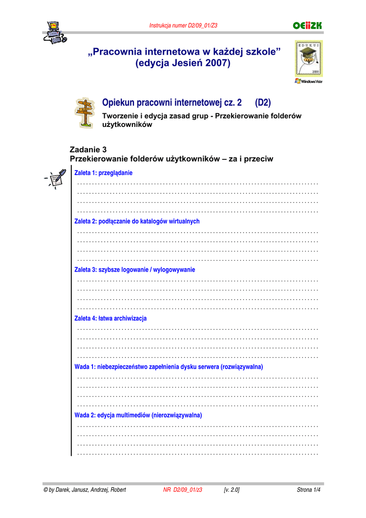 Instrukcja numer D2/09_01/Z3 „Pracownia internetowa w każdej szkole” (edycja Jesień 2007) Opiekun pracowni internetowej cz. 2 (D2) Tworzenie i edycja zasad grup - Przekierowanie folderów użytkowników Zadanie 3 Przekierowanie folderów użytkowników – za i przeciw Zaleta 1: przeglądanie .................................................................................. .................................................................................. .................................................................................. .................................................................................. Zaleta 2: podłączanie do katalogów wirtualnych .................................................................................. .................................................................................. .................................................................................. .................................................................................. Zaleta 3: szybsze logowanie / wylogowywanie .................................................................................. .................................................................................. .................................................................................. .................................................................................. Zaleta 4: łatwa archiwizacja .................................................................................. .................................................................................. .................................................................................. .................................................................................. Wada 1: niebezpieczeństwo zapełnienia dysku serwera (rozwiązywalna) .................................................................................. .................................................................................. .................................................................................. .................................................................................. Wada 2: edycja multimediów (nierozwiązywalna) .................................................................................. .................................................................................. .................................................................................. .................................................................................. © by Darek, Janusz, Andrzej, Robert NR D2/09_01/z3 [v. 2.0] Strona 1/4 Tworzenie i edycja zasad grup - Przekierowanie folderów użytkowników Polecenie 1 – sprawdzanie, co znajduje się w folderze O:/home 1. Będąc zalogowanym jako administrator na konsoli serwera, wybierz z paska zadań Start Mój komputer 2. W oknie Mój komputer otwórz dysk O: 3. W oknie O: otwórz folder Home 4. W oknie O:\Home otwórz jeden z folderów tam się znajdujących Notatka – w jakim celu skrypt zakładający automatycznie konta utworzył strukturę znajdującą się wewnątrz folderu Home? .................................................................................. .................................................................................. .................................................................................. .................................................................................. .................................................................................. .................................................................................. .................................................................................. .................................................................................. Polecenie 2 – modyfikowanie zasady grup obejmującej całą twoją szkołę w celu przekierowania podstawowych folderów użytkowników 1. Będąc zalogowanym jako administrator na konsoli serwera, wybierz z paska zadań Start Narzędzia administracyjne Zarządzanie serwerem 2. Rozwiń Zarządzanie zaawansowane 3. Rozwiń Zarządzanie zasadami grupy 4. Rozwiń Forest : <nazwa_twojej_głownej_domeny> 5. Rozwiń Domains 6. Rozwiń <nazwa_twojej_głownej_domeny> 7. Rozwiń jednostkę organizacyjną twojej szkoły 8. Wskaż Główna zasada grup dla szkoły xx 9. Wybierz prawym klawiszem myszy Główna zasada grup dla szkoły xx 10. Wybierz z menu kontekstowego Edit 11. W oknie Edytor obiektów zasad grupy rozwiń Konfiguracja użytkownika 12. W oknie Edytor obiektów zasad grupy rozwiń Ustawienia systemu Windows 13. W oknie Edytor obiektów zasad grupy rozwiń Przekierowanie folderu 14. W oknie Edytor obiektów zasad grupy wskaż Pulpit 15. Wybierz prawym klawiszem myszy Pulpit 16. Z menu kontekstowego wybierz Właściwości 17. W oknie Właściwości: Pulpit z zakładki Miejsce docelowe z listy rozwijanej Ustawienie wybierz Podstawowe – przekierowuj wszystkie foldery do tej samej lokalizacji 18. W oknie Właściwości: Pulpit w ramce Lokalizacja folderu docelowego wybierz z listy © by Darek, Janusz, Andrzej, Robert NR D2/09_01/z3 [v. 2.0] Strona 2/4 Tworzenie i edycja zasad grup - Przekierowanie folderów użytkowników rozwijanej Przekieruj do następującej lokalizacji 19. W oknie Właściwości: Pulpit w ramce Lokalizacja folderu docelowego w polu Ścieżka katalogu głównego wpisz \\sbsyy\%username%$$\Pulpit ................................................................................... ................................................................................... ................................................................................... ................................................................................... 20. W oknie Właściwości: Pulpit wybierz zakładkę Ustawienia 21. W oknie Właściwości: Pulpit wyłącz opcję Udziel użytkownikowi praw wyłączności do Pulpit 22. W oknie Właściwości: Pulpit wybierz przycisk OK. 23. Wybierz