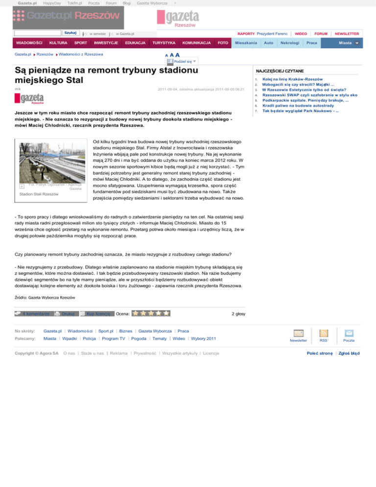 Gazeta.pl HappyDay Tokfm.pl i j k l m n Szukaj WIADOMOŚCI Gazeta.pl KULTURA Rzeszów Poczta Forum w serwisie SPORT j k l m n Blogi Gazeta Wyborcza RAPORTY Prezydent Ferenc w Gazeta.pl INWESTYCJE EDUKACJA TURYSTYKA Wiadomości z Rzeszowa A KOMUNIKACJA FOTO Mieszkania Auto WIDEO Nekrologi FORUM Praca Miasta Rzeszów 21ºC AA NEWSLETTER Prognoza pogody Podziel się Są pieniądze na remont trybuny stadionu miejskiego Stal mk NAJCZĘŚCIEJ CZYTANE 1. 2. 2011 -09-04, ostatnia aktualizacja 2011 -09-05 08:21 3. 4. 5. 6. Jeszcze w tym roku miasto chce rozpocząć remont trybuny zachodniej rzeszowskiego stadionu miejskiego. - Nie oznacza to rezygnacji z budowy nowej trybuny dookoła stadionu miejskiego mówi Maciej Chłodnicki, rzecznik prezydenta Rzeszowa. 7. Kolej na linię Kraków -Rzeszów Wzbogacili si ę czy stracili? Majątki ... W Rzeszowie Estetycznie tylko od świ ęta? Rzeszowski SWAP czyli szafobranie w stylu eko Podkarpackie szpitale. Pieni ędzy brakuje, ... Kradli paliwo na budowie autostrady Tak będzie wygl ądał Park Naukowo - ... Od kilku tygodni trwa budowa nowej trybuny wschodniej rzeszowskiego stadionu miejskiego Stal. Firmy Alstal z Inowrocławia i rzeszowska Inżynieria wbijają pale pod konstrukcje nowej trybuny. Na jej wykonanie mają 270 dni i ma być oddana do użytku na koniec marca 2012 roku. W nowym sezonie sportowym kibice będą mogli już z niej korzystać. - Tym bardziej potrzebny jest generalny remont starej trybuny zachodniej mówi Maciej Chłodniki. A to dlatego, że zachodnia część stadionu jest mocno sfatygowana. Uzupełnienia wymagają krzesełka, spora część fundamentów pod siedziskami musi być zbudowana na nowo. Także przejścia pomiędzy siedzeniami i sektorami trzeba wybudować na nowo. Fot. Patryk Ogorza łek / Agencja Gazeta Stadion Stali Rzeszów - To sporo pracy i dlatego wnioskowaliśmy do radnych o zatwierdzenie pieniędzy na ten cel. Na ostatniej sesji rady miasta radni przegłosowali milion sto tysięcy złotych - informuje Maciej Chłodnicki. Miasto do 15 września chce ogłosić przetarg na wykonanie remontu. Przetarg potrwa około miesiąca i urzędnicy liczą, że w drugiej połowie października mogłyby się rozpocząć prace. Czy planowany remont trybuny zachodniej oznacza, że miasto rezygnuje z rozbudowy całego stadionu? - Nie rezygnujemy z przebudowy. Dlatego właśnie zaplanowano na stadionie miejskim trybunę składającą się z segmentów, które można dostawiać. I tak będzie przebudowywany rzeszowski stadion. Na razie budujemy dziewięć segmentów bo na tyle mamy pieniądze, ale w przyszłości będziemy rozbudowywać obiekt dostawiając kolejne elementy aż dookoła boiska i toru żużlowego - zapewnia rzecznik prezydenta Rzeszowa. Źródło: Gazeta Wyborcza Rzeszów 4 komentarze Na skróty: Gazeta.pl Polecamy: Miasta Copyright © Agora SA Drukuj Kup licencję Wiadomości Wpadki O nas Policja Sport.pl Ocena: Biznes Program TV Staże u nas 2 głosy Reklama Gazeta Wyborcza Pogoda Tematy Prywatność Praca Wideo Wybory 2011 Wszystkie artykuły Licencje Newsletter RSS Poleć stronę Poczta Zgłoś błąd