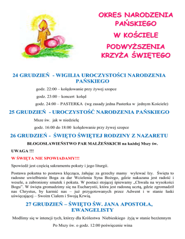 OKRES NARODZENIA PAŃSKIEGO W KOŚCIELE PODWYŻSZENIA KRZYŻA ŚWIĘTEGO 24 GRUDZIEŃ - WIGILIA UROCZYSTOŚCI NARODZENIA PAŃSKIEGO godz. 22:00 – kolędowanie przy żywej szopce godz. 23:00 – koncert kolęd godz. 24:00 – PASTERKA (wg zasady jedna Pasterka w jednym Kościele) 25 GRUDZIEŃ - UROCZYSTOŚĆ NARODZENIA PAŃSKIEGO Msze św. jak w niedzielę godz. 16:00 do 18:00 kolędowanie przy żywej szopce 26 GRUDZIEŃ - ŚWIĘTO ŚWIĘTEJ RODZINY Z NAZARETU BŁOGOSŁAWIEŃSTWO PAR MAŁŻEŃSKICH na każdej Mszy św. UWAGA !!! W ŚWIĘTA NIE SPOWIADAMY!!! Spowiedź jest częścią sakramentu pokuty i jego liturgii. Postawa pokutna to postawa klęcząca, żałując za grzechy mamy wylewać łzy. Święta to radosne uwielbienie Boga za dar Wcielenia Syna Bożego, gdzie nakazana jest radość i wesele, a zabroniony smutek i pokuta. W postaci stojącej śpiewamy „Chwała na wysokości Bogu”. W święta gromadzimy się na Eucharystii, która jest radosną ucztą, gdzie zgromadził nas Chrystus, by karmić nas – już przygotowanych przez Adwent i w stanie łaski uświęcającej – Swoim Ciałem i Swoją Krwią. 27 GRUDZIEŃ – ŚWIĘTO ŚW. JANA APOSTOŁA, EWANGELISTY Modlimy się w intencji tych, którzy dla Królestwa Niebieskiego żyją w stanie bezżennym Po Mszy św. o godz. 12:00 poświęcenie wina 28 GRUDZIEŃ – ŚWIĘTO MŁODZIANKÓW Z BETLEJEM godz. 12:00 Msza św. z błogosławieństwem małych dzieci ROZPOCZĘCIE KOLĘDY- WIZYTA DUSZPASTERSKA I POŚWIĘCENIE DOMÓW W NASZEJ PARAFII. 29 GRUDZIEŃ - DZIEŃ STARCA SYMEONA godz. 12:00 Msza św. z błogosławieństwem ludzi w podeszłym wieku 30 GRUDZIEŃ – DZIEŃ PROROKINI ANNY – WDOWY godz. 12:00 Msza św. z błogosławieństwem wdów i kobiet samotnych 1 STYCZEŃ 2011 – ZAKOŃCZENIE OKTAWY NARODZENIA PAŃSKIEGO UROCZYSTOŚĆ BOGURODZICY MARYI, Msze św. jak w niedzielę. 6 STYCZEŃ – UROCZYSTOŚĆ OBJAWIENIA PAŃSKIEGO TRZECH KRÓLI Msze św. jak w Niedzielę, po każdej Mszy św. poświęcenie kredy i kadzidła. KOROWÓD TRZECH KRÓLI – Z KATEDRY, PO MSZY ŚW. O GODZ. 13:00 DO KOŚCIOŁA OJCÓW FRANCISZKANÓW 9 STYCZEŃ - ŚWIĘTO CHRZTU PAŃSKIEGO (JORDAN) ZAKOŃCZENIE OKRESU NARODZENIA PAŃSKIEGO Uroczyste poświęcenie wody w czasie każdej Mszy św.