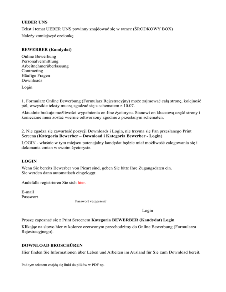 UEBER UNS Tekst i temat UEBER UNS powinny znajdować się w ramce (ŚRODKOWY BOX) Należy zmniejszyć czcionkę BEWERBER (Kandydat) Online Bewerbung Personalvermittlung Arbeitnehmerüberlassung Contracting Häufige Fragen Downloads Login 1. Formularz Online Bewerbung (Formularz Rejestracyjny) może zajmować całą stronę, kolejność pól, wszystkie teksty muszą zgadzać się z schematem z 10.07. Aktualnie brakuje możliwości wypełnienia on-line życiorysu. Stanowi on kluczową część strony i koniecznie musi zostać wiernie odtworzony zgodnie z przesłanym schematen. 2. Nie zgadza się zawartość pozycji Downloads i Login, nie trzyma się Pan przesłanego Print Screena (Kategoria Bewerber – Download i Kategoria Bewerber - Login) LOGIN - właśnie w tym miejscu potencjalny kandydat będzie miał możliwość zalogowania się i dokonania zmian w swoim życiorysie. LOGIN Wenn Sie bereits Bewerber von Picart sind, geben Sie bitte Ihre Zugangsdaten ein. Sie werden dann automatisch eingeloggt. Andefalls registrieren Sie sich hier. E-mail Passwort Passwort vergessen? Login Proszę zapoznać się z Print Screenem Kategoria BEWERBER (Kandydat) Login Klikając na słowo hier w kolorze czerwonym przechodzimy do Online Bewerbung (Formularza Rejestracyjnego). DOWNLOAD BROSCHÜREN Hier finden Sie Informationen über Leben und Arbeiten im Ausland für Sie zum Download bereit. Pod tym tekstem znajdą się linki do plików w PDF np. Praca i życie w Niemczech (PDF) Vivir y trabajar en Alemania (PDF) UNTERNEHMEN (Pracodawca) Proszę o zachowanie kolejności pól, a mianowicie: Personalvermittlung Arbeitnehmerüberlassung Arbeitskräfte anfragen Allgemeine Geschäftsbedingungen Arbeitskräfte anfragen http://www.fsrl.co.uk/registeravacancy.aspx?nodeid=f036fa79-c29b-4c54-babc-0ff297a20a14 Mit diesem Formular können Sie ganz unverbindlich Arbeitskräfte bei uns anfragen! Vielen Dank! Vorname: * Name: * Telefon: Mobil: Fax: E-Mail-Adresse: Straße: Postleitzahl: Stadt: Beschreibung:* Mit * gekennzeichnete Felder sind Pflichtfelder. STELLENANGEBOTE (Oferty pracy) Proszę o wprowadzeniu kilku ofert zgodnie z schematem (Print Screen Kategorie Stellenangebote...) KONTAKT Kontakt będzie składał się z 2 podkategorii w ramce 1. Kontakt 2. Ansprechpartner (Osoba kontaktowa) Newsletter to będą informacje dotyczące wszystkich ofert pracy, a także uregulowań prawnych w poszczególnych krajach, przesyłane 2 razy w miesiącu. JobAlert to powinno być automatyczne powiadomienie o nowych ofertach pracy, wysyłane prosto na skrzynkę e-mail w zależności od wybranej przez kandydata branży. Powinien stanowić część formularza rejestracyjnego i znajdować się na samym końcu. JobAlert Wenn Sie sich für JobAlert registrieren, werden Sie regelmäßig über ausgewählte Arbeitsangebote informiert. JobAlert (na zasadzie odhaczenia, powyżej znajdzie się tekst informujący na czym polega JobAlert) Newsletter i JobAlert powinny znaleźć się w ramce z prawej strony (patrz schemat) Newsletter (Print screen Podstrona z 10.07.11) Poniżej znajdzie Pan tekst, który powinien znaleźć się w wersji niemieckiej Allen Stellensuchenden bieten wir an, sich regelmäßig über die offenen Positionen bei unseren Kunden und Neuigkeiten bei unserer Arbeit zu informieren. Dazu registrieren Sie sich bitte mit Ihrem Namen und Ihrer Emailadresse: Bitte füllen Sie alle Felder aus. Vorname Nachname E-mail Diese Daten werden nur dazu verwandt, um Ihnen unseren Newsletter zuzusenden. Wir beachten strikt alle Datenschutzgesetze und sichern Ihnen absolute Vertraulichkeit zu. Wenn Sie auf neue Positionen, die wir zu besetzen haben, aktiv angesprochen werden möchten, registrieren Sie sich bitte in unserer Datenbank (siehe Stellenangebote). Abmeldung Um den Newsletter abzubestellen, tragen Sie bitte hier Ihre E-Mail-Adresse ein. E-mail Abbestellen