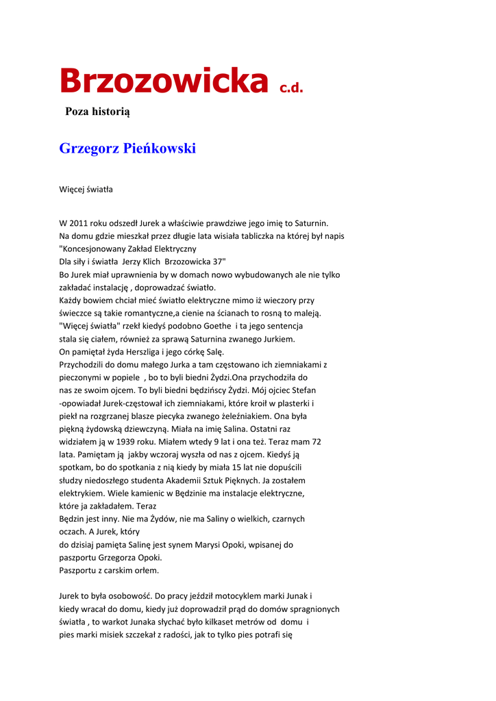 Brzozowicka c.d. Poza historią Grzegorz Pieńkowski Więcej światła W 2011 roku odszedł Jurek a właściwie prawdziwe jego imię to Saturnin. Na domu gdzie mieszkał przez długie lata wisiała tabliczka na której był napis "Koncesjonowany Zakład Elektryczny Dla siły i światła Jerzy Klich Brzozowicka 37" Bo Jurek miał uprawnienia by w domach nowo wybudowanych ale nie tylko zakładać instalację , doprowadzać światło. Każdy bowiem chciał mieć światło elektryczne mimo iż wieczory przy świeczce są takie romantyczne,a cienie na ścianach to rosną to maleją. "Więcej światła" rzekł kiedyś podobno Goethe i ta jego sentencja stala się ciałem, również za sprawą Saturnina zwanego Jurkiem. On pamiętał żyda Herszliga i jego córkę Salę. Przychodzili do domu małego Jurka a tam częstowano ich ziemniakami z pieczonymi w popiele , bo to byli biedni Żydzi.Ona przychodziła do nas ze swoim ojcem. To byli biedni będzińscy Żydzi. Mój ojciec Stefan -opowiadał Jurek-częstował ich ziemniakami, które kroił w plasterki i piekł na rozgrzanej blasze piecyka zwanego żeleźniakiem. Ona była piękną żydowską dziewczyną. Miała na imię Salina. Ostatni raz widziałem ją w 1939 roku. Miałem wtedy 9 lat i ona też. Teraz mam 72 lata. Pamiętam ją jakby wczoraj wyszła od nas z ojcem. Kiedyś ją spotkam, bo do spotkania z nią kiedy by miała 15 lat nie dopuścili słudzy niedoszłego studenta Akademii Sztuk Pięknych. Ja zostałem elektrykiem. Wiele kamienic w Będzinie ma instalacje elektryczne, które ja zakładałem. Teraz Będzin jest inny. Nie ma Żydów, nie ma Saliny o wielkich, czarnych oczach. A Jurek, który do dzisiaj pamięta Salinę jest synem Marysi Opoki, wpisanej do paszportu Grzegorza Opoki. Paszportu z carskim orłem. Jurek to była osobowość. Do pracy jeździł motocyklem marki Junak i kiedy wracał do domu, kiedy już doprowadził prąd do domów spragnionych światła , to warkot Junaka słychać było kilkaset metrów od domu i pies marki misiek szczekał z radości, jak to tylko pies potrafi się cieszyć i radować z powrotu pana.. Miesiąc po swoim odejściu Jurek dał znać o sobie, postanowił się odezwać Marysia jego siostra usłyszała jak ktoś na górze przewrócił krzesło , charakterystyczny stukot usłyszała taki sam jak wtedy gdy Jurek żył. A że Jurek był za życia dość wątpiącym i specjalnie wierzącym nie był , tzn. Kościoła na górce nie nawiedzał, to ten znak ma szczególne znaczenie.Trochę nas w tej sprawie oświecił, czyli nadal można powiedzieć pracuje w swoim zawodzie. Oświeca. Znaczy się jest życie po śmierci.żeby tylko było jeszcze życie przed śmiercią...życie prawdziwe . własne a nie telewizyjne. 15 maja 1943 rok godz 6 Joasia jak zwykle wyszła na podwórko by wypuścić kury i nakarmić je.Tę scenę obserwuje przez maleńkie okienko w piwnicy ukrywający się tutaj od dwóch lat młody Żyd.potem przyjedzie do Będzina w latach 60 tych i opowie Joasi jak obserwował ją zawsze rano. A dom ,w którym w czasie wojny ukrywał się Żyd, to dom pana Tomasza Misia Kiedy rozpoczynał się XX wiek ,ludzie byli pełni nadziei ze będzie to wiek wyjątkowy. Wyjątkowy pod każdym względem. Wydawało się ze dla nauki i techniki nie ma żadnych barier. Że postęp techniczny uczyni życie na ziemi rajem. Ale nikt nie dostrzegł ze technologia rozeszła się z etyką. Ważny zaczął być sam postęp bez oglądania się na konsekwencje. Ale co spowodowało że prawie w połowie XX wieku młody człowiek musiał spędzić parę lat w piwnicy ukrywając się aby przeżyć.Ukrywając się niczym zwierzyna ,na którą się poluje. Telewizor Telewizor w naszym domu pojawił się w 1969 roku . Kupiony specjalnie po to, by obserwować ludzi chodzących po Księżycu. Od początku lat 60 tych Amerykanie zapowiedzieli , ustami prezydenta Kennedyego ze pod koniec tych lat wylądują na Księżycu... no i wylądowali. Aby to obserwować trzeba było zarwać noc ,bo dopiero nad ranem Armstrong oświadczył ze zrobił mały krok, który okazał się dużym krokiem. Teraz chodzą słuchy ze to mistyfikacja ze nie byli na Księżycu, tylko w studiu telewizyjnym. Więc może wystąpić do NASA o odszkodowanie za zerwaną i nieprzespaną noc? Ale najważniejsze że oszukali czerwonych.