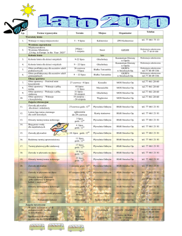 Lp. Forma wypoczynku Termin Miejsce Organizator 5 - 9 lipiec Kalinowice ZPO Kalinowice Soest GZOiW Telefon Warsztaty letnie 1. Wakacje w mojej miejscowości 2. Wymiana zagraniczna Międzynarodowa Wymiana Młodzieży„Living in Europe in the Year 2025” Kolonie letnie 24lipca – 1 sierpnia 3. Kolonie letnie dla dzieci miejskich 9-22 lipca Głuchołazy 4. Kolonie letnie dla dzieci wiejskich 9 – 22 lipca Głuchołazy Obóz profilaktyczny dla uczniów szkół podstawowych Obóz profilaktyczny dla uczniów szkół gimnazjalnych Obozy sportowe Obóz sportowy – Festiwal mini koszykówki Obóz sportowy – Wakacje z piłką nożną Obóz sportowy - Wakacje z piłką siatkową Obóz sportowy – Wakacje z koszykówką Zajęcia rekreacyjne 26 czerwca – 9 lipca Białka Tatrzańska 5. 6. 7. 8. 9. 10. tel. 77 461 75 13 Rekrutacja zakończona Tel. 77 40 49 400 lato Kuratorium Oświaty w Opolu Kuratorium Oświaty w Opolu GKRPA w Strzelcach Op. GKRPA w Strzelcach Op. Rekrutacja zakończona Rekrutacja zakończona Rekrutacja zakończona tel.77 40 49 336 Rekrutacja zakończona 9 – 22 lipca Białka Tatrzańska 27 czerwca - 8 lipca Koszalin MOS Strzelce Op. tel.77 461 20 60 Murzasichle MOS Strzelce Op. tel.77 461 20 60 Głuchołazy MOS Strzelce Op. tel.77 461 20 60 Węglowice MOS Strzelce Op. tel.77 461 20 60 27czerwca godz. 1200 Pływalnia Odkryta RSiR Strzelce Op. tel. 77 461 21 81 zgłoszenia do 29 czerwca Korty tenisowe RSiR Strzelce Op. tel. 77 461 21 81 05.lipiec - 11 lipca 31 lipiec – 10 sierpień 10 sierpnia – - 20 sierpnia tel.77 40 49 336 11. Zawody pływackie dla dzieci i młodzieży 12. Letnia liga tenisa ziemnego dla osób dorosłych. 13. Otwarty turniej tenisa stołowego 3 lipca godz. 1200 Pływalnia Odkryta RSiR Strzelce Op. tel. 77 461 21 81 14. Bieg przez wodę dla najmłodszych 4 lipca godz. 1200 Pływalnia Odkryta RSiR Strzelce Op. tel. 77 461 21 81 10 .lipca godz. 1200 Pływalnia Odkryta RSiR Strzelce Op. tel. 77 461 21 81 15. Zawody pływackie 16. Rodzinny turniej sprawnościowy 11 lipca godz. 1200 Pływalnia Odkryta RSiR Strzelce Op. tel. 77 461 21 81 17. Turniej plażowej piłki siatkowej 17 lipca godz. 1200 Pływalnia Odkryta RSiR Strzelce Op. tel. 77 461 21 81 18. Zawody w pływaniu na dętce 18 lipca godz. 1200 Pływalnia Odkryta RSiR Strzelce Op. tel. 77 461 21 81 19. Otwarty turniej tenisa stołowego 25 lipca godz. 1200 Pływalnia Odkryta RSiR Strzelce Op. tel. 77 461 21 81 20. Zawody pływackie 1 sierpnia godz. 1200 Pływalnia Odkryta RSiR Strzelce Op. tel. 77 461 21 81 21. Zawody w pływaniu na dętce 07 sierpnia godz. 1200 Pływalnia Odkryta RSiR Strzelce Op. tel. 77 461 21 81 22. Otwarty turniej plażowej piłki siatkowej w kategorii kobiet i mężczyzn* 15 sierpnia godz. 1200 Pływalnia Odkryta RSiR Strzelce Op. tel. 77 461 21 81 23. Otwarty turniej tenisa stołowego 22 sierpnia godz. 1200 Pływalnia Odkryta RSiR Strzelce Op. tel. 77 461 21 81 24. Letnia szkółka nauki pływania 19 lipiec – 30 lipca Pływalnia Odkryta MOS Strzelce Op. tel.77 461 20 60 25. Pożegnanie wakacji 30 sierpień Stadion Miejski MOS Strzelce Op. tel.77 461 20 60 11 – 16 lipiec Jarnołtówek GZOiW / SSnRREL Rekrutacja zakończona 16 lipiec 20 sierpień Krasiejów zapisy do 9lipca i do 13 sierpnia GZOiW Zajęcia turystyczne Wyjazd uczniów ze szkół 26. podstawowych na obóz w Jarnołtówku 27. Spotkania z dinozaurami wycieczka do DINOPARKU tel.77 40 49 400 tel.77 40 49 400