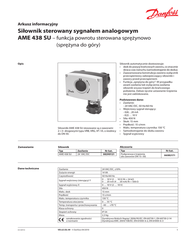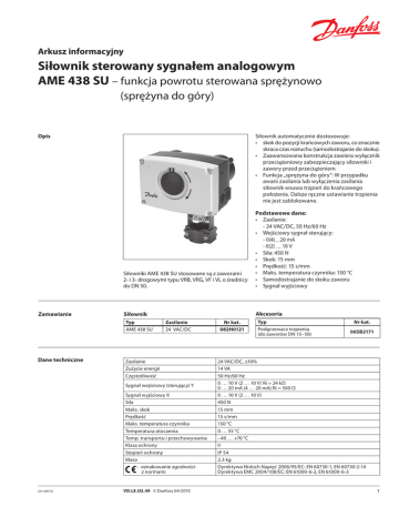 Arkusz informacyjny Siłownik sterowany sygnałem analogowym AME 438 SU – funkcja powrotu sterowana sprężynowo (sprężyna do góry) Opis Zamawianie Siłownik automatycznie dostosowuje: • skok do pozycji krańcowych zaworu, co znacznie skraca czas rozruchu (samodostrajanie do skoku). • Zaawansowana konstrukcja zawiera wyłącznik przeciążeniowy zabezpieczający siłowniki i zawory przed przeciążeniem • Funkcja „sprężyna do góry”: W przypadku awarii zasilania lub wyłączenia zasilania siłownik wsuwa trzpień do krańcowego położenia. Dalsze ręczne ustawianie trzpienia nie jest zablokowane. Siłowniki AME 438 SU stosowane są z zaworami 2- i 3- drogowymi typu VRB, VRG, VF i VL o średnicy do DN 50. Podstawowe dane: • Zasilanie: - 24 VAC/DC, 50 Hz/60 Hz • Wejściowy sygnał sterujący: - 0(4)…20 mA - 0(2) … 10 V • Siła: 450 N • Skok: 15 mm • Prędkość: 15 s/mm • Maks. temperatura czynnika: 150 °C • Samodostrajanie do skoku zaworu • Sygnał wyjściowy Siłownik Akcesoria Typ AME 438 SU Dane techniczne Zasilanie 24 VAC/DC Zasilanie Zużycie energii Częstotliwość Sygnał wejściowy (sterujący) Y Sygnał wyjściowy X Siła Maks. skok Prędkość Maks. temperatura czynnika Temperatura otoczenia Temp. transportu i przechowywania Klasa ochrony Stopień ochrony Masa - oznakowanie zgodności z normami DH-SMT/SI VD.LE.O2.49 © Danfoss 04/2010 Nr kat. 082H0121 Typ Podgrzewacz trzpienia (do zaworów DN 15–50) Nr kat. 065B2171 24 VAC/DC, ±10% 14 VA 50 Hz/60 Hz 0 … 10 V (2 … 10 V) Ri = 24 kΩ 0 … 20 mA (4 … 20 mA) Ri = 500 Ω 0 … 10 V (2 … 10 V) 450 N 15 mm 15 s/mm 150 °C 0 … 55 °C –40 … +70 °C II IP 54 2,3 kg Dyrektywa Niskich Napięć 2006/95/EC: EN 60730-1, EN 60730-2-14 Dyrektywa EMC 2004/108/EC: EN 61000-6-2, EN 61000-6-3 1 Arkusz informacyjny Siłownik sterowany sygnałem analogowym AME 438 SU Montaż Mechaniczny Aby zamontować siłownik na zaworze, należy użyć klucza inbusowego 4 mm (nie jest dostarczany z siłownikiem). Dopuszczalny jest montaż zaworu z siłownikiem skierowanym poziomo lub w górę. Nie zezwala się na montaż z siłownikiem skierowanym w dół. Siłownika nie wolno montować w atmosferze wybuchowej ani w miejscach, w których temperatura otoczenia jest niższa niż 0°C lub wyższa niż 55°C. Siłownik nie może być narażony na działanie strumieni pary, strumieni wody ani kapiącej cieczy. Uwaga: po poluzowaniu elementu ustalającego można obracać siłownik do 360° względem trzpienia zaworu. Po ustawieniu siłownika należy dokręcić element ustalający. Elektryczny Dostęp do podłączeń elektrycznych można uzyskać po zdjęciu pokrywy siłownika. Do zamontowania dławnic kablowych przygotowane są dwa wloty dławnic kablowych z gwintem (M20 x 1,5 i M16 x 1,5). Uwaga: Kabel i dławnica kablowa nie mogą obniżać stopnia ochrony IP siłownika i muszą zapewniać pełne odciążenie złączy. Należy przestrzegać również lokalnych przepisów i wytycznych. Podłączenia elektryczne Wersja tylko na 24 V AC/DC Podłączenia dla sterowania analogowego (przełącznik nr 6 w pozycji OFF (Wył.) — ustawienie fabryczne) SP 24 VAC/DC............................................ Zasilanie SN 0 V .......................................................... Wspólny Y X 0 … 10 V.............................. Sygnał wejściowy (2 … 10 V) 0 … 20 mA (4 … 20 mA) 0 … 10 V.............................. Sygnał wyjściowy (2 … 10 V) Złomowanie Przed złomowaniem siłownik należy rozłożyć na części i posortować na różne grupy materiałowe. 2 VD.LE.O2.49 © Danfoss 04/2010 Podłączenia dla sterowania 3-punktowego. (przełącznik nr 6 w pozycji ON (Wł.)) Długość przewodu 0-50 m > 50 m Zalecany przewód o przekroju 0.75 mm2 1.5 mm2 DH-SMT/SI Arkusz informacyjny Siłownik sterowany sygnałem analogowym AME 438 SU Uruchamianie Po zakończeniu montażu mechanicznego i elektrycznego należy ustawić przełączniki DIP i przeprowadzić konieczne kontrole i testy: • Włącz zasilanie Należy zauważyć, że w tym momencie zostanie uruchomiona funkcja automatycznego samodostrajania do skoku zaworu. • Włącz odpowiedni sygnał sterujący i sprawdź, czy: - kierunek ruchu trzpienia zaworu jest prawidłowy oraz - siłownik steruje zaworem na całej długości skoku. Urządzenie jest teraz w pełni uruchomione. Funkcja automatycznego samodostrajania do skoku zaworu Siłownik automatycznie dostosowuje skok do pozycji krańcowych zaworu: - po włączeniu zasilania po raz pierwszy lub - później, w wyniku zmiany ustawienia przełącznika DIP nr 9 (z pozycji OFF (Wył.) do pozycji ON (Wł.) i z powrotem do pozycji OFF (Wył.)) Testowanie pełnej długości skoku zaworu Aby zmusić siłownik do przejścia do pozycji pełnego otwarcia lub pełnego zamknięcia (w zależności od rodzaju zaworu), należy połączyć zacisk SN z zaciskiem 1 lub 3. Ustawienie przełącznika DIP SW 3 Przełączniki DIP • SW1: U/I - wybór rodzaju sygnału wejściowego: - Jeśli ustawiony jest w pozycji OFF, wybrany jest sygnał wejściowy napięciowy. - Jeśli ustawiony jest w pozycji ON, wybrany jest sygnał wejściowy prądowy. • SW2: 2/0 — wybór zakresu sygnału wejściowego: - Jeśli ustawiony jest w pozycji OFF, wybrany jest sygnał wejściowy w zakresie od 2-10 V (wejście napięciowe) lub w zakresie od 4-20 mA (wejście prądowe). - Jeśli ustawiony jest w pozycji ON, wybrany jest sygnał wejściowy w zakresie od 0-10 V (wejście napięciowe) lub w zakresie od 0-20 mA (wejście prądowe). • SW3: D/I — wybór kierunku działania siłownika zgodny lub przeciwny: - Jeśli ustawiony jest w pozycji OFF, siłownik pracuje w kierunku zgodnym (trzpień wysuwa się wraz ze wzrostem napięcia). - Jeśli ustawiony jest w pozycji ON, siłownik pracuje w kierunku przeciwnym (trzpień wsuwa się wraz ze wzrostem napięcia). • SW4: -/Seq — wybór pracy w trybie normalnym lub sekwencyjnym - Jeśli ustawion