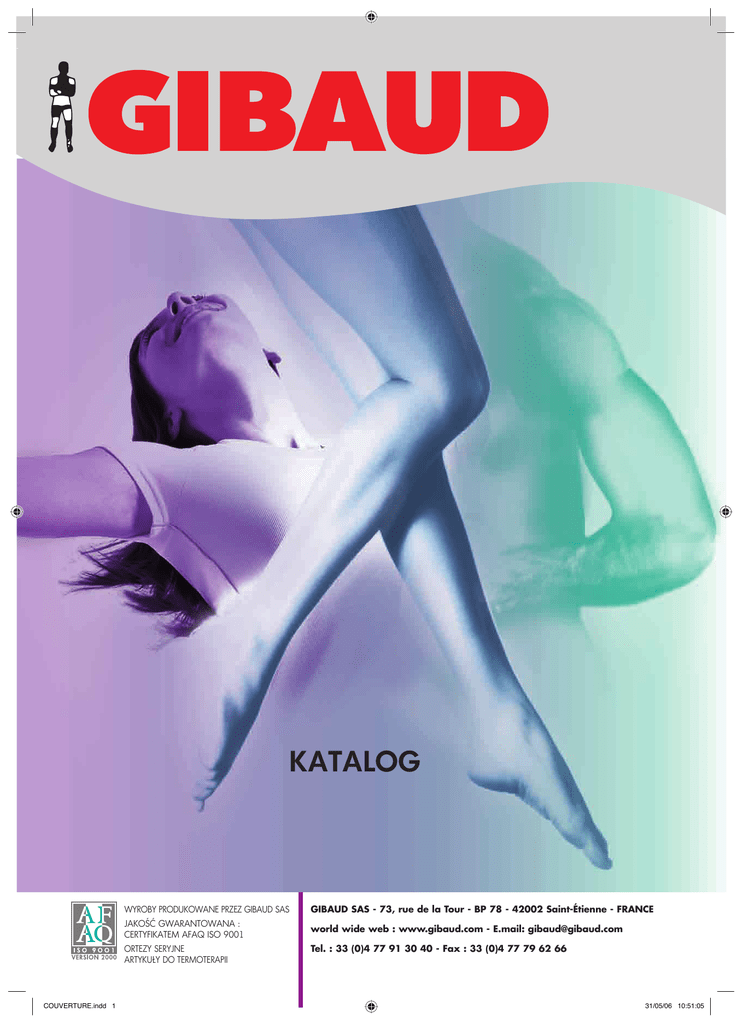 KATALOG WYROBY PRODUKOWANE PRZEZ GIBAUD SAS GIBAUD SAS - 73, rue de la Tour - BP 78 - 42002 Saint-Étienne - FRANCE JAKOŚĆ GWARANTOWANA : CERTYFIKATEM AFAQ ISO 9001 world wide web : www.gibaud.com - E.mail: [email protected] ORTEZY SERYJNE ARTYKUŁY DO TERMOTERAPII COUVERTURE.indd 1 Tel. : 33 (0)4 77 91 30 40 - Fax : 33 (0)4 77 79 62 66 31/05/06 10:51:05 SPIS TREŚCI B G L O P R S COUVERTURE.indd 2 SERIA ORTOPEDYCZNA SERIA KOMFORT I WYGODA GAMA FLEBOLOGICZNA BANDAŻE ELASTYCZNE ……………………………………………………………………………………………………… Str.12 - 13 BANDAŻE UCISKOWE ………………………………………………………………………………………………………………… Str.35 GAMA FLEBOLOGICZNA …………………………………………………………………………………………………………… Str.33 GAMA OPASEK STABILIZUJĄCYCH DO STOSOWANIA BEZ PRZEPISU LEKARZA ……… Str.32 LINIA “TECHNICAL WEAR” ………………………………………………………………………………………………… Str.30 - 31 ODCINEK LĘDŹWIOWO-KRZYŻOWY KRĘGOSŁUPA …………………………………………………………… Str.6 ODCINEK SZYJNY KRĘGOSŁUPA ………………………………………………………………………………………………… Str.4 ORTEZY RAMIENNE (SO) …………………………………………………………………………………………………… Str.14 - 15 ORTEZY RĘKI I NADGARSTKA (ORTEZY NADGARSTKOWO-RĘCZNE WHO) …… Str.20 - 21 ORTEZY STABILIZUJĄCE STAWU SKOKOWEGO (AFO)……………………………………………… Str.27 – 28 ORTEZY STAWU KOLANOWEGO (KO) ………………………………………………………………………………… Str.24 ORTEZY STAWU KOLANOWEGO, TUTORY STAWU KOLANOWEGO ……………………… Str.25 ORTEZY STAWU ŁOKCIOWEGO (EO) …………………………………………………………………………………… Str.17 ORTEZY STOSOWANE W REUMATOLOGII DO STABILIZACJI PRZEDRAMIENNO-DŁONIOWEJ ……………………………………………………………………………………… Str.18 - 19 ORTEZY SZYJNE (CO) ……………………………………………………………………………………………………………………… Str.5 ORTEZY TUŁOWIA ………………………………………………………………………………………………………………………… Str.12 ORTEZY UDA I KOLANA (KO) …………………………………………………………………………………………………… Str.23 PASY BRZUSZNE I ORTEZY LĘDŹWIOWO-KRZYŻOWE (LSO) …………………………………… Str.7 - 10 PASY PRZEPUKLINOWE - AKCESORIA …………………………………………………………………………………… Str.11 PASY ŻEBROWE, TEMBLAKI………………………………………………………………………………………………………… Str.13 PODPIĘTKI, ORTEZY STOPY ………………………………………………………………………………………………………… Str.28 POŃCZOCHY I RAJSTOPY ACTIVLINE® ………………………………………………………………………… Str.35 - 36 RAJSTOPY, POŃCZOCHY I SKARPETKI PODTRZYMUJĄCE WSPOMAGAJĄCE ODPŁYW KRWI ŻYLNEJ ………………………………………………………………… Str.36 - 37 SERIA KOMFORT I WYGODA …………………………………………………………………………………………………… Str.29 SERIA ORTOPEDYCZNA ………………………………………………………………………………………………………………… Str.3 STAW KOLANOWY ……………………………………………………………………………………………………………………… Str.22 STAW ŁOKCIOWY ………………………………………………………………………………………………………………………… Str.16 STAW RAMIENNY ………………………………………………………………………………………………………………………… Str.14 STAW SKOKOWY ………………………………………………………………………………………………………………………… Str.26 31/05/06 10:51:09 www.gibaud.com COUVERTURE.indd 3 31/05/06 10:51:11 W POLSCE GIBAUD REPREZENTUJE : COUVERTURE.indd 4 Firma GIBAUD zastrzega sobie możliwość dokonania zmian oferowanego asortymentu bez uprzedzenia GIBAUD®. Powielanie zabronione. Model zastrzeżony. Francja eksport - CATPOL GIBAUD, GRUPA O ZASIĘGU MIĘDZYNARODOWYM. Obecna w 50 krajach, reprezentowana przez swoje filie i autoryzowanych przedstawicieli. Produkty GIBAUD są znane na całym świecie. Zyskały one uznanie milionów pacjentów, którzy docenili ich jakość i estetykę wykonania. 31/05/06 10:51:16 REUMATOLOGIA – TRAUMATOLOGIA SERIA ORTOPEDYCZNA 3 colliers cervicaux-3-5.indd 3 31/05/06 11:49:05 ODCINEK SZYJNY KREGOSŁUPA PATOLOGIA URAZOWA ZASTOSOWANIE > Natychmiastowy efekt termiczny (rozgrzanie tkanek okołokręgosłupowych). > Zaawansowane zmiany zwyrodnieniowe w odcinku szyjnym kręgosłupa. (POURAZOWE DYSFUNKCJE ODCINKA SZYJNEGO KRĘGOSŁUPA, SKUTKI UPADKU, URAZY BEZPOŚREDNIE) WYPADKI NAGŁE (PRZED ZDIAGNOZOWANIEM) > Kręcz szyi (osoby młode). > Zespół bolesnego barku. C5 C5 D1 C7 > Uraz wielopoziomowy. > Stabilizacja podczas hospitalizacji. D1 C6 C6 C8 Kołnierz rozgrzewający z okładem GIB’HOT Kołnierz GIBORTHO C1 (typ Schantz) C8 Kołnierz GIBORTHO C2 (typ Florida) Wyczepialna pelota poliuretanowa zwiększajaca stabilizację C7 Kołnierz CERVIGIB C2 (typ Florida) Możliwość regulacji stopnia stabilizacji w zależności od rodzaju dysfun