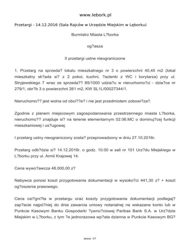 www.lebork.pl Przetargi - 14.12.2016 (Sala Rajców w Urzędzie Miejskim w Lęborku) Burmistrz Miasta L?borka og?asza II przetargi ustne nieograniczone 1. Przetarg na sprzeda? lokalu mieszkalnego nr 3 o powierzchni 40,45 m2 (lokal mieszkalny sk?ada si? z 2 pokoi, kuchni, ?azienki z WC i korytarza) przy ul. Stryjewskiego 7 wraz ze sprzeda?? 85/1000 udzia?u w nieruchomo?ci - dzia?ce nr 279/1, obr?b 3 o powierzchni 261 m2, KW SL1L/00027344/1. Nieruchomo?? jest wolna od obci??e? i nie jest przedmiotem zobowi?za?. Zgodnie z planem miejscowym zagospodarowania przestrzennego miasta L?borka, nieruchomo?? znajduje si? na terenie elementarnym 02.06.MC o dominuj?cej funkcji mieszkaniowej i us?ugowej. I przetarg ustny nieograniczony zosta? przeprowadzony w dniu 27.10.2016r. Przetarg odb?dzie si? 14.12.2016r. o godz. 10.00 w sali nr 101 Urz?du Miejskiego w L?borku przy ul. Armii Krajowej 14. Cena wywo?awcza 48.000,00 z? Nabywca ponosi koszt przygotowania dokumentacji w wysoko?ci 441,30 z? + koszt og?oszenia prasowego. Cena osi?gni?ta w przetargu oraz koszty przygotowania dokumentacji podlegaj? zap?acie najpó?niej do dnia zawarcia umowy notarialnej na wskazane konto lub w Punkcie Kasowym Banku Gospodarki ?ywno?ciowej Paribas Bank S.A. w Urz?dzie Miejskim w L?borku, z tym ?e jednorazowa wp?ata dzienna w Punkcie Kasowym BG? strona 1/7 Paribas S.A. nie mo?e przekroczy? kwoty równej 15 ty?. euro. Lokal posiada ?wiadectwo charakterystyki energetycznej. Warunkiem uczestnictwa w przetargu jest wp?acenie wadium w wysoko?ci 5.000,00 z?. 2. Przetarg na sprzeda? lokalu mieszkalnego nr 60 o powierzchni 24,30 m2 (lokal mieszkalny sk?ada si? z 1 pokoju, przedpokoju z wn?k? kuchenn?, ?azienki z WC) przy ul. Orzeszkowej 3 wraz z oddaniem w u?ytkowanie wieczyste 116/10000 udzia?u w nieruchomo?ci - dzia?ce nr 384/2, obr?b 3 o powierzchni 543 m2, KW SL1L/00012351/5. Nieruchomo?? jest wolna od obci??e? i nie jest przedmiotem zobowi?za?. Udzia? w gruncie zostanie oddany w u?ytkowanie wieczyste do dnia 14.03.2101r. Zgodnie z planem miejscowym zagospodarowania przestrzennego miasta L?borka, nieruchomo?? znajduje si? na terenie elementarnym 9.MC.23 o przeznaczeniu - tereny zabudowy mieszkaniowej i us?ugowej. I przetarg ustny nieograniczony zosta? przeprowadzony w dniu 27.10.2016r. Przetarg odb?dzie si? 14.12.2016r. o godz. 10.30 w sali nr 101 Urz?du Miejskiego w L?borku przy ul. Armii Krajowej 14. Cena wywo?awcza 45.000,00 z? w tym: cena lokalu 44.252,00 z? (98,34 % ceny wywo?awczej) cena udzia?u w dzia?ce 748,00 z? ( 1,66 % ceny wywo?awczej) Nabywca ponosi koszt przygotowania dokumentacji w wysoko?ci 514,78 z? + koszt og?oszenia prasowego. Nabywca zobowi?zany jest do zap?aty wylicytowanej w przetargu ceny nieruchomo?ci, strona 2/7 na któr? sk?adaj? si? cena lokalu oraz pierwsza op?ata z tytu?u oddania gruntu w u?ytkowanie wieczyste. Cena lokalu stanowi 98,34 % wylicytowanej ceny nieruchomo?ci. Pierwsza op?ata z tytu?u oddania gruntu w u?ytkowanie wieczyste stanowi 25% wylicytowanej ceny przynale?nego do lokalu udzia?u w gruncie. Cena udzia?u w gruncie wynosi 1,66 % wylicytowanej ceny nieruchomo?ci. Do pierwszej op?aty zostanie doliczony 23% podatek VAT. Cena lokalu, pierwsza op?ata z tytu?u oddania gruntu w u?ytkowanie wieczyste wraz z podatkiem VAT oraz nale?no?? za poniesione koszty przygotowania dokumentacji podlegaj? zap?acie najpó?niej do dnia zawarcia umowy notarialnej na wskazane konto lub w Punkcie Kasowym Banku Gospodarki ?ywno?ciowej w Urz?dzie Miejskim w L?borku, z tym ?e jednorazowa wp?ata dzienna w kasie nie mo?e przekroczy? kwoty równej 15 ty?. euro. Lokal posiada ?wiadectwo charakterystyki energetycznej. Warunkiem uczestnictwa w przetargu jest wp?acenie wadium w wysoko?ci 5.000,00 z?. 3. Przetarg na sprzeda? lokalu mieszkalnego nr 7 o powierzchni 39,05 m2 (lokal mieszkalny sk?ada si? z 2 pokoi, kuchni) przy ul. Syrokomli 41 wraz z oddaniem w u?ytkowanie wieczyste 85/1000 udzia?u w nieruchomo?ci - dzia?ce nr 111, obr?b 4 o powierzchni 226 m2, KW SL1L/00012120/7. Udzia? w gruncie zostanie oddany w u?ytkowanie wieczyste do dnia 23.07.2098r. Nieruchomo?? jest wolna od obci??e? i nie jest przedmiotem zobowi?za?. Zgodnie z planem miejscowym zagospodarowania przestrzennego miasta L?borka nieruchomo?? znajduje si? na terenie elementarnym 07.07.MC o dominuj?cej funkcji mieszkaniowej i us?ugowej. I przetarg ustny nieograniczony zosta? przeprowadzony 25.10.2016r. strona 3/7 Przetarg odb?dzie si? 14.12.2016r. o godz. 11.00 w sali nr 101 Urz?du Miejskiego w L?borku przy ul. Armii Krajowej 14. Cena wywo?awcza 43.000,00 z? w tym: cena lokalu 41.596,00 z? (96,73 % ceny wywo?awczej) cena udzia?u w dzia?ce 1.404,00 z? ( 3,27 % ceny wywo?awczej) Nabywca ponosi koszt przygotowania dokumentacji w wysoko?ci 514,39 z? + koszt og?oszenia prasowego. Nabywca zobowi?zany jest do zap?aty wylicytowanej w przetargu ceny nieruchomo?ci, na któr? sk?adaj? si? cena lokalu oraz pierwsza op?ata z tytu?u oddania gruntu w u?ytkowanie wieczyste. Cena lokalu stanowi 96,73 % wylicytowanej ceny nieruchomo?ci. Pierwsza op?ata z tytu?u oddania gruntu w u?ytkowanie wieczyste stanowi 25% wylicytowanej ceny przynale?nego do lokalu udzia?u w gruncie. Cena udzia?u w gruncie wynosi 3,27 % wylicytowanej ceny nieruchomo?ci. Do pierwszej op?aty zostanie doliczony 23% podatek VAT. Cena lokalu, pierwsza op?ata z tytu?u oddania gruntu w u?ytkowanie wieczyste wraz z podatkiem VAT oraz nale?no?? za poniesione koszty przygotowania dokumentacji podlegaj? zap?acie najpó?niej do dnia zawarcia umowy notarialnej na wskazane konto lub w Punkcie Kasowym Banku Gospodarki ?ywno?ciowej Paribas Bank S.A. w Urz?dzie Miejskim w L?borku, z tym ?e jednorazowa wp?ata dzienna w kasie nie mo?e przekroczy? kwoty równej 15 ty?. euro. strona 4/7 Lokal nie posiada ?wiadectwa charakterystyki energetycznej. Zbywca nie przed?o?y do umowy ani po umowie notarialnej takiego ?wiadectwa, a jego ewentualne sporz?dzenie mo?e nast?pi? wy??cznie na koszt w?asny nabywcy. Warunkiem uczestnictwa 