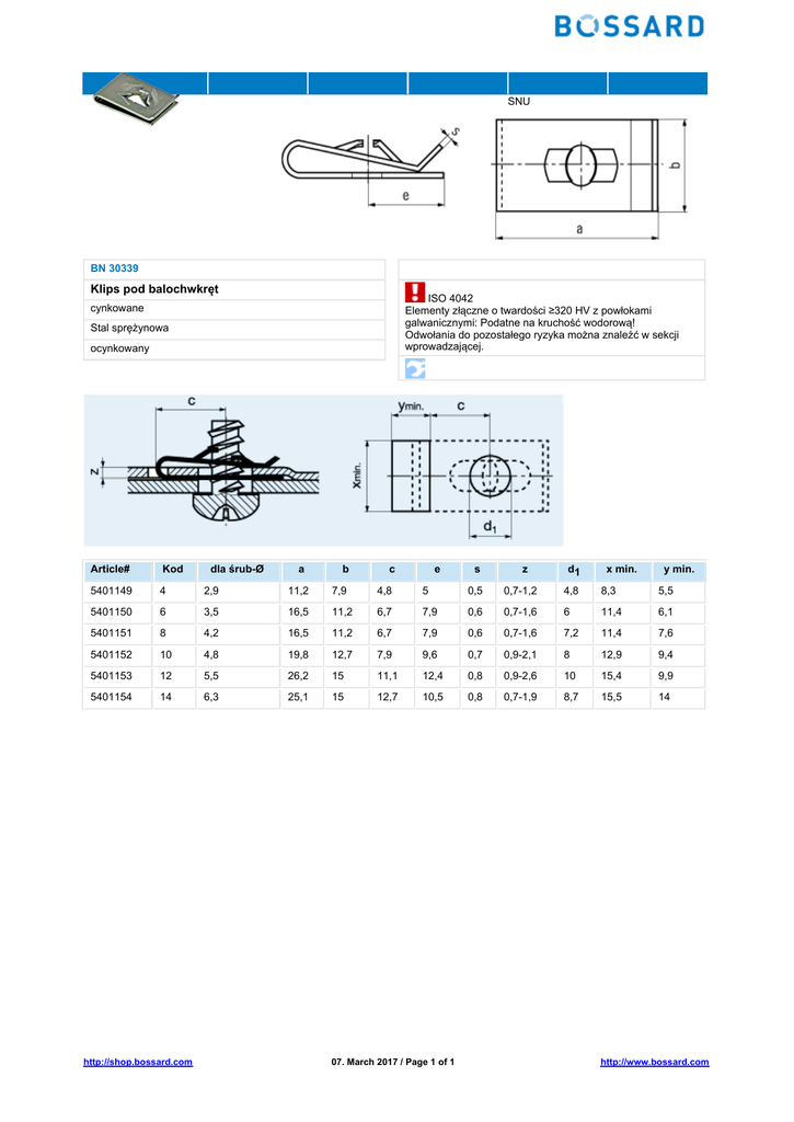 BN 30339 SNU Klips pod balochwkręt ISO 4042 Elementy złączne o twardości ≥320 HV z powłokami galwanicznymi: Podatne na kruchość wodorową! Odwołania do pozostałego ryzyka można znaleźć w sekcji wprowadzającej. cynkowane Stal sprężynowa ocynkowany Article# Kod b c 5401149 4 2,9 11,2 7,9 4,8 5 0,5 0,7-1,2 4,8 8,3 5,5 5401150 6 3,5 16,5 11,2 6,7 7,9 0,6 0,7-1,6 6 11,4 6,1 5401151 8 4,2 16,5 11,2 6,7 7,9 0,6 0,7-1,6 7,2 11,4 7,6 5401152 10 4,8 19,8 12,7 7,9 9,6 0,7 0,9-2,1 8 12,9 9,4 5401153 12 5,5 26,2 15 11,1 12,4 0,8 0,9-2,6 10 15,4 9,9 5401154 14 6,3 25,1 15 12,7 10,5 0,8 0,7-1,9 8,7 15,5 14 http://shop.bossard.com dla śrub-Ø a e 07. March 2017 / Page 1 of 1 s z d1 x min. y min. http://www.bossard.com