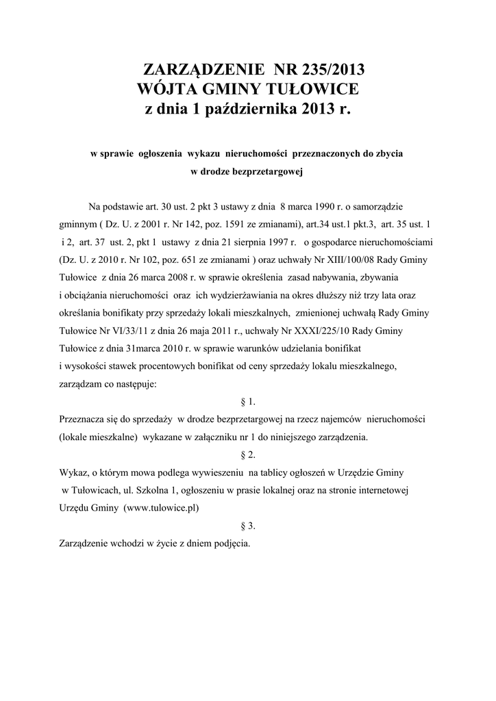 ZARZĄDZENIE NR 235/2013 WÓJTA GMINY TUŁOWICE z dnia 1