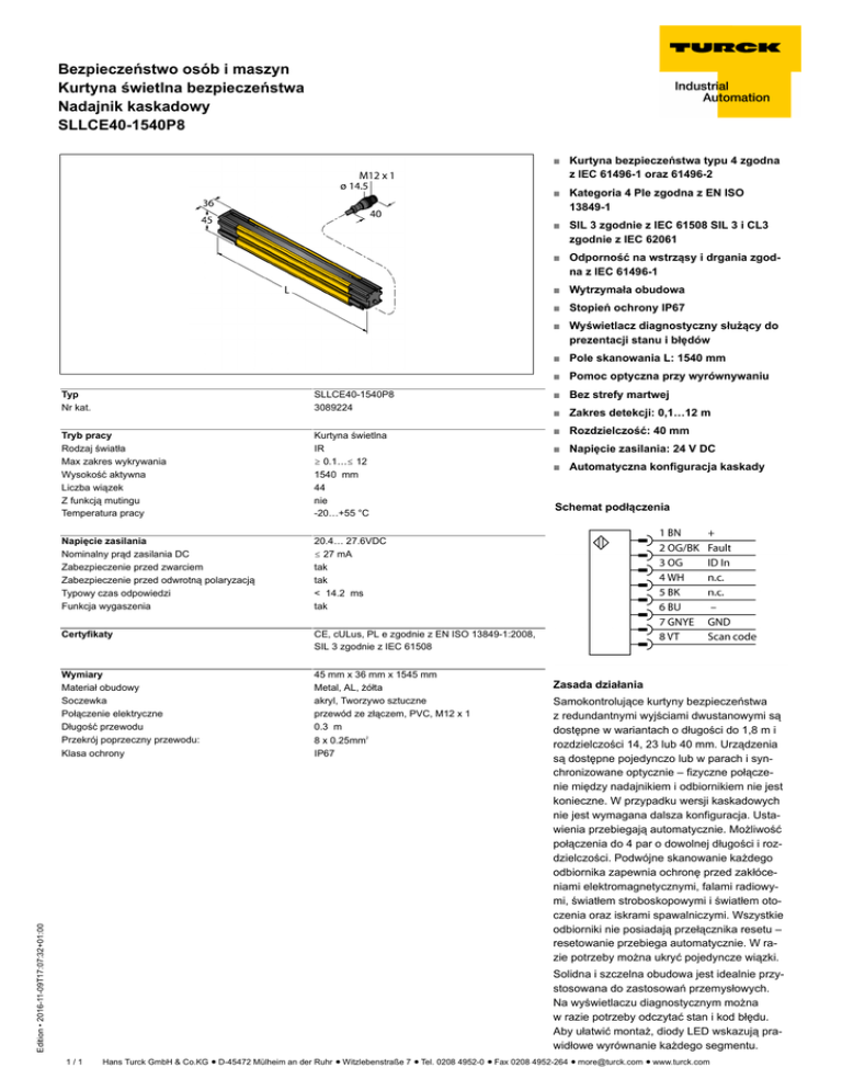 Bezpieczeństwo osób i maszyn Kurtyna świetlna bezpieczeństwa Nadajnik kaskadowy SLLCE40-1540P8 ■ Kurtyna bezpieczeństwa typu 4 zgodna z IEC 61496-1 oraz 61496-2 ■ Kategoria 4 Ple zgodna z EN ISO 13849-1 ■ SIL 3 zgodnie z IEC 61508 SIL 3 i CL3 zgodnie z IEC 62061 ■ Odporność na wstrząsy i drgania zgodna z IEC 61496-1 ■ Wytrzymała obudowa ■ Stopień ochrony IP67 ■ Wyświetlacz diagnostyczny służący do prezentacji stanu i błędów ■ Pole skanowania L: 1540 mm ■ Pomoc optyczna przy wyrównywaniu Typ Nr kat. SLLCE40-1540P8 3089224 Tryb pracy Rodzaj światła Max zakres wykrywania Wysokość aktywna Liczba wiązek Z funkcją mutingu Temperatura pracy Kurtyna świetlna IR ï 0.1…ð 12 1540 mm 44 nie -20…+55 °C Napięcie zasilania Nominalny prąd zasilania DC Zabezpieczenie przed zwarciem Zabezpieczenie przed odwrotną polaryzacją Typowy czas odpowiedzi Funkcja wygaszenia 20.4… 27.6VDC ð 27 mA tak tak < 14.2 ms tak Certyfikaty CE, cULus, PL e zgodnie z EN ISO 13849-1:2008, SIL 3 zgodnie z IEC 61508 Wymiary Materiał obudowy Soczewka Połączenie elektryczne Długość przewodu Przekrój poprzeczny przewodu: 45 mm x 36 mm x 1545 mm Metal, AL, żółta akryl, Tworzywo sztuczne przewód ze złączem, PVC, M12 x 1 0.3 m Edition • 2016-11-09T17:07:32+01:00 Klasa ochrony 8 x 0.25mm IP67 2 ■ Bez strefy martwej ■ Zakres detekcji: 0,1…12 m ■ Rozdzielczość: 40 mm ■ Napięcie zasilania: 24 V DC ■ Automatyczna konfiguracja kaskady Schemat podłączenia Zasada działania Samokontrolujące kurtyny bezpieczeństwa z redundantnymi wyjściami dwustanowymi są dostępne w wariantach o długości do 1,8 m i rozdzielczości 14, 23 lub 40 mm. Urządzenia są dostępne pojedynczo lub w parach i synchronizowane optycznie – fizyczne połączenie między nadajnikiem i odbiornikiem nie jest konieczne. W przypadku wersji kaskadowych nie jest wymagana dalsza konfiguracja. Ustawienia przebiegają automatycznie. Możliwość połączenia do 4 par o dowolnej długości i rozdzielczości. Podwójne skanowanie każdego odbiornika zapewnia ochronę przed zakłóceniami elektromagnetycznymi, falami radiowymi, światłem stroboskopowymi i światłem otoczenia oraz iskrami spawalniczymi. Wszystkie odbiorniki nie posiadają przełącznika resetu – resetowanie przebiega automatycznie. W razie potrzeby można ukryć pojedyncze wiązki. Solidna i szczelna obudowa jest idealnie przystosowana do zastosowań przemysłowych. Na wyświetlaczu diagnostycznym można w razie potrzeby odczytać stan i kod błędu. Aby ułatwić montaż, diody LED wskazują prawidłowe wyrównanie każdego segmentu. 1/1 Hans Turck GmbH & Co.KG ñ D-45472 Mülheim an der Ruhr ñ Witzlebenstraße 7 ñ Tel. 0208 4952-0 ñ Fax 0208 4952-264 ñ [email protected] ñ www.turck.com