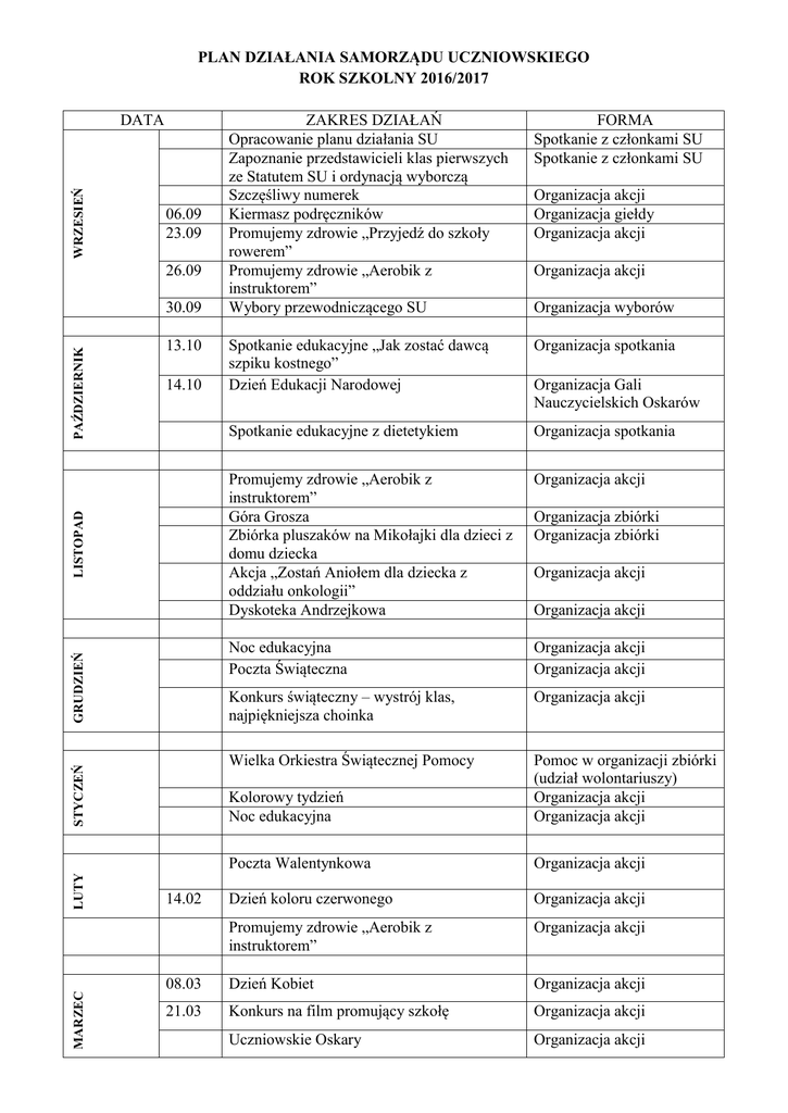 PLAN DZIAŁANIA SAMORZĄDU UCZNIOWSKIEGO ROK SZKOLNY 2016/2017 ZAKRES DZIAŁAŃ Opracowanie planu działania SU Zapoznanie przedstawicieli klas pierwszych ze Statutem SU i ordynacją wyborczą Szczęśliwy numerek Kiermasz podręczników Promujemy zdrowie „Przyjedź do szkoły rowerem” Promujemy zdrowie „Aerobik z instruktorem” Wybory przewodniczącego SU FORMA Spotkanie z członkami SU Spotkanie z członkami SU Spotkanie edukacyjne „Jak zostać dawcą szpiku kostnego” Dzień Edukacji Narodowej Organizacja spotkania Spotkanie edukacyjne z dietetykiem Organizacja spotkania Promujemy zdrowie „Aerobik z instruktorem” Góra Grosza Zbiórka pluszaków na Mikołajki dla dzieci z domu dziecka Akcja „Zostań Aniołem dla dziecka z oddziału onkologii” Dyskoteka Andrzejkowa Organizacja akcji Noc edukacyjna Poczta Świąteczna Organizacja akcji Organizacja akcji Konkurs świąteczny – wystrój klas, najpiękniejsza choinka Organizacja akcji Wielka Orkiestra Świątecznej Pomocy Kolorowy tydzień Noc edukacyjna Pomoc w organizacji zbiórki (udział wolontariuszy) Organizacja akcji Organizacja akcji Poczta Walentynkowa Organizacja akcji Dzień koloru czerwonego Organizacja akcji Promujemy zdrowie „Aerobik z instruktorem” Organizacja akcji 08.03 Dzień Kobiet Organizacja akcji 21.03 Konkurs na film promujący szkołę Organizacja akcji Uczniowskie Oskary Organizacja akcji WRZESIEŃ DATA 06.09 23.09 26.09 13.10 14.10 MARZEC LUTY STYCZEŃ GRUDZIEŃ LISTOPAD PAŹDZIERNIK 30.09 14.02 Organizacja akcji Organizacja giełdy Organizacja akcji Organizacja akcji Organizacja wyborów Organizacja Gali Nauczycielskich Oskarów Organizacja zbiórki Organizacja zbiórki Organizacja akcji Organizacja akcji KWIECIEŃ Egzamin gimnazjalny Dzień dobrego humoru – przebieranki Pożegnanie maturzystów – Ostatni dzwonek Promujemy zdrowie „Przyjedź do szkoły rowerem” CZERWIEC MAJ Matury Kiermasz ciast – zbiórka pieniędzy na zakup słodyczy na dzień dziecka dla dzieci z oddziału onkologii Pomoc w organizacji dyżurów Organizacja akcji Organizacja Pomoc w organizacji dyżurów Organizacja akcji Dzień Dziecka – Teleturniej „Czar par” Organizacja dnia Sport kontra uzależnienie Pomoc w organizacji Zakończenie roku szkolnego Przemówienie przewodniczącego SU