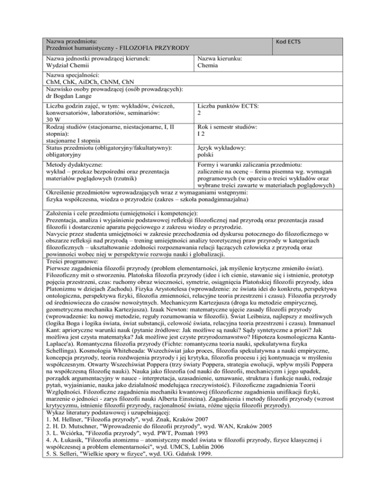Kod ECTS Nazwa przedmiotu: Przedmiot humanistyczny - FILOZOFIA PRZYRODY Nazwa jednostki prowadzącej kierunek: Wydział Chemii Nazwa kierunku: Chemia Nazwa specjalności: ChM, ChK, AiDCh, ChNM, ChN Nazwisko osoby prowadzącej (osób prowadzących): dr Bogdan Lange Liczba godzin zajęć, w tym: wykładów, ćwiczeń, konwersatoriów, laboratoriów, seminariów: 30 W Rodzaj studiów (stacjonarne, niestacjonarne, I, II stopnia): stacjonarne I stopnia Status przedmiotu (obligatoryjny/fakultatywny): obligatoryjny Liczba punktów ECTS: 2 Rok i semestr studiów: I2 Język wykładowy: polski Metody dydaktyczne: wykład – przekaz bezpośredni oraz prezentacja materiałów poglądowych (rzutnik) Formy i warunki zaliczania przedmiotu: zaliczenie na ocenę – forma pisemna wg. wymagań programowych (w oparciu o treści wykładów oraz wybrane treści zawarte w materiałach poglądowych) Określenie przedmiotów wprowadzających wraz z wymaganiami wstępnymi: fizyka współczesna, wiedza o przyrodzie (zakres – szkoła ponadgimnazjalna) Założenia i cele przedmiotu (umiejętności i kompetencje): Prezentacja, analiza i wyjaśnienie podstawowej refleksji filozoficznej nad przyrodą oraz prezentacja zasad filozofii i dostarczenie aparatu pojęciowego z zakresu wiedzy o przyrodzie. Navycie przez studenta umiejętności w zakresie przechodzenia od dyskursu potocznego do filozoficznego w obszarze refleksji nad przyrodą – trening umiejętności analizy teoretycznej praw przyrody w kategoriach filozoficznych – ukształtowanie zdolności rozpoznawania relacji łączących człowieka z przyrodą oraz powinności wobec niej w perspektywie rozwoju nauki i globalizacji. Treści programowe: Pierwsze zagadnienia filozofii przyrody (problem elementarności, jak myślenie krytyczne zmieniło świat). Filozoficzny mit o stworzeniu. Platońska filozofia przyrody (idee i ich cienie, stawanie się i istnienie, prototyp pojęcia przestrzeni, czas: ruchomy obraz wieczności, symetrie, osiągnięcia Platońskiej filozofii przyrody, idea Platonizmu w dziejach Zachodu). Fizyka Arystotelesa (wprowadzenie: ze świata idei do konkretu, perspektywa ontologiczna, perspektywa fizyki, filozofia zmienności, relacyjne teoria przestrzeni i czasu). Filozofia przyrody od średniowiecza do czasów nowożytnych. Mechanicyzm Kartezjusza (droga ku metodzie empirycznej, geometryczna mechanika Kartezjusza). Izaak Newton: matematyczne ujęcie zasady filozofii przyrody (wprowadzenie: ku nowej metodzie, reguły rozumowania w filozofii). Świat Leibniza, najlepszy z możliwych (logika Boga i logika świata, świat substancji, celowość świata, relacyjna teoria przestrzeni i czasu). Immanuel Kant: aprioryczne warunki nauk (pytanie źródłowe: Jak możliwe są nauki? Sądy syntetyczne a priori? Jak możliwa jest czysta matematyka? Jak możliwe jest czyste przyrodoznawstwo? Hipoteza kosmologiczna KantaLaplace'a). Romantyczna filozofia przyrody (Fichte: romantyczna teoria nauki, spekulatywna fizyka Schellinga). Kosmologia Whiteheada: Wszechświat jako proces, filozofia spekulatywna a nauki empiryczne, koncepcja przyrody, teoria rozdwojenia przyrody i jej krytyka, filozofia procesu i jej kontynuacja w myśleniu współczesnym. Otwarty Wszechświat Poppera (trzy światy Poppera, strategia ewolucji, wpływ myśli Poppera na współczesną filozofię nauki). Nauka jako filozofia (od nauki do filozofii, mechanicyzm i jego upadek, porządek argumentacyjny w nauce - interpretacja, uzasadnienie, uznawanie, struktura i funkcje nauki, rodzaje pytań, wyjaśnianie, nauka jako działalność modelująca rzeczywistość). Filozoficzne zagadnienia Teorii Względności. Filozoficzne zagadnienia mechaniki kwantowej (filozoficzne zagadnienia unifikacji fizyki, marzenie o jedności - zarys filozofii nauki Alberta Einsteina). Zagadnienia i metody filozofii przyrody (wzrost krytycyzmu, istnienie filozofii przyrody, racjonalność świata, różne ujęcia filozofii przyrody). Wykaz literatury podstawowej i uzupełniającej: 1. M. Hellner, "Filozofia przyrody", wyd. Znak, Kraków 2007 2. H. D. Mutschner, "Wprowadzenie do filozofii przyrody", wyd. WAN, Kraków 2005 3. L. Wciórka, "Filozofia przyrody", wyd. PWT, Poznań 1993 4. A. Łukasik, "Filozofia atomizmu – atomistyczny model świata w filozofii przyrody, fizyce klasycznej i współczesnej a problem elementarności", wyd. UMCS, Lublin 2006 5. S. Selleri, "Wielkie spory w fizyce", wyd. UG. Gdańsk 1999.