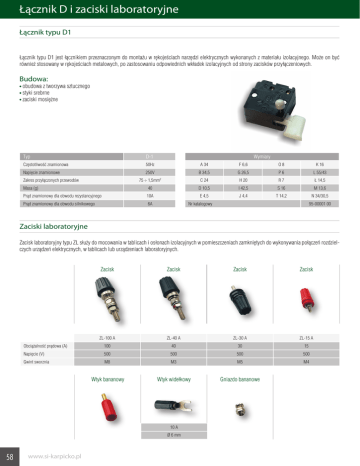 Łącznik D i zaciski laboratoryjne Łącznik typu D1 Łącznik typu D1 jest łącznikiem przeznaczonym do montażu w rękojeściach narzędzi elektrycznych wykonanych z materiału izolacyjnego. Może on być również stosowany w rękojeściach metalowych, po zastosowaniu odpowiednich wkładek izolacyjnych od strony zacisków przyłączeniowych. Budowa: obudowa z tworzywa sztucznego styki srebrne zaciski mosiężne Typ D-1 Wymiary Częstotliwość znamionowa 50Hz A 34 F 6,6 O8 K 16 Napięcie znamionowe 250V B 34,5 G 26,5 P6 L 55/43 75 ÷ 1,5mm2 C 24 H 20 R7 Ł 14,5 Masa (g) 40 D 10,5 I 42,5 S 16 M 13,6 Prąd znamionowy dla obwodu rezystancyjnego 10A E 4,5 J 4,4 T 14,2 Prąd znamionowy dla obwodu silnikowego 6A Zakres przyłączonych przewodów N 34/30,5 Nr katalogowy 95-00001 00 Zaciski laboratoryjne Zacisk laboratoryjny typu ZL służy do mocowania w tablicach i osłonach izolacyjnych w pomieszczeniach zamkniętych do wykonywania połączeń rozdzielczych urządzeń elektrycznych, w tablicach lub urządzeniach laboratoryjnych. Zacisk Zacisk Zacisk Zacisk ZL-100 A ZL-40 A ZL-30 A ZL-15 A Obciążalność prądowa (A) 100 40 30 15 Napięcie (V) 500 500 500 500 Gwint sworznia M8 M3 M5 M4 Wtyk bananowy Wtyk widełkowy Gniazdo bananowe 10 A Ø 6 mm 58 www.si-karpicko.pl