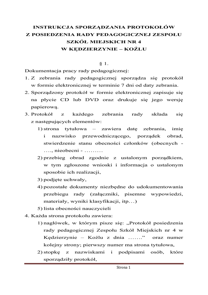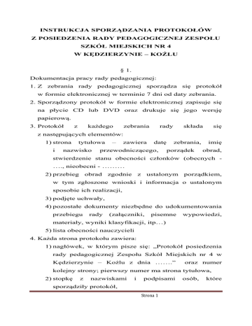 INSTRUKCJA SPORZĄDZANIA PROTOKOŁÓW Z POSIEDZENIA RADY PEDAGOGICZNEJ ZESPOŁU SZKÓŁ MIEJSKICH NR 4 W KĘDZIERZYNIE – KOŹLU § 1. Dokumentacja pracy rady pedagogicznej: 1. Z zebrania rady pedagogicznej sporządza się protokół w formie elektronicznej w terminie 7 dni od daty zebrania. 2. Sporządzony protokół w formie elektronicznej zapisuje się na płycie CD lub DVD oraz drukuje się jego wersję papierową. 3. Protokół z każdego zebrania rady składa się z następujących elementów: 1) strona i tytułowa nazwisko – zawiera datę przewodniczącego, zebrania, porządek imię obrad, stwierdzenie stanu obecności członków (obecnych …., nieobecni - ……… 2) przebieg obrad zgodnie z ustalonym porządkiem, w tym zgłoszone wnioski i informacja o ustalonym sposobie ich realizacji, 3) podjęte uchwały, 4) pozostałe dokumenty niezbędne do udokumentowania przebiegu rady (załączniki, pisemne wypowiedzi, materiały, wyniki klasyfikacji, itp…) 5) lista obecności nauczycieli 4. Każda strona protokołu zawiera: 1) nagłówek, w którym pisze się: „Protokół posiedzenia rady pedagogicznej Zespołu Szkół Miejskich nr 4 w Kędzierzynie – Koźlu z dnia …….” oraz numer kolejny strony; pierwszy numer ma strona tytułowa, 2) stopkę z nazwiskami i podpisami sporządziły protokół, Strona 1 osób, które 3) na ostatniej stronie protokołu zamieszcza się zapis o liczbie stron „Protokół zawiera … ponumerowanych stron”, a także podpis osoby prowadzącej zebrania wraz z imienną pieczęcią. 5. Wersje: papierowa przechowywane są i w elektroniczna koszulkach w protokołów segregatorze u dyrektora szkoły. 6. Członkowie rady pedagogicznej składający sprawozdania i wnioski są zobowiązani w terminie dwóch dnia od daty zebrania dostarczyć treść swoich wystąpień protokolantowi zebrania w formie elektronicznej, 7. Po zakończeniu każdego roku szkolnego sporządza się księgę protokołów zawierającą następujące elementy: 1) strona tytułowa zawierająca: pieczęć nagłówkową szkoły, rok szkolny za który księga jest sporządzona oraz formułę: „Księga zawiera ponumerowane strony od … do …”, 2) spis treści – wykaz posiedzeń rady pedagogicznej, 3) wykaz uchwał, 4) protokoły posiedzeń rady pedagogicznej ułożone w porządku chronologicznym. 8. Ostatnia i podpis strona księgi dyrektora protokołów szkoły oraz datę zawiera: założenia pieczęć księgi protokołów 9. Protokół rady pedagogicznej sporządza się w edytorze tekstów WORD, czcionką 12. § 14. Strona 2 1. Protokół posiedzenia rady pedagogicznej udostępnia się członkom rady do wglądu w terminie 7 dni od daty zebrania. 2. Każdy członek rady może wnieść uwagi i zastrzeżenia do treści protokołu na najbliższym kolejnym zebraniu rady. § 15. Wgląd do księgi protokołów rady mają następujące osoby: 1) dyrektor, 2) nauczyciele – członkowie rady pedagogicznej, 3) osoby zaproszone w dotyczącym ich zakresie, 4) przedstawiciele Kuratorium Oświaty w zakresie określonym w upoważnieniu do dokonania kontroli lub prowadzenia ewaluacji zewnętrznej. Strona 3