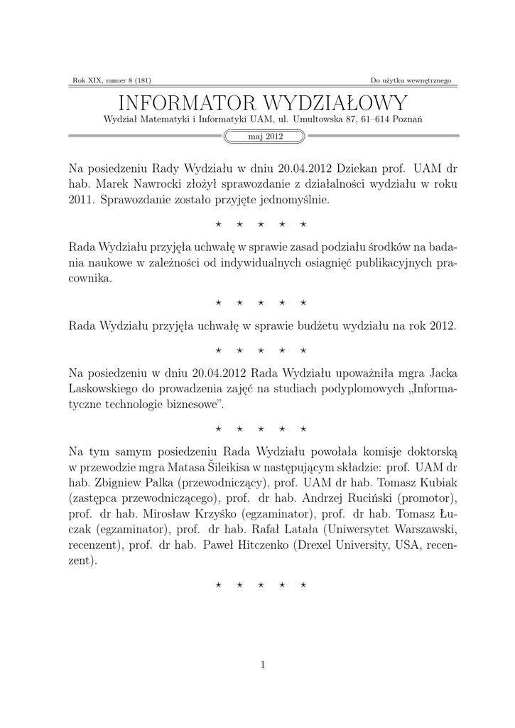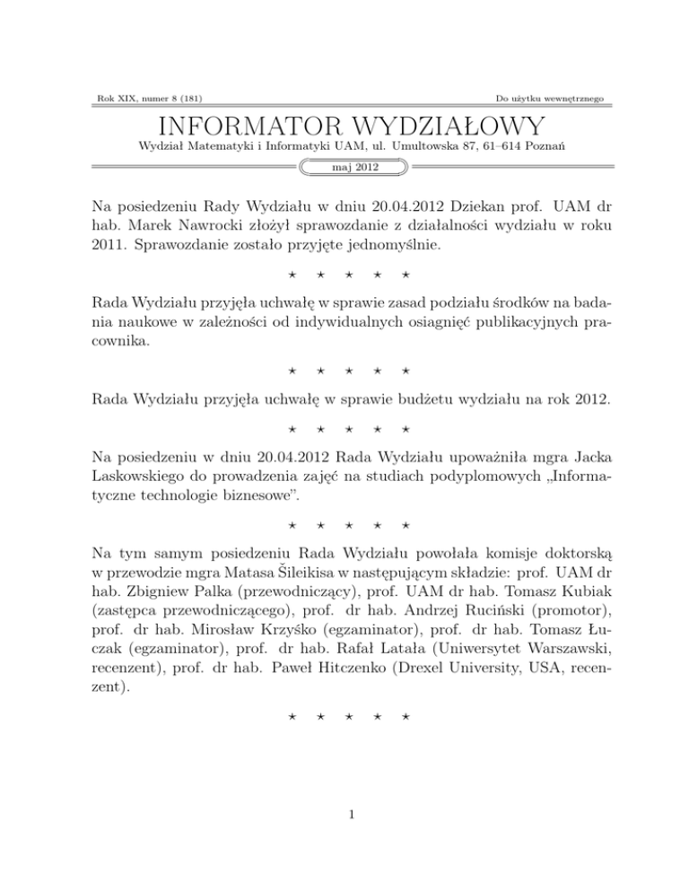 Rok XIX, numer 8 (181) Do użytku wewnętrznego INFORMATOR WYDZIAŁOWY Wydział Matematyki i Informatyki UAM, ul. Umultowska 87, 61–614 Poznań maj 2012 Na posiedzeniu Rady Wydziału w dniu 20.04.2012 Dziekan prof. UAM dr hab. Marek Nawrocki złożył sprawozdanie z działalności wydziału w roku 2011. Sprawozdanie zostało przyjęte jednomyślnie. ? ? ? ? ? Rada Wydziału przyjęła uchwałę w sprawie zasad podziału środków na badania naukowe w zależności od indywidualnych osiagnięć publikacyjnych pracownika. ? ? ? ? ? Rada Wydziału przyjęła uchwałę w sprawie budżetu wydziału na rok 2012. ? ? ? ? ? Na posiedzeniu w dniu 20.04.2012 Rada Wydziału upoważniła mgra Jacka Laskowskiego do prowadzenia zajęć na studiach podyplomowych „Informatyczne technologie biznesowe”. ? ? ? ? ? Na tym samym posiedzeniu Rada Wydziału powołała komisje doktorską w przewodzie mgra Matasa Šileikisa w następującym składzie: prof. UAM dr hab. Zbigniew Palka (przewodniczący), prof. UAM dr hab. Tomasz Kubiak (zastępca przewodniczącego), prof. dr hab. Andrzej Ruciński (promotor), prof. dr hab. Mirosław Krzyśko (egzaminator), prof. dr hab. Tomasz Łuczak (egzaminator), prof. dr hab. Rafał Latała (Uniwersytet Warszawski, recenzent), prof. dr hab. Paweł Hitczenko (Drexel University, USA, recenzent). ? ? ? 1 ? ? Cytat Wy nie wiecie, co to jest matematyka! Wy myślicie: liczby, liczby! A ona śpiewa jak kryształ. Cała dusza tonie w dźwięcznym, przejrzystym krysztale. Stanisław Brzozowski ? ? ? ? ? W dniu 17.04.2012 odbył się kolejny wykład dla młodzieży szkół średnich z cyklu „Po indeks z Pitagorasem”. Wygłosiła go dr Małgorzata BednarskaBzdęga – tytuł wykładu brzmiał: „O grze HEX”. ? ? ? ? ? W dniu 19.04.2012 odbył się wykład skierowany dla studentów i doktorantów, na którym Paweł Dłotko z Uniwersytetu Jagiellońskiego wygłosił odczyt pt. „Topologia obliczeniowa – algorytmy i zastosowania”. ? ? ? ? ? W dniu 14.04.2012 odbyły się na naszym wydziale IV Ogólnopolskie Zawody Robotyki – PozRobot 2012. Zorganizowali je Koło Naukowe Robotyki, Grupa Robocza Inżynierii Kognitywistycznej oraz Fundacja PozRobot. W tym roku roboty musiały odczytać zakodowaną na planszy cyfrę oraz odnaleźć się na mapie. Najlepsi zawodnicy zaprezentowali rozwiązania problemu znanego z gry Snake – wyszukać i przejechać najdłuższą możliwą ścieżkę na planszy. Wszelkie szczegóły o zawodach (m.in opis konkurencji oraz harmonogram) można znaleźć na stronie http://pozrobot.pl oraz na Facebooku http://facebook.com/pozrobot. Zawody zostały objęte patronatem JM Rektora UAM oraz dziekanów Wydziału Matematyki i Informatyki oraz Wydziału Nauk Społecznych. ? ? ? ? ? Student I roku informatyki studiów I stopnia, Adam Kuczyński zdobył nagrodę specjalną dla najlepszego designera podczas finałów Polski konkursu Imagine Cup 2012. Pan Adam Kuczyński jest członkiem zespołu Flexify, którego opiekunem jest mgr Tomasz Gdala. ? ? ? 2 ? ? 12.4.2012 podczas finałów Polski konkursu Imagine Cup 2012 w kategorii Projektowanie Oprogramowania zespół Flexify studentów naszego wydziału w składzie: Tomasz Malesza (II rok studiów II stopnia), Marek Banaszak (I rok studiów II stopnia), Michał Kulikowski (II rok studiów II stopnia), Piotr Kowalczyk (II rok studiów II stopnia) oraz Adam Kuczyński (I rok studiów I stopnia) zdobył III miejsce. Dodatkowo zespół uzyskał nagrodę pieniężną za projekt o największym potencjale biznesowym. Opiekunem zespołu jest mgr Tomasz Gdala . ? ? ? ? ? W dniu 27.05.2011 o godzinie 1130 odbędzie się w auli uniwersyteckiej absolutorium studentów naszego wydziału. ? ? ? ? Z historii . . . ? 360 lat temu, 21.04.1652 roku urodził się w Ambert (Owernia, Francja) Michel Rolle (zmarł 8.11.1719 roku w Paryżu). Był synem kramarza, odebrał tylko elementarne wykształcenie i pracował jako pisarz. W roku 1675 udał się do Paryża, gdzie zdobywał wiedzę jako samouk. Pracował jako nauczyciel domowy. Dopiero po zostaniu w roku 1699 członkiem Paryskiej Akademii Nauk zaczął otrzymywać regularną pensję. Zajmował się głównie badaniem własności algebraicznych równań. W dziele Traité d’algébre (1690) badał m.in. równania diofantyczne oraz udowodnił twierdzenie, znane dziś pod jego nazwiskiem, a głoszące, że funkcja różniczkowalna, która przyjmuje równe wartości w dwóch punktach musi mieć punkt, gdzie nachylenie prostej stycznej do wykresu funkcji jest równe zeru, dokładniej: jeżeli f jest ciągłą funkcją rzeczywistą określoną na przedziale domkniętym [a, b] różniczkowalną na przedziale otwartym (a, b) oraz f (a) = f (b), to istnieje taki punkt c należący do przedziału otwartego (a, b), że f 0 (c) = 0. Przez pewien okres był przeciwnikiem metod infinitezymalnych opartych na pojęciu różniczki rozumianej jako wielkość nieskończenie mała. R.M. ? ? ? 3 ? ? W ramach Wykładów Wydziałowych i Seminarium z Ekonometrii Finansowej, w dniu 20.04.2012 prof. dr hab. Rafał Weron (Politechnika Wrocławska, Instytut Organizacji i Zarządzania) wygłosił wykład pt. „Modelowanie spotowych cen energii elektrycznej”. ? ? ? ? ? Gośćmi wydziału byli w kwietniu br.: • 1–7.04.2012 – prof. Miroslav Krbec, Czechy, Praga, Instytut Matematyki Czeskiej Akademii Nauk (opiekun: dr Paweł Foralewski, Zakład Teorii Przestrzeni Funkcyjnych), • 2–6.04.2012 – dr Nina Gierasimczuk, Holandia, Groningen, University of Groningen (opiekun: prof. Wojciech Buszkowski, Zakład Teorii Obliczeń). ? ? ? ? ? W miesiącu kwietniu br. odbyły się następujące wyjazdy naukowe pracowników wydziału: • 10–19.04.2012 – prof. UAM dr hab. Dariusz Bugajewski, USA, Baltimore, Morgan State University – wykłady, badania naukowe, • 12–19.04.2012 – prof. dr hab. Jerzy Jaworski, Litwa, Wilno, Uniwersytet Wileński – kontynuacja wspólnych badań, • 12–15.04.2012 –