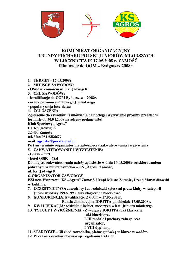 KOMUNIKAT ORGANIZACYJNY I RUNDY PUCHARU POLSKI JUNIORÓW MŁODSZYCH W ŁUCZNICTWIE 17.05.2008 r. ZAMO Eliminacje do OOM – Bydgoszcz 2008r. 1. TERMIN – 17.05.2008r. 2. MIEJSCE ZAWODÓW: - OSiR w Zamo ciu ul. Kr. Jadwigi 8 3. CEL ZAWODÓW: - kwalifikacje do OOM Bydgoszcz – 2008r. - ocena poziomu sportowego J. młodszego - popularyzacja łucznictwa 4. ZGŁOSZENIA: Zgłoszenie do zawodów i zamówienia na noclegi i wy ywienie prosimy przesła w terminie do 30.04.2008 na adresy podane ni ej: Klub Sportowy „Agros” Ul. Kr. Jadwigi 8 22-400 Zamo tel. / fax 084 6386679 mail: [email protected] Po tym terminie organizator nie zabezpiecza zakwaterowania i wy ywienia 5. ZAKWATEROWANIE I WY YWIENIE: - Bursa – 55zł - hotel OSiR – 68zł Do miejsca zakwaterowania nale y zgłosi si w dniu 16.05.2008r. ze skierowaniem pobranym w biurze zawodów – KS „Agros” Zamo , ul. Kr. Jadwigi 8 6. ORGANIZATOR ZAWODÓW PZŁucz. Warszawa, KS „Agros” Zamo , Urz d Miasta Zamo , Urz d Marszałkowski w Lublinie. 7. UCZESTNICTWO: zawodnicy i zawodniczki zgłoszeni przez kluby w kategorii Junior młodszy 1992-1993, łuki klasyczne i bloczkowe. 8. KONKURENCJA: kwalifikacje 2 x 60m – 17.05.2008r. Runda eliminacyjna IORFITA po obiedzie 17.05.2008r. 9. KWALIFIKACJA: oddzielnie kobiet, m czyzn w kat. Juniora młodszego. 10. TYTUŁY I WYRÓ NIENIA - Zwyci zcy IORFITA łuki klasyczne, łuki bloczkowe, I-III medale i puchary zabezpiecza organizator, I-VIII dyplomy. 11. STARTOWE – 30 zł od zawodnika, płatne gotówk w biurze zawodów. 12. W czasie zawodów obowi zuje regulamin PZŁucz. PROGRAM ZAWODÓW 16.05.2008 godz. 1400 – 1800 – przyjmowanie ekip, biuro KS „Agros”, Korona stadionu godz. 1600 – 1800 – trening i kontrola sprz tu - tory łucznicze OSiR godz. 1900 - odprawa techniczna – OSiR Zamo 17.05.2008 godz. 800 – 845 – strzelanie treningowe 60 m godz. 845 – uroczyste otwarcie zawodów godz. 900 – strzelanie kwalifikacyjne godz. 1300 - 1400 – obiad godz. 1600 – strzelanie IORFITA godz. 1800 - ceremonia dekoracji zwyci zców i zako czenie zawodów