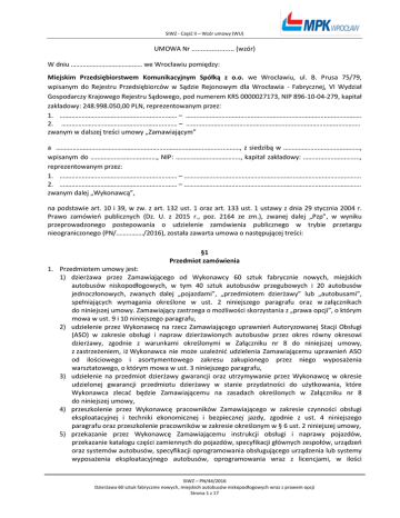 SIWZ - Część II – Wzór umowy (WU) UMOWA Nr ....................... (wzór) W dniu …………………………………… we Wrocławiu pomiędzy: Miejskim Przedsiębiorstwem Komunikacyjnym Spółką z o.o. we Wrocławiu, ul. B. Prusa 75/79, wpisanym do Rejestru Przedsiębiorców w Sądzie Rejonowym dla Wrocławia - Fabrycznej, VI Wydział Gospodarczy Krajowego Rejestru Sądowego, pod numerem KRS 0000027173, NIP 896-10-04-279, kapitał zakładowy: 248.998.050,00 PLN, reprezentowanym przez: 1. …………………………………………………………… – ……..……………………………………………….…………………………………. 2. …………………………………………………..……… – ……..…..………………………………………….…………………………………. zwanym w dalszej treści umowy „Zamawiającym” a …………………………………………………………………………….………..………, z siedzibą w ………………………………………, wpisanym do …………………………………, NIP: ……………………………….., kapitał zakładowy: ……….………………….., reprezentowanym przez: 1. …………………………………………………………… – ……………………………………………………….…………………………………. 2. …………………………………………………………… – ……………………………………………………….…………………………………. zwanym dalej „Wykonawcą”, na podstawie art. 10 i 39, w zw. z art. 132 ust. 1 oraz art. 133 ust. 1 ustawy z dnia 29 stycznia 2004 r. Prawo zamówień publicznych (Dz. U. z 2015 r., poz. 2164 ze zm.), zwanej dalej „Pzp”, w wyniku przeprowadzonego postepowania o udzielenie zamówienia publicznego w trybie przetargu nieograniczonego (PN/……………./2016), została zawarta umowa o następującej treści: §1 Przedmiot zamówienia 1. Przedmiotem umowy jest: 1) dzierżawa przez Zamawiającego od Wykonawcy 60 sztuk fabrycznie nowych, miejskich autobusów niskopodłogowych, w tym 40 sztuk autobusów przegubowych i 20 autobusów jednoczłonowych, zwanych dalej „pojazdami”, „przedmiotem dzierżawy” lub „autobusami”, spełniających wymagania określone w ust. 2 niniejszego paragrafu oraz w załącznikach do niniejszej umowy. Zamawiający zastrzega o możliwości skorzystania z „prawa opcji”, o którym mowa w ust. 9 i 10 niniejszego paragrafu, 2) udzielenie przez Wykonawcę na rzecz Zamawiającego uprawnień Autoryzowanej Stacji Obsługi (ASO) w zakresie obsługi i napraw dzierżawionych autobusów przez okres równy okresowi dzierżawy, zgodnie z warunkami określonymi w Załączniku nr 8 do niniejszej umowy, z zastrzeżeniem, iż Wykonawca nie może uzależnić udzielenia Zamawiającemu uprawnień ASO od ilościowego i asortymentowego zakresu zakupionego przez niego wyposażenia warsztatowego, o którym mowa w ust. 3 niniejszego paragrafu, 3) udzielenie na przedmiot dzierżawy gwarancji oraz utrzymywanie przez Wykonawcę w okresie udzielonej gwarancji przedmiotu dzierżawy w stanie przydatności do użytkowania, które Wykonawca zlecać będzie Zamawiającemu na zasadach określonych w Załączniku nr 8 do niniejszej umowy, 4) przeszkolenie przez Wykonawcę pracowników Zamawiającego w zakresie czynności obsługi eksploatacyjnej i techniki ekonomicznej i bezpiecznej jazdy, zgodnie z ust. 4 niniejszego paragrafu oraz przeszkolenie pracowników w zakresie określonym w § 6 ust. 2 niniejszej umowy, 5) przekazanie przez Wykonawcę Zamawiającemu instrukcji obsługi i naprawy pojazdów, przekazanie katalogu części zamiennych do pojazdów, specyfikacji głównych zespołów, urządzeń oraz systemów autobusów, specyfikacji oprogramowania obsługującego urządzenia lub systemy wyposażenia eksploatacyjnego autobusów, oprogramowania wraz z licencjami, w ilości SIWZ – PN/44/2016 Dzierżawa 60 sztuk fabrycznie nowych, miejskich autobusów niskopodłogowych wraz z prawem opcji Strona 1 z 17 SIWZ - Część II – Wzór umowy (WU) pozwalającej na swobodne korzystanie ze wszystkich funkcjonalności autobusów, w formie, ilościach i terminach wskazanych w ust. 5 niniejszego paragrafu, 6) dokonanie przez Wykonawcę na rzecz Zamawiającego odpłatnej dostawy wraz z montażem systemu monitoringu wizyjnego, systemu informacji pasażerskiej i systemu liczenia pasażerów, określonych w załącznikach do umowy, 7) dokonanie przez Wykonawcę na rzecz Zamawiającego odpłatnych dostaw materiałów, części i podzespołów na utrzymanie przedmiotu dzierżawy w sprawności technicznej, o których mowa w §7 ust. 20 niniejszej umowy. 2. Pojazdy stanowiące przedmiot dzierżawy muszą spełniać następujące wymagania: 1) muszą być wolne od wad fizycznych i prawnych, w tym w szczególności posiadać wszelkie, wymagane prawem, dokumenty dopuszczające do ruchu, w tym dokument potwierdzający ubezpieczenie każdego z pojazdów w ramach OC na czas jazdy próbnej oraz komplet tablic rejestracyjnych (obowiązek ubezpieczenia w ramach OC i pożaru od terminu odbioru każdego z pojazdów leży po stronie Zamawiającego), 2) muszą odpowiadać opisom zawartym odpowiednio w załącznikach do niniejszej umowy (dotyczących poszczególnych grup pojazdów), 3) muszą być fabrycznie nowe, tj. wyprodukowane nie wcześniej, niż 6 miesięcy przed terminem realizacji dostawy oraz nie eksploatowane dotychczas, 4) muszą być jednej marki, 5) muszą być identyczne w ramach danej grupy (przegubowe/jednoczłonowe), w szczególności pod względem konstrukcyjnym, parametrów technicznych, kompletacji wyposażenia, 6) muszą charakteryzować się: a) odpornością na perforację poszycia zewnętrznego przez okres równy okresowi dzierżawy, b) trwałością powłok lakierniczych przez okres równ