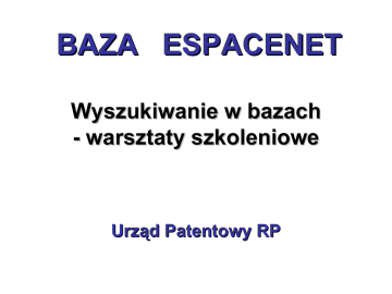 BAZA ESPACENET Wyszukiwanie w bazach - warsztaty szkoleniowe Urząd Patentowy RP www.espacenet.com www.espacenet.com www.espacenet.com www.espacenet.com www.espacenet.com www.espacenet.com www.espacenet.com www.espacenet.com c www.espacenet.com www.espacenet.com www.espacenet.com www.espacenet.com www.espacenet.com Pomocnicze narzędzia wyszukiwawcze W polach tekstowych (tytuł, skrót, zgłaszający, wynalazca) można użyć następujące znaki markujące: ? - zastępuje pojedynczy znak lub brak znaku przykład: colo?r (wyszukuje: color lub colour) # - zastępuje jedną literę przykład: synthesi#e (wyszukuje: synthesize lub synthesise) * - zastępuje końcówkę wyrazu przykład: scrol* (wyszukuje: wyrazy rozpoczynające się od scrol) Przykłady różnic w nazewnictwie technicznym używanym w GB i US • • • • • • • • POLSKI BRITISH AMERICAN OPONA TYRE TIRE BENZYNA PETROL GAS CIĘŻARÓWKA LORRY TRUCK WINDA LIFT ELEVATOR KRAN TAP FAUCET UZIEMIENIE EARTH GROUND TŁUMIK SILENCER MUFFLER WULKANIZACJA VULCANISATION VULCANIZATION Międzynarodowa Klasyfikacja Patentowa http://www.wipo.int/classifications/ipc/en/