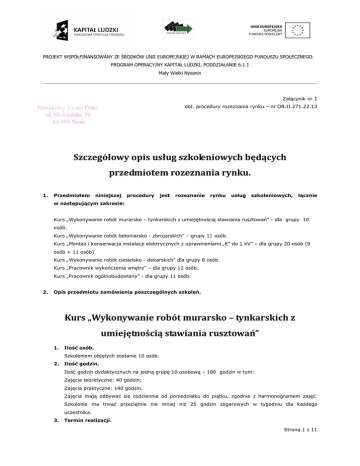 PROJEKT WSPÓŁFINANSOWANY ZE ŚRODKÓW UNII EUROPEJSKIEJ W RAMACH EUROPEJSKIEGO FUNDUSZU SPOŁECZNEGO. PROGRAM OPERACYJNY KAPITAŁ LUDZKI, PODDZIAŁANIE 6.1.1 Mały Wielki Nysanin Załącznik nr 1 dot. procedury rozeznania rynku – nr OR.II.271.22.13 Szczegółowy opis usług szkoleniowych będących przedmiotem rozeznania rynku. 1. Przedmiotem niniejszej procedury jest rozeznanie rynku usług szkoleniowych, łącznie w następującym zakresie: Kurs „Wykonywanie robót murarsko – tynkarskich z umiejętnością stawiania rusztowań” - dla grupy 10 osób. Kurs „Wykonywanie robót betoniarsko - zbrojarskich” – grupy 11 osób. Kurs „Montaż i konserwacja instalacji elektrycznych z uprawnieniami „E” do 1 kV” – dla grupy 20 osób (9 osób + 11 osób) Kurs „Wykonywanie robót ciesielsko - dekarskich” dla grupy 8 osób. Kurs „Pracownik wykończenia wnętrz” – dla grupy 12 osób. Kurs „Pracownik ogólnobudowlany” - dla grupy 11 osób. 2. Opis przedmiotu zamówienia poszczególnych szkoleń. Kurs „Wykonywanie robót murarsko – tynkarskich z umiejętnością stawiania rusztowań” 1. Ilość osób. Szkoleniem objętych zostanie 10 osób. 2. Ilość godzin. Ilość godzin dydaktycznych na jedną grupę 10 osobową – 180 godzin w tym: Zajęcia teoretyczne: 40 godzin; Zajęcia praktyczne: 140 godzin. Zajęcia mają odbywać się codziennie od poniedziałku do piątku, zgodnie z harmonogramem zajęć. Szkolenie ma trwać przeciętnie nie mniej niż 25 godzin zegarowych w tygodniu dla każdego uczestnika. 3. Termin realizacji. Strona 1 z 11 Szkolenie ma się rozpocząć w miesiącu maju 2013r. 4. Miejsce szkolenia. Zajęcia teoretyczne : Nysa Zajęcia praktyczne : Kępnica 5. Cel szkolenia i bloki tematyczne. Celem szkolenia jest praktyczne i teoretyczne przygotowanie uczestników szkolenia do wykonywania samodzielnych zadań związanych z: • murowaniem fundamentów, • ścian nośnych, osłonowych i działowych; • wykonywaniem stropów murarskich; • wykonywaniem tynków zewnętrznych i wewnętrznych. Szkolenie powinno zawierać co najmniej następujące bloki tematyczne: • organizowanie miejsca pracy zgodnie z wymogami bhp, p.poż oraz ochrony środowiska, • bezpieczeństwo przy stawianiu rusztowań, • ogólne wiadomości o obiektach budowlanych, elementy składowe budynku, • dokumentacja techniczna, • umiejętność rozróżniania nowoczesnych materiałów budowlanych, • znajomość przeznaczenia materiałów budowlanych, • pogłębienie umiejętności sporządzania zapotrzebowania materiałów do wykonywania robót • dobieranie odpowiedniego sprzętu oraz narzędzi, murarsko – tynkarskich, • dobór odpowiedniego transportu oraz składowania materiałów budowlanych, • montaż, użytkowanie, jak również rozbieranie rusztowań zewnętrznych ( do wysokości 6 mb) oraz wewnętrznych do robót murarsko – tynkarskich, • nabycie umiejętności korzystania z norm i normatywów budowlanych, jak również z poradników i instrukcji technicznych, • pogłębienie wiedzy z zakresu udzielania pierwszej pomocy w razie wypadku, • zagadnie z przygotowujące do egzaminu czeladniczego Zajęcia praktyczne. Zamawiający wymaga, aby w ramach zajęć praktycznych kursu wykonane zostały czynności z zakresu stawiania budynku wolnostojącego. Zakres prac obejmuje miedzy innymi: • przygotowanie stanowiska pracy; • przygotowanie zapraw i betonów sposobem ręcznym i mechanicznym; • przygotowanie rusztowań do robót murarskich; • wytyczanie ścian nośnych, działowych oraz innych elementów budynku; • wykonywanie murów pełnych z różnych materiałów; • wykonywanie murów zbrojonych, nadproży, stropów; • osadzanie stolarki okiennej i drzwiowej oraz elementów ślusarki budowlanej; • wykonywanie ścianek działowych z różnych materiałów. Wykonawca ma zabezpieczyć sprzęt techniczny oraz materiały do zajęć praktycznych wraz z kierownikiem robót budowlanych z uprawnieniami budowlanymi. Minimalna wymagana ilość rusztowań rurowych niezbędnych do wykonania zadania – 200 m 2 Uwaga ogólna: Dla sporządzenia kalkulacji cenowej zakupu materiałów malarskich należy przyjąć założenie: koszt materiałów głównych i pomocniczych zużytych w czasie kursu należy przyjąć w wysokości 600 zł na osobę Strona 2 z 11 6. • koszt materiałów szkoleniowych nie może być większy niż 20 % wartości kursu • w preliminarzu kursu należy uwzględnić między innymi: o koszt środków ochrony osobistej ( ubrania robocze , buty, rękawice) o koszt egzaminów czeladniczych o koszt zabezpieczenia sanitarnego kursantów o koszt napojów regeneracyjnych Dodatkowe informacje. ⇒ Do oferty należy dołączyć: Wzór zaświadczenia, jakie otrzyma uczestnik po zakończeniu kursu (zgodnie z § 18 ust. 2 rozporządzenia Ministra Edukacji Narodowej z dnia 11 stycznia 2012r. w sprawie kształcenia ustawicznego w formach pozaszkolnych Dz.U. poz. 186); Dokument potwierdzający, że instytucja szkoleniowa jest placówką lub ośrodkiem (zgodnie z § 2 pkt. 4 lub 5 rozporządzenia Ministra Edukacji Narodowej z dnia 11 stycznia 2012r. w sprawie kształcenia ustawicznego w formach pozaszkolnych Dz.U. poz. 186); Szkolenie ma się zakończyć egzaminem czeladniczym w zawodzie murarz. Kurs „Wykonywanie robót betoniarsko - zbrojarskich ” 1. Ilość osób. Szkoleniem objętych zostanie 11 osób. 2. Ilość godzin. Ilość godzin dydaktycznych na jedną grupę 11 osobową – 180 godziny w tym: Zajęcia teoretyczne: 40 godzin; Zajęcia praktyczne: 140 godzin. Zajęcia mają odbywać się codziennie od poniedziałku do piątku, zgodnie z harmonogramem zajęć. Szkolenie ma trwać przeciętnie nie mniej niż 25 godzin zegarowych w tygodniu dla każdego uczestnika. 3. Termin realizacji. Szkolenie ma się rozpocząć w miesiącu: kwiecień maj 2013r. 4. Miejsce szkolenia. Zajęcia teoretyczne : Nysa Zajęcia praktyczne : - Kepnica 5. Cel
