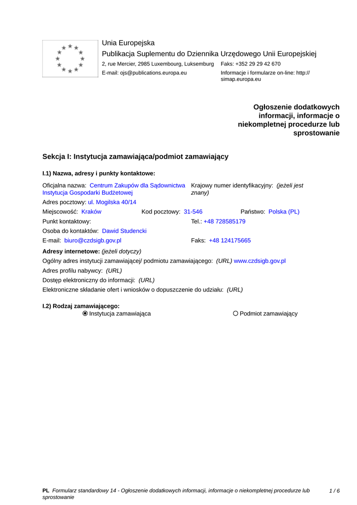 Unia Europejska Publikacja Suplementu do Dziennika Urzędowego Unii Europejskiej 2, rue Mercier, 2985 Luxembourg, Luksemburg Faks: +352 29 29 42 670 E-mail: [email protected] Informacje i formularze on-line: http:// simap.europa.eu Ogłoszenie dodatkowych informacji, informacje o niekompletnej procedurze lub sprostowanie Sekcja I: Instytucja zamawiająca/podmiot zamawiający I.1) Nazwa, adresy i punkty kontaktowe: Oficjalna nazwa: Centrum Zakupów dla Sądownictwa Krajowy numer identyfikacyjny: (jeżeli jest Instytucja Gospodarki Budżetowej znany) _____ Adres pocztowy: ul. Mogilska 40/14 Miejscowość: Kraków Kod pocztowy: 31-546 Punkt kontaktowy: _____ Państwo: Polska (PL) Tel.: +48 728585179 Osoba do kontaktów: Dawid Studencki E-mail: [email protected] Faks: +48 124175665 Adresy internetowe: (jeżeli dotyczy) Ogólny adres instytucji zamawiającej/ podmiotu zamawiającego: (URL) www.czdsigb.gov.pl Adres profilu nabywcy: (URL) _____ Dostęp elektroniczny do informacji: (URL) _____ Elektroniczne składanie ofert i wniosków o dopuszczenie do udziału: (URL) _____ I.2) Rodzaj zamawiającego: Instytucja zamawiająca Podmiot zamawiający PL Formularz standardowy 14 - Ogłoszenie dodatkowych informacji, informacje o niekompletnej procedurze lub sprostowanie 1/6 Sekcja II: Przedmiot zamówienia II.1.1) Nazwa nadana zamówieniu: ŚWIADCZENIE USŁUG POCZTOWYCH W OBROCIE KRAJOWYM I ZAGRANICZNYM W ZAKRESIE PRZYJMOWANIA, PRZEMIESZCZANIA I DORĘCZANIA PRZESYŁEK POCZTOWYCH ORAZ ZWROTU PRZESYŁEK NIEDORĘCZONYCH NA RZECZ JEDNOSTEK ORGANIZACYJNYCH SĄDOWNICTWA POWSZECHNEGO – NA PODSTAWIE UMOWY RAMOWEJ. II.1.2) Krótki opis zamówienia lub zakupu: (podano w pierwotnym ogłoszeniu) 1. Przedmiotem zamówienia jest świadczenie usług pocztowych w obrocie krajowym i zagranicznym dla jednostek organizacyjnych sądownictwa powszechnego (których wykaz stanowi Załącznik nr 7 do siwz) w zakresie przyjmowania, przemieszczania i doręczania przesyłek listowych, paczek pocztowych oraz krajowych przesyłek kurierskich, zwrotu przesyłek niedoręczonych. 2. Szczegółowe informacje dotyczące wykonywanej usługi: 1) świadczenie usług pocztowych będzie polegało na przyjmowaniu, przemieszczaniu i doręczaniu: a) przesyłek listowych krajowych nierejestrowanych zwykłych, b) przesyłek listowych krajowych poleconych zwykłych, c) przesyłek listowych krajowych poleconych ekspresowych, d) przesyłek listowych krajowych poleconych zwykłych z potwierdzeniem odbioru, e) przesyłek listowych krajowych poleconych zwykłych z podwójnym potwierdzeniem odbioru, f) przesyłek listowych krajowych poleconych ekspresowych z potwierdzeniem odbioru, g) przesyłek listowych krajowych poleconych ekspresowych z podwójnym potwierdzeniem odbioru, h) przesyłek listowych zagranicznych poleconych zwykłych z potwierdzeniem odbioru, i) przesyłek listowych zagranicznych poleconych ekspresowych z potwierdzeniem odbioru, j) przesyłek listowych zagranicznych poleconych ekspresowych, k) paczek pocztowych krajowych zwykłych, l) paczek pocztowych krajowych zwykłych z potwierdzeniem odbioru, m) paczek pocztowych krajowych ekspresowych, n) paczek pocztowych krajowych ekspresowych z potwierdzeniem odbioru, o) paczek pocztowych zagranicznych ekspresowych z potwierdzeniem odbioru, p) przesyłek kurierskich krajowych, q) zwrotów przesyłek– listy r) zwrotów przesyłek – paczki krajowe s) zwrotów przesyłek – paczki zagraniczne t) zwrotów przesyłek – paczki krajowe Szczegółowy opis przedmiotu zamówienia zawarty został w Załączniku nr 5 do siwz. II.1.3) Wspólny Słownik Zamówień (CPV) Główny przedmiot Słownik główny 64100000 Słownik uzupełniający (jeżeli dotyczy) PL Formularz standardowy 14 - Ogłoszenie dodatkowych informacji, informacje o niekompletnej procedurze lub sprostowanie 2/6 Sekcja IV: Procedura IV.1)Rodzaj procedury (podano w pierwotnym ogłoszeniu) Otwarta Ograniczona Ograniczona przyspieszona Negocjacyjna Negocjacyjna przyspieszona Dialog konkurencyjny Negocjacyjna z uprzednim ogłoszeniem Negocjacyjna bez uprzedniego ogłoszenia Negocjacyjna z publikacją ogłoszenia o zamówieniu Negocjacyjna bez publikacji ogłoszenia o zamówieniu Udzielenie zamówienia bez uprzedniej publikacji ogłoszenia o zamówieniu w Dzienniku Urzędowym Unii Europejskiej IV.2)Informacje administracyjne IV.2.1)Numer referencyjny: (podano w pierwotnym ogłoszeniu) ZP-11/2012 IV.2.2)Dane referencyjne ogłoszenia w przypadku ogłoszeń przesłanych drogą elektroniczną: Pierwotne ogłoszenie przesłane przez eNotices TED eSender Login: ENOTICES_CZDSIGB Dane referencyjne ogłoszenia: 2012-137758 rok i numer dokumentu IV.2.3)Ogłoszenie, którego dotyczy niniejsza publikacja: Numer ogłoszenia w Dz.U.: 2012/S 194-319558 z dnia: 09/10/2012 (dd/mm/rrrr) IV.2.4)Data wysłania pierwotnego ogłoszenia: 04/10/2012 (dd/mm/rrrr) PL Formularz standardowy 14 - Ogłoszenie dodatkowych informacji, informacje o niekompletnej procedurze lub sprostowanie 3/6 Sekcja VI: Informacje uzupełniające VI.1) Ogłoszenie dotyczy: Procedury niepełnej Sprostowania Informacji dodatkowych VI.2) Informacje na temat niepełnej procedury udzielenia zamówienia: Postępowanie o udzielenie zamówienia zostało przerwane Postępowanie o udzielenie zamówienia uznano za nieskuteczne Zamówienia nie udzielono Zamówienie może być przedmiotem ponownej publikacji VI.3) Informacje do poprawienia lub dodania : VI.3.1) Zmiana oryginalnej informacji podanej przez instytucję zamawiającą Publikacja w witrynie TED niezgodna z oryginalną informacją, przekazaną przez instytucję zamawiającą Oba przypadki VI.3.2) W ogłoszeniu pierwotnym W odpowiedniej dokumentacji przetargowej (więcej informacji w odpowiedniej dokumentacji przetargowej) W obu przypadkach (więcej informacji w odpowiedniej dokumentacji przetargowej) VI.3.3) Tekst, który należy poprawić w pierwotnym ogłoszeniu Miejsce, w którym znajduje się Zamiast: Powinno być: zmieniany tekst: