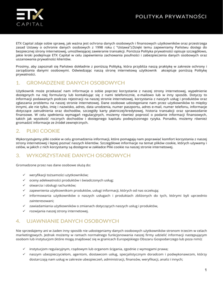 POLITYKA PRYWATNOŚCI ETX Capital zdaje sobie sprawę, jak ważna jest ochrona danych osobowych i finansowych użytkowników oraz przestrzega zasad Ustawy o ochronie danych osobowych z 1998 roku ( "Ustawa").Dzięki temu zapewniamy Państwu dostęp do bezpiecznej strony internetowej, umożliwiającej zawieranie transakcji. Poniższa Polityka prywatności opisuje szczegółowo, jakie kroki podejmuje ETX Capital w celu zapewnienia zachowania poufności i zabezpieczenia danych osobowych oraz uszanowania prywatności klientów. Prosimy, aby zapoznali się Państwo dokładnie z poniższą Polityką, która przybliża naszą praktykę w zakresie ochrony i zarządzania danymi osobowymi. Odwiedzając naszą stronę internetową użytkownik akceptuje poniższą Politykę prywatności. 1. GROMADZENIE DANYCH OSOBOWYCH Użytkownik może przekazać nam informacje o sobie poprzez korzystanie z naszej strony internetowej, wypełnienie dostępnych na niej formularzy lub kontaktując się z nami telefonicznie, e-mailowo lub w inny sposób. Dotyczy to informacji podawanych podczas rejestracji na naszej stronie internetowej, korzystania z naszych usług i produktów oraz zgłaszania problemu na naszej stronie internetowej. Dane osobowe udostępniane nam przez użytkowników to między innymi, ale nie tylko, imię i nazwisko, adres, data urodzenia, numer paszportu, adres e-mail, numer telefonu, informacje dotyczące zatrudnienia oraz dochodów, szczegóły karty płatniczej/kredytowej, historia transakcji oraz sprawozdanie finansowe. W celu spełnienia wymagań regulacyjnych, możemy również poprosić o podanie informacji finansowych, takich jak wysokość rocznych dochodów i dostępnego kapitału podwyższonego ryzyka. Ponadto, możemy również gromadzić informacje ze źródeł zewnętrznych. 2. PLIKI COOKIE Wykorzystujemy pliki cookie w celu gromadzenia informacji, które pomagają nam poprawiać komfort korzystania z naszej strony internetowej i lepiej poznać naszych klientów. Szczegółowe informacje na temat plików cookie, których używamy i celów, w jakich z nich korzystamy są dostępne w zakładce Pliki cookie na naszej stronie internetowej. 3. WYKORZYSTANIE DANYCH OSOBOWYCH Gromadzone przez nas dane osobowe służą do: weryfikacji tożsamości użytkowników; oceny adekwatności produktów i świadczonych usług; otwarcia i obsługi rachunków; zapewnienia użytkownikom produktów, usługi informacji, których od nas oczekują; informowania użytkowników o naszych usługach i produktach zbliżonych do tych, którymi byli uprzednio zainteresowani; zawiadamiania użytkowników o zmianach dotyczących naszych usług i produktów, rozwijania naszej strony internetowej. 4. UJAWNIANIE DANYCH OSOBOWYCH Nie sprzedajemy ani w żaden inny sposób nie udostępniamy danych osobowych użytkowników stronom trzecim w celach marketingowych. Jednak możemy w ramach normalnego funkcjonowania naszej firmy udzielić informacji następującym osobom lub instytucjom (które mogą znajdować się w granicach Europejskiego Obszaru Gospodarczego lub poza nimi): instytucjom regulacyjnym, rządowym lub organom ścigania, zgodnie z wymogami prawa; naszym ubezpieczycielom, agentom, dostawcom usług, specjalistycznym doradcom i podwykonawcom, którzy dostarczają nam usług w zakresie ubezpieczeń, administracji, finansów, weryfikacji, analiz i innych; 1 POLITYKA PRYWATNOŚCI profesjonalnym doradcom, w tym naszym prawnikom, w związku z bieżącymi lub przyszłymi postępowaniami sądowymi w celu wykonania lub obrony naszych praw oraz audytorom i księgowym, w celu spełnienia naszych regulacyjnych i finansowych obowiązków sprawozdawczych; brokerom, z którymi utrzymujemy wzajemne relacje biznesowe; biurom informacji kredytowej; wszystkim członkom naszej grupy kapitałowej, w tym naszym spółkom zależnym, spółce dominującej i jej spółkom zależnym oraz następcom prawnym naszej działalności. 5. BEZPIECZEŃSTWO ETX Capital bardzo poważnie traktuje kwestie ochrony danych osobowych i w związku z tym podejmuje działania, mające na celu ochronę ich bezpieczeństwa. 6. PRAWA UŻYTKOWNIKA Użytkownik nie jest zobowiązany do ujawnienia wymaganych przez nas danych osobowych. Jednak niedostarczenie danych osobowych na naszą prośbę może oznaczać, że nie będziemy mogli dostarczyć użytkownikowi produktu, świadczyć usługi lub utrzymywać jego rachunku. Na naszej stronie mogą znajdować się łącza do i ze stron naszych partnerów, reklamodawców i innych powiązanych z nami podmiotów. Należy pamiętać, że strony, do których prowadzą powyższe łącza, kierują się własnymi politykami prywatności, za które nie ponosimy odpowiedzialności. Zalecamy zapoznać się z polityką prywatności tych stron przed przesłaniem na nie danych osobowych. 7. DOSTĘP DO INFORMACJI Ustawa o ochronie danych osobowych zapewnia użytkownikom dostęp do posiadanych o nich informacji, a prawo to jest wykonywane zgodnie z tą Ustawą. Wniosek o udostępnienie danych osobowych może podlegać opłacie, wynikającej z kosztów dostarczenia szczegółowych danych naszym użytkownikom. 8. W NASZEJ POLITYCE PRYWATNOŚCI Wszystkie zmiany, które będziemy w przyszłości wprowadzać do powyższej Polityki, będą publikowane na tej stronie internetowej oraz w stosownych przypadkach wysyłane użytkownikom drogą e-mailową. Zalecamy, aby użytkownicy regularnie odwiedzali naszą stronę internetową i sprawdzali aktualizacje oraz zmiany w Polityce prywatności. 9. KONTAKT Wszystkie pytania dotyczące powyższej [email protected] Polityki prywatności prosimy kierować ma adres e-mailowy: 31 stycznia 2016 2