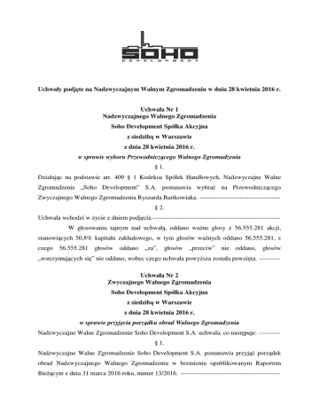Uchwały podjęte na Nadzwyczajnym Walnym Zgromadzeniu w dniu 28 kwietnia 2016 r. Uchwała Nr 1 Nadzwyczajnego Walnego Zgromadzenia Soho Development Spółka Akcyjna z siedzibą w Warszawie z dnia 28 kwietnia 2016 r. w sprawie wyboru Przewodniczącego Walnego Zgromadzenia § 1. Działając na podstawie art. 409 § 1 Kodeksu Spółek Handlowych, Nadzwyczajne Walne Zgromadzenie „Soho Development” S.A. postanawia wybrać na Przewodniczącego Zwyczajnego Walnego Zgromadzenia Ryszarda Bartkowiaka. -------------------------------------§ 2. Uchwała wchodzi w życie z dniem podjęcia.-----------------------------------------------------------W głosowaniu tajnym nad uchwałą, oddano ważne głosy z 56.555.281 akcji, stanowiących 50,8% kapitału zakładowego, w tym głosów ważnych oddano 56.555.281, z czego 56.555.281 głosów oddano „za”, głosów „przeciw” nie oddano, głosów „wstrzymujących się” nie oddano, wobec czego uchwała powyższa została powzięta. ---------Uchwała Nr 2 Zwyczajnego Walnego Zgromadzenia Soho Development Spółka Akcyjna z siedzibą w Warszawie z dnia 28 kwietnia 2016 r. w sprawie przyjęcia porządku obrad Walnego Zgromadzenia Nadzwyczajne Walne Zgromadzenie Soho Development S.A. uchwala, co następuje: ---------§ 1. Nadzwyczajne Walne Zgromadzenie Soho Development S.A. postanawia przyjąć porządek obrad Nadzwyczajnego Walnego Zgromadzenia w brzmieniu opublikowanym Raportem Bieżącym z dnia 31 marca 2016 roku, numer 13/2016. ----------------------------------------------- § 2. Uchwała wchodzi w życie z dniem podjęcia.-----------------------------------------------------------W głosowaniu jawnym nad uchwałą, oddano ważne głosy z 56.555.281 akcji, stanowiących 50,8% kapitału zakładowego, w tym głosów ważnych oddano 56.555.281, z czego 56.555.281 głosów oddano „za”, głosów „przeciw” i głosów „wstrzymujących się” nie oddano, wobec czego uchwała powyższa została powzięta. ------------------------------------------ Uchwała Nr 3 Zwyczajnego Walnego Zgromadzenia Soho Development Spółka Akcyjna z siedzibą w Warszawie z dnia 28 kwietnia 2016 r. sprawie połączenia ze spółką pod firmą PZO Investment Spółka z ograniczoną odpowiedzialnością Nadzwyczajne Walne Zgromadzenie Soho Development Spółka Akcyjna z siedzibą w Warszawie (zwana dalej „Spółka Przejmująca”), działając na podstawie art. 506 § 1 – 6 w zw. z art. 516 § 1 – 6 Kodeksu spółek handlowych uchwala, co następuje: --------------------------§ 1. Spółka Przejmująca łączy się ze spółką pod firmą PZO Investment Spółka z ograniczoną odpowiedzialnością z siedzibą w Warszawie, wpisaną do rejestru przedsiębiorców prowadzonego przez Sąd Rejonowy dla m. st. Warszawy w Warszawie, XIII Wydział Gospodarczy Krajowego Rejestru Sadowego pod numerem KRS 0000295679, REGON: 890528980, NIP: 8840007445, kapitał zakładowy 12.525.597,64 zł (zwana dalej „Spółka Przejmowana”). --------------------------------------------------------------------------------------------§ 2. Połączenie o którym mowa w § 1 powyżej, zostanie przeprowadzone w trybie art. 492 § 1 pkt 1 Kodeksu spółek handlowych tj. poprzez przeniesienie całego majątku Spółki Przejmowanej na Spółkę Przejmującą – na zasadach określonych w Planie Połączenia z dnia 25 marca 2016 r. (zwanym dalej „Planem Połączenia”). ---------------------------------------------------------------- § 3. W związku z tym, ze Spółka Przejmująca jest jedynym akcjonariuszem Spółki Przejmowanej, połączenie odbywa się stosownie do art. 515 § 1 Kodeksu spółek handlowych bez podwyższenia kapitału zakładowego Spółki Przejmującej i z zachowaniem trybu przewidzianego w art. 516 § 6 Kodeksu spółek handlowych dla przejmowania spółek jednoosobowych. -------------------------------------------------------------------------------------------§ 4. Wobec uchwalonego połączenia Nadzwyczajne Walne Zgromadzenie wyrażą zgodę na Plan Połączenia. --------------------------------------------------------------------------------------------------§ 5. Upoważnia się Zarząd Spółki Przejmującej do dokonania wszystkich niezbędnych czynności związanych z przeprowadzeniem procedury połączenia Spółki Przejmującej i Spółki Przejmowanej.-----------------------------------------------------------------------------------------------§ 6. Uchwała wchodzi w życie z dniem podjęcia.-----------------------------------------------------------W głosowaniu jawnym nad uchwałą, oddano ważne głosy z 56.555.281 akcji, stanowiących 50,8% kapitału zakładowego, w tym głosów ważnych oddano 56.555.281, z czego 56.555.281 głosów oddano „za”, głosów „przeciw” nie oddano, głosów „wstrzymujących się” nie oddano, wobec czego uchwała powyższa została powzięta. ------------------------------------------