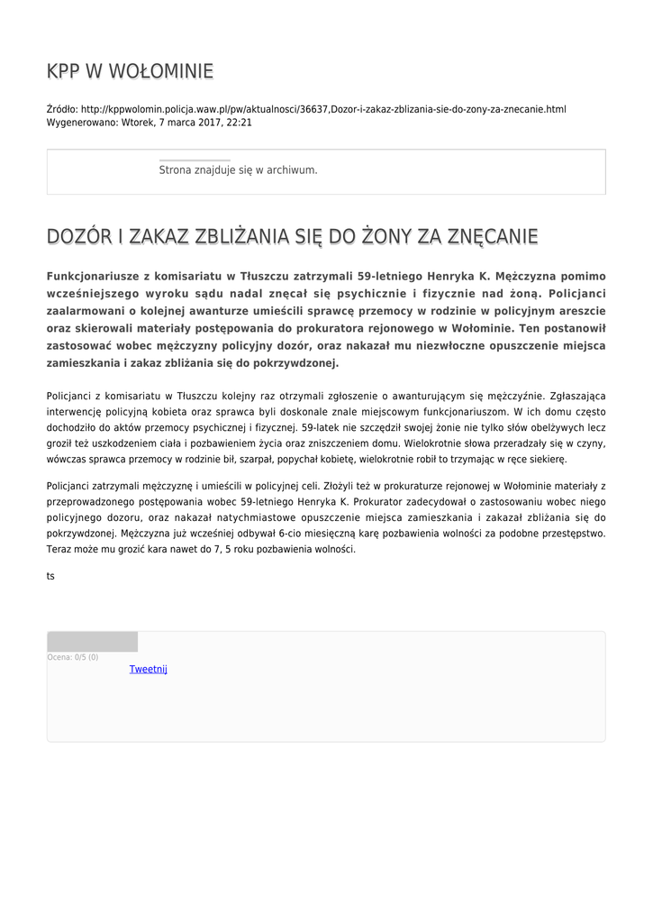 KPP W WOŁOMINIE Źródło: http://kppwolomin.policja.waw.pl/pw/aktualnosci/36637,Dozor-i-zakaz-zblizania-sie-do-zony-za-znecanie.html Wygenerowano: Wtorek, 7 marca 2017, 22:21 Strona znajduje się w archiwum. DOZÓR I ZAKAZ ZBLIŻANIA SIĘ DO ŻONY ZA ZNĘCANIE Funkcjonariusze z komisariatu w Tłuszczu zatrzymali 59-letniego Henryka K. Mężczyzna pomimo wcześniejszego wyroku sądu nadal znęcał się psychicznie i fizycznie nad żoną. Policjanci zaalarmowani o kolejnej awanturze umieścili sprawcę przemocy w rodzinie w policyjnym areszcie oraz skierowali materiały postępowania do prokuratora rejonowego w Wołominie. Ten postanowił zastosować wobec mężczyzny policyjny dozór, oraz nakazał mu niezwłoczne opuszczenie miejsca zamieszkania i zakaz zbliżania się do pokrzywdzonej. Policjanci z komisariatu w Tłuszczu kolejny raz otrzymali zgłoszenie o awanturującym się mężczyźnie. Zgłaszająca interwencję policyjną kobieta oraz sprawca byli doskonale znale miejscowym funkcjonariuszom. W ich domu często dochodziło do aktów przemocy psychicznej i fizycznej. 59-latek nie szczędził swojej żonie nie tylko słów obelżywych lecz groził też uszkodzeniem ciała i pozbawieniem życia oraz zniszczeniem domu. Wielokrotnie słowa przeradzały się w czyny, wówczas sprawca przemocy w rodzinie bił, szarpał, popychał kobietę, wielokrotnie robił to trzymając w ręce siekierę. Policjanci zatrzymali mężczyznę i umieścili w policyjnej celi. Złożyli też w prokuraturze rejonowej w Wołominie materiały z przeprowadzonego postępowania wobec 59-letniego Henryka K. Prokurator zadecydował o zastosowaniu wobec niego policyjnego dozoru, oraz nakazał natychmiastowe opuszczenie miejsca zamieszkania i zakazał zbliżania się do pokrzywdzonej. Mężczyzna już wcześniej odbywał 6-cio miesięczną karę pozbawienia wolności za podobne przestępstwo. Teraz może mu grozić kara nawet do 7, 5 roku pozbawienia wolności. ts Ocena: 0/5 (0) Tweetnij