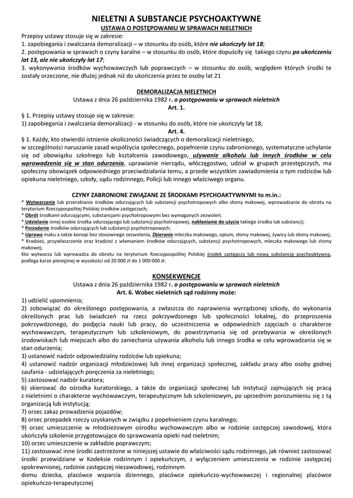 NIELETNI A SUBSTANCJE PSYCHOAKTYWNE USTAWA O POSTĘPOWANIU W SPRAWACH NIELETNICH Przepisy ustawy stosuje się w zakresie: 1. zapobiegania i zwalczania demoralizacji – w stosunku do osób, które nie ukończyły lat 18; 2. postępowania w sprawach o czyny karalne – w stosunku do osób, które dopuściły się takiego czynu po ukończeniu lat 13, ale nie ukończyły lat 17; 3. wykonywania środków wychowawczych lub poprawczych – w stosunku do osób, względem których środki te zostały orzeczone, nie dłużej jednak niż do ukończenia przez te osoby lat 21 DEMORALIZACJA NIELETNICH Ustawa z dnia 26 października 1982 r. o postępowaniu w sprawach nieletnich Art. 1. § 1. Przepisy ustawy stosuje się w zakresie: 1) zapobiegania i zwalczania demoralizacji - w stosunku do osób, które nie ukończyły lat 18; Art. 4. § 1. Każdy, kto stwierdzi istnienie okoliczności świadczących o demoralizacji nieletniego, w szczególności naruszanie zasad współżycia społecznego, popełnienie czynu zabronionego, systematyczne uchylanie się od obowiązku szkolnego lub kształcenia zawodowego, używanie alkoholu lub innych środków w celu wprowadzenia się w stan odurzenia, uprawianie nierządu, włóczęgostwo, udział w grupach przestępczych, ma społeczny obowiązek odpowiedniego przeciwdziałania temu, a przede wszystkim zawiadomienia o tym rodziców lub opiekuna nieletniego, szkoły, sądu rodzinnego, Policji lub innego właściwego organu. CZYNY ZABRONIONE ZWIĄZANE ZE ŚRODKAMI PSYCHOAKTYWNYMI to m.in.: * Wytwarzanie lub przerabianie środków odurzających lub substancji psychotropowych albo słomy makowej, wprowadzanie do obrotu na terytorium Rzeczypospolitej Polskiej środków zastępczych; * Obrót środkami odurzającymi, substancjami psychotropowymi bez wymaganych zezwoleń; * Udzielanie innej osobie środka odurzającego lub substancji psychotropowej, nakłanianie do użycia takiego środka lub substancji; * Posiadanie środków odurzających lub substancji psychotropowych; * Uprawa maku a także konopi bez stosownego zezwolenia, Zbieranie mleczka makowego, opium, słomy makowej, żywicy lub słomy makowej; * Kradzież, przywłaszczenie oraz kradzież z włamaniem środków odurzających, substancji psychotropowych, mleczka makowego lub słomy makowej; Kto wytwarza lub wprowadza do obrotu na terytorium Rzeczypospolitej Polskiej środek zastępczy lub nową substancję psychoaktywną, podlega karze pieniężnej w wysokości od 20 000 zł do 1 000 000 zł. KONSEKWENCJE Ustawa z dnia 26 października 1982 r. o postępowaniu w sprawach nieletnich Art. 6. Wobec nieletnich sąd rodzinny może: 1) udzielić upomnienia; 2) zobowiązać do określonego postępowania, a zwłaszcza do naprawienia wyrządzonej szkody, do wykonania określonych prac lub świadczeń na rzecz pokrzywdzonego lub społeczności lokalnej, do przeproszenia pokrzywdzonego, do podjęcia nauki lub pracy, do uczestniczenia w odpowiednich zajęciach o charakterze wychowawczym, terapeutycznym lub szkoleniowym, do powstrzymania się od przebywania w określonych środowiskach lub miejscach albo do zaniechania używania alkoholu lub innego środka w celu wprowadzania się w stan odurzenia; 3) ustanowić nadzór odpowiedzialny rodziców lub opiekuna; 4) ustanowić nadzór organizacji młodzieżowej lub innej organizacji społecznej, zakładu pracy albo osoby godnej zaufania - udzielających poręczenia za nieletniego; 5) zastosować nadzór kuratora; 6) skierować do ośrodka kuratorskiego, a także do organizacji społecznej lub instytucji zajmujących się pracą z nieletnimi o charakterze wychowawczym, terapeutycznym lub szkoleniowym, po uprzednim porozumieniu się z tą organizacją lub instytucją; 7) orzec zakaz prowadzenia pojazdów; 8) orzec przepadek rzeczy uzyskanych w związku z popełnieniem czynu karalnego; 9) orzec umieszczenie w młodzieżowym ośrodku wychowawczym albo w rodzinie zastępczej zawodowej, która ukończyła szkolenie przygotowujące do sprawowania opieki nad nieletnim; 10) orzec umieszczenie w zakładzie poprawczym; 11) zastosować inne środki zastrzeżone w niniejszej ustawie do właściwości sądu rodzinnego, jak również zastosować środki przewidziane w Kodeksie rodzinnym i opiekuńczym, z wyłączeniem umieszczenia w rodzinie zastępczej spokrewnionej, rodzinie zastępczej niezawodowej, rodzinnym domu dziecka, placówce wsparcia dziennego, placówce opiekuńczo-wychowawczej i regionalnej placówce opiekuńczo-terapeutycznej RODZICE A ZACHOWANIE DZIECKA Ustawa z dnia 26 października 1982 r. o postępowaniu w sprawach nieletnich Art. 7. § 1. Sąd rodzinny może: 1) zobowiązać rodziców lub opiekuna do poprawy warunków wychowawczych, bytowych lub zdrowotnych nieletniego, a także do ścisłej współpracy ze szkołą, do której nieletni uczęszcza, poradnią psychologicznopedagogiczną lub inną poradnią specjalistyczną, zakładem pracy, w którym jest zatrudniony, oraz lekarzem lub zakładem leczniczym; 2) zobowiązać rodziców lub opiekuna do naprawienia w całości lub w części szkody wyrządzonej przez nieletniego; § 2. Sąd może zwrócić się do właściwych instytucji państwowych lub społecznych oraz jednostek samorządowych o udzielenie niezbędnej pomocy w poprawie warunków wychowawczych, bytowych lub zdrowotnych nieletniego. Art. 8. § 1. W wypadku gdy rodzice lub opiekun nieletniego uchylają się od wykonania obowiązków nałożonych na nich przez sąd rodzinny, sąd ten może wymierzyć im karę pieniężną w wysokości od 50 do 1.500 złotych. § 2. Sąd uchyla karę pieniężną w całości lub w części, jeżeli osoba ukarana w ciągu 14 dni usprawiedliwi swoje zachowanie lub przystąpi do wykonywania nałożonych obowiązków. USTAWA z dnia 23 kwietnia 1964 r. Kodeks cywilny Art. 426. Małoletni, który nie ukończył lat trzynastu, nie ponosi odpowiedzialności za wyrządzoną szkodę. Art. 427. Kto z mocy ustawy lub umowy jest zobowiązany do nadz