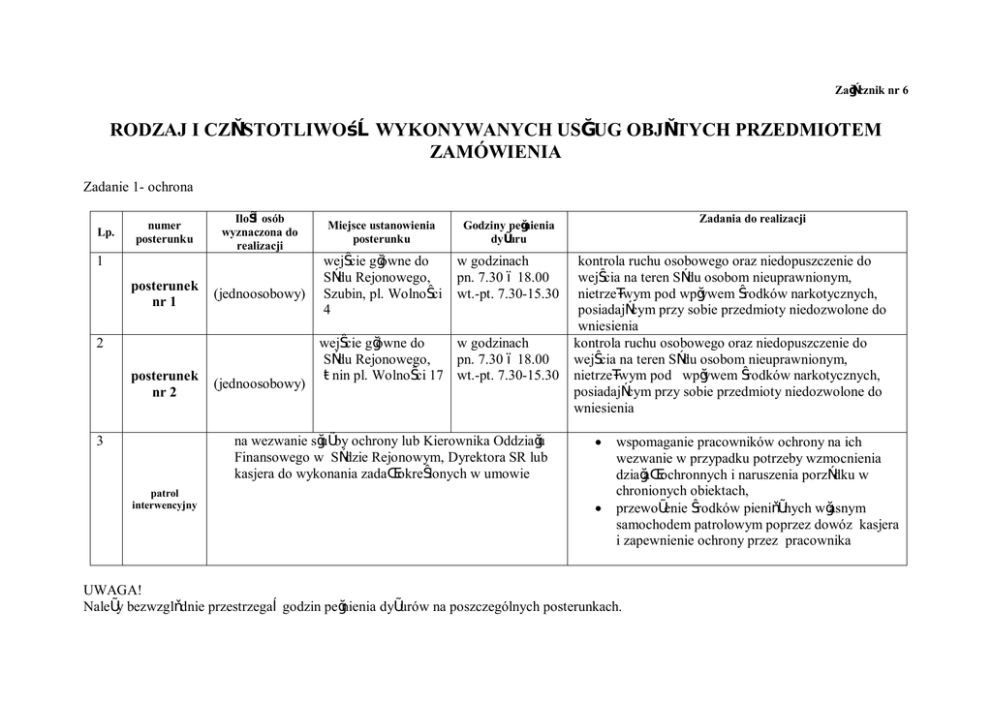 Załącznik nr 6 RODZAJ I CZĘSTOTLIWOŚĆ WYKONYWANYCH USŁUG OBJĘTYCH PRZEDMIOTEM ZAMÓWIENIA Zadanie 1- ochrona Lp. numer posterunku Ilość osób wyznaczona do realizacji 1 posterunek nr 1 (jednoosobowy) 2 posterunek nr 2 3 (jednoosobowy) Miejsce ustanowienia posterunku Godziny pełnienia dyżuru wejście główne do Sądu Rejonowego, Szubin, pl. Wolności 4 w godzinach pn. 7.30 – 18.00 wt.-pt. 7.30-15.30 wejście główne do w godzinach Sądu Rejonowego, pn. 7.30 – 18.00 Żnin pl. Wolności 17 wt.-pt. 7.30-15.30 na wezwanie służby ochrony lub Kierownika Oddziału Finansowego w Sądzie Rejonowym, Dyrektora SR lub kasjera do wykonania zadań określonych w umowie patrol interwencyjny Zadania do realizacji kontrola ruchu osobowego oraz niedopuszczenie do wejścia na teren Sądu osobom nieuprawnionym, nietrzeźwym pod wpływem środków narkotycznych, posiadającym przy sobie przedmioty niedozwolone do wniesienia kontrola ruchu osobowego oraz niedopuszczenie do wejścia na teren Sądu osobom nieuprawnionym, nietrzeźwym pod wpływem środków narkotycznych, posiadającym przy sobie przedmioty niedozwolone do wniesienia · · wspomaganie pracowników ochrony na ich wezwanie w przypadku potrzeby wzmocnienia działań ochronnych i naruszenia porządku w chronionych obiektach, przewożenie środków pieniężnych własnym samochodem patrolowym poprzez dowóz kasjera i zapewnienie ochrony przez pracownika UWAGA! Należy bezwzględnie przestrzegać godzin pełnienia dyżurów na poszczególnych posterunkach. Każdy przypadek braku osobowego na wymienionym posterunku, jak również wcześniejsze zwolnienie pracownika ochrony (bez wyznaczenia osoby zastępującej) w godzinach pełnienia służby skutkuje koniecznością powiadomienia przedstawiciela Zamawiającego z jednoczesnym wpisem w książce meldunków pełnienia służby. Zadanie 2- sprzątanie Lp. Rodzaj czynności Częstotliwość wykonywania wg potrzeb 1 x dziennie 1 x w tygodniu Prace porządkowe w budynkach Sądu 1. 1wycieranie kurzu z mebli, parapetów, lamp biurowych, aparatów telefonicznych, listew przypodłogowych 2. 2odkurzanie wykładzin dywanowych 3. 3zamiatanie i mycie podłóg gumolitowych, płytek ceramicznych, lastrika , paneli i parkietów 4. 4mycie i dezynfekcja sanitariatów ( umywalek, muszli, pisuarów ,desek sedesowych, luster , itp) media (papier i mydło toaletowe) do WC zapewnia Zamawiający 5. 5opróżnianie pojemników, zmianę worków i wyrzucanie śmieci do pojemnika (utrzymanie porządku wokół pojemników na śmieci) 6. 6mycie pojemników na śmieci usuwanie kurzu z kratek wentylacyjnych 7. 9codzienne mycie naczyń w sekretariacie Prezesa i u Dyrektora SR x x x x x x x x 1 x w miesiącu 1 x na kwartał uwagi 8. 1mycie stolarki drzwiowej, parapetów, 0grzejników, balustrad, boazerii na korytarzach i salach rozpraw, 9. 1odkurzanie mebli tapicerskich, 1 10. 1mycie wyłączników światła 2 11. 1usuwanie pajęczyn, 3 12. 1ścieranie kurzu z szaf, 4 13. 1konserwacja mebli środkami 5posiadającymi certyfikaty zgodne z normami Unii Europejskiej 14. 1mycie lodówek ( 3 szt.) 6 15. 1mycie tablic informacyjnych i gablot w 7ciągach komunikacyjnych oraz filarów i gzymsów 16. 1położenie powłok polimerowych z x 8częstotliwością zapewniającą czystość i estetykę powierzchni (sale rozpraw, sekretariaty, gabinety sędziowskie, ciągi komunikacyjne), 17. 1mycie lamp wiszących, żyrandoli, 9kinkietów (450 lamp wiszących, 4 żyrandole, pozostałe to lampy rastrowe) 18. 2mycie okien, większość okien mieści się w 0przedziale od 1-3 m2. 19. Pranie firan wraz ze zdjęciem i założeniem. X X X X X X X X nie rzadziej niż 1 raz w miesiącu X x x Ponadto w razie konieczności od strony ulicy 20. 2pranie tapicerki i wykładzin dywanowych 1 21. 2sprzątanie pomieszczeń po remontach, 2 Prace porządkowe na terenach zewnętrznych 23 zamiatanie chodników 24 zamiatanie parkingów wewnętrznych oraz dróg dojazdowych 25 zbieranie śmieci wokół budynków 26 grabienie liści 27 odśnieżanie i wywóz śniegu po ustaniu opadów, przy długotrwałych opadach po 6 godzinach 28 posypywanie chodników i parkingów piaskiem 29 czyszczenie elewacji i krat okiennych (z kurzu, pajęczyn) 30 przycinanie żywopłotów i wyrywanie chwastów oraz usuwanie i wycinanie trawy x x X X X X X X x x