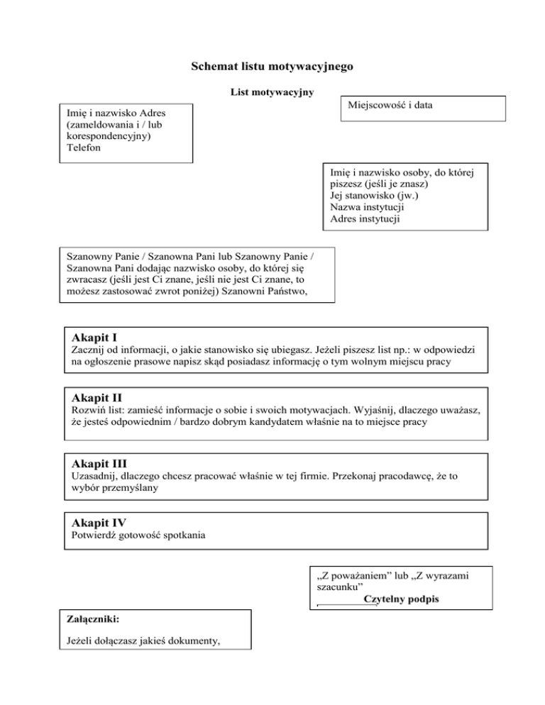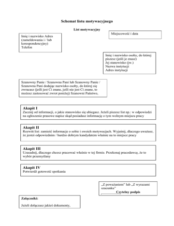 Schemat listu motywacyjnego List motywacyjny Imię i nazwisko Adres (zameldowania i / lub korespondencyjny) Telefon Miejscowość i data Imię i nazwisko osoby, do której piszesz (jeśli je znasz) Jej stanowisko (jw.) Nazwa instytucji Adres instytucji Szanowny Panie / Szanowna Pani lub Szanowny Panie / Szanowna Pani dodając nazwisko osoby, do której się zwracasz (jeśli jest Ci znane, jeśli nie jest Ci znane, to możesz zastosować zwrot poniżej) Szanowni Państwo, Akapit I Zacznij od informacji, o jakie stanowisko się ubiegasz. Jeżeli piszesz list np.: w odpowiedzi na ogłoszenie prasowe napisz skąd posiadasz informację o tym wolnym miejscu pracy Akapit II Rozwiń list: zamieść informacje o sobie i swoich motywacjach. Wyjaśnij, dlaczego uważasz, że jesteś odpowiednim / bardzo dobrym kandydatem właśnie na to miejsce pracy Akapit III Uzasadnij, dlaczego chcesz pracować właśnie w tej firmie. Przekonaj pracodawcę, że to wybór przemyślany Akapit IV Potwierdź gotowość spotkania „Z poważaniem” lub „Z wyrazami szacunku” Czytelny podpis Załączniki: Jeżeli dołączasz jakieś dokumenty, wymień je.