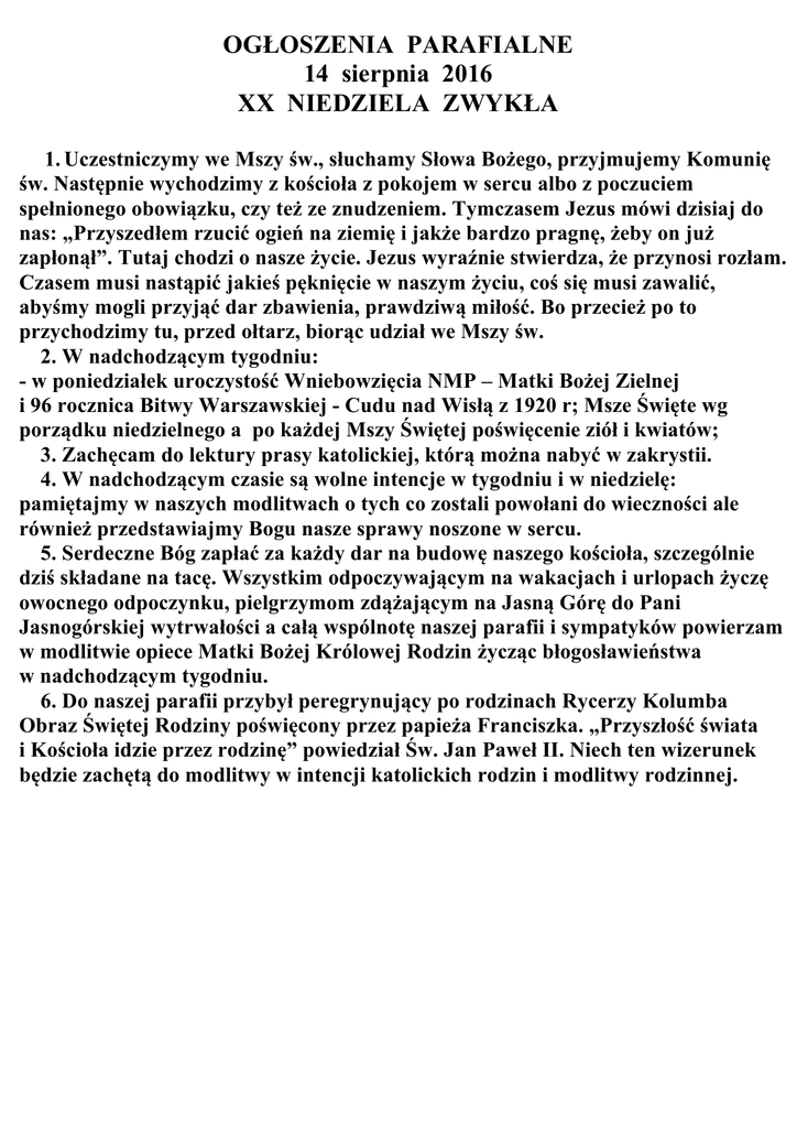 OGŁOSZENIA PARAFIALNE 14 sierpnia 2016 XX NIEDZIELA ZWYKŁA 1. Uczestniczymy we Mszy św., słuchamy Słowa Bożego, przyjmujemy Komunię św. Następnie wychodzimy z kościoła z pokojem w sercu albo z poczuciem spełnionego obowiązku, czy też ze znudzeniem. Tymczasem Jezus mówi dzisiaj do nas: „Przyszedłem rzucić ogień na ziemię i jakże bardzo pragnę, żeby on już zapłonął”. Tutaj chodzi o nasze życie. Jezus wyraźnie stwierdza, że przynosi rozłam. Czasem musi nastąpić jakieś pęknięcie w naszym życiu, coś się musi zawalić, abyśmy mogli przyjąć dar zbawienia, prawdziwą miłość. Bo przecież po to przychodzimy tu, przed ołtarz, biorąc udział we Mszy św. 2. W nadchodzącym tygodniu: - w poniedziałek uroczystość Wniebowzięcia NMP – Matki Bożej Zielnej i 96 rocznica Bitwy Warszawskiej - Cudu nad Wisłą z 1920 r; Msze Święte wg porządku niedzielnego a po każdej Mszy Świętej poświęcenie ziół i kwiatów; 3. Zachęcam do lektury prasy katolickiej, którą można nabyć w zakrystii. 4. W nadchodzącym czasie są wolne intencje w tygodniu i w niedzielę: pamiętajmy w naszych modlitwach o tych co zostali powołani do wieczności ale również przedstawiajmy Bogu nasze sprawy noszone w sercu. 5. Serdeczne Bóg zapłać za każdy dar na budowę naszego kościoła, szczególnie dziś składane na tacę. Wszystkim odpoczywającym na wakacjach i urlopach życzę owocnego odpoczynku, pielgrzymom zdążającym na Jasną Górę do Pani Jasnogórskiej wytrwałości a całą wspólnotę naszej parafii i sympatyków powierzam w modlitwie opiece Matki Bożej Królowej Rodzin życząc błogosławieństwa w nadchodzącym tygodniu. 6. Do naszej parafii przybył peregrynujący po rodzinach Rycerzy Kolumba Obraz Świętej Rodziny poświęcony przez papieża Franciszka. „Przyszłość świata i Kościoła idzie przez rodzinę” powiedział Św. Jan Paweł II. Niech ten wizerunek będzie zachętą do modlitwy w intencji katolickich rodzin i modlitwy rodzinnej.