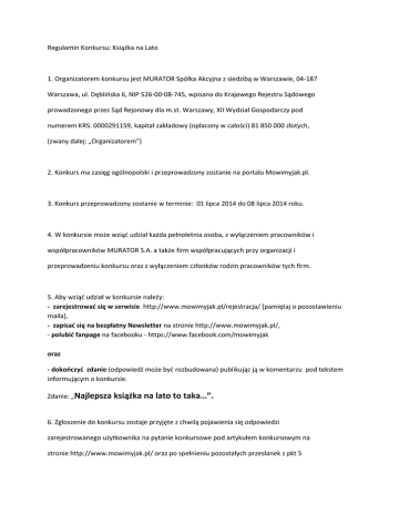 Regulamin Konkursu: Książka na Lato 1. Organizatorem konkursu jest MURATOR Spółka Akcyjna z siedzibą w Warszawie, 04-187 Warszawa, ul. Dęblińska 6, NIP 526-00-08-745, wpisana do Krajowego Rejestru Sądowego prowadzonego przez Sąd Rejonowy dla m.st. Warszawy, XII Wydział Gospodarczy pod numerem KRS: 0000291159, kapitał zakładowy (opłacony w całości) 81 850 000 złotych, (zwany dalej: „Organizatorem”) 2. Konkurs ma zasięg ogólnopolski i przeprowadzony zostanie na portalu Mowimyjak.pl. 3. Konkurs przeprowadzony zostanie w terminie: 01 lipca 2014 do 08 lipca 2014 roku. 4. W konkursie może wziąć udział każda pełnoletnia osoba, z wyłączeniem pracowników i współpracowników MURATOR S.A. a także firm współpracujących przy organizacji i przeprowadzeniu konkursu oraz z wyłączeniem członków rodzin pracowników tych firm. 5. Aby wziąć udział w konkursie należy: - zarejestrować się w serwisie http://www.mowimyjak.pl/rejestracja/ [pamiętaj o pozostawieniu maila], - zapisać się na bezpłatny Newsletter na stronie http://www.mowimyjak.pl/, - polubić fanpage na facebooku - https://www.facebook.com/mowimyjak oraz - dokończyć zdanie (odpowiedź może być rozbudowana) publikując ją w komentarzu pod tekstem informującym o konkursie. Zdanie: „Najlepsza książka na lato to taka…”. 6. Zgłoszenie do konkursu zostaje przyjęte z chwilą pojawienia się odpowiedzi zarejestrowanego użytkownika na pytanie konkursowe pod artykułem konkursowym na stronie http://www.mowimyjak.pl/ oraz po spełnieniu pozostałych przesłanek z pkt 5 niniejszego regulaminu. 7. Każdy uczestnik poprzez zgłoszenie się do konkursu wyraża zgodę na publiczne ujawnienie, w tym zamieszczenie na stronie jego imienia, nazwiska podczas konkursu, jego promocji, ogłaszania wyników. 8. Nagrody – 10 książek Wydawnictwa Prószyński Media sp. z o.o, o łącznej wartości 346 zł , przyznane zostaną 10 (dziesięciu) uczestnikom konkursu, którzy najciekawiej odpowiedzą na pytanie konkursowe oraz spełnią przesłanki zawarte w pkt 5 niniejszego regulaminu, co potwierdzi Komisja Konkursowa. 9. W skład Komisji Konkursowej wchodzą: Redaktor Prowadzący – Anna Śmiałek Redaktor – Maja Kupiszewska Dział Marketingu – Agata Holnicka. 10. Komisja Konkursowa potwierdza zgodność przeprowadzenia konkursu z niniejszym regulaminem. 11. Nad prawidłowością przebiegu konkursu i pracy Komisji Konkursowej czuwają władze statutowe Organizatora. 12. Wpisanie odpowiedzi w komentarzu pod artykułem konkursowym jest równoznaczne z akceptacją niniejszego Regulaminu oraz wyrażeniem zgody na nieodpłatne otrzymywanie Newslettera od serwisu Mowimyjak.pl. 13. Organizator oświadcza, iż wszystkie nagrody zostaną wydane zgodnie z obowiązującymi przepisami prawa podatkowego. 14. Lista laureatów konkursu (zawierająca imię i nazwisko) zostanie opublikowana 9 lipca 2014 roku w komentarzach pod artykułem konkursowym na stronie internetowej www.mowimyjak.pl. 15. O wygranej nagród organizator konkursu poinformuje zwycięzców w komentarzach pod artykułem konkursowym, a nagrody zostaną przesłane pocztą. 16. Regulamin jest dostępny w lokalu Organizatora przy ul. Dęblińskiej 6, 04-187 Warszawa w dniu od poniedziałku do piątku w godzinach od 9:00 do 16:00 oraz na stronie WWW.mowimyjak.pl w czasie trwania konkursu i w terminie 14 dni roboczych od jego zakończenia. 17. Ewentualne reklamacje związane z konkursem mogą być kierowane do Organizatora wyłącznie w formie pisemnej, na adres Organizatora w terminie 14 dni roboczych od daty jego zakończenia. W przypadku przesłania reklamacji za pośrednictwem poczty decyduje data stempla pocztowego. 18. Reklamacja powinna zawierać imię, nazwisko, dokładny adres i numer telefonu, jak również dokładny opis i powód reklamacji. 19.Złożone przez uczestników reklamacje będą rozpatrywane przez Organizatora niezwłocznie, jednakże nie później niż w terminie 14 dni od daty otrzymania reklamacji przez Organizatora. 20.Zainteresowani uczestnicy zostaną powiadomieni o wyniku rozpatrzenia reklamacji na piśmie, najpóźniej w ciągu 14 dni od daty rozpatrzenia reklamacji przez Organizatora. 21. Niniejszy konkurs nie jest grą hazardową w rozumieniu ustawy o grach hazardowych z dnia 19.11.2009r. 22. Niniejszy regulamin stanowi podstawę prowadzenia konkursu i określa jego warunki oraz prawa i obowiązki jego uczestników. 23. Adres e-mail Organizatora, pod którym można uzyskać informacje na temat organizacji konkursu: [email protected] W imieniu Organizatora Agata Holnicka Warszawa, 30 czerwca 2014 r