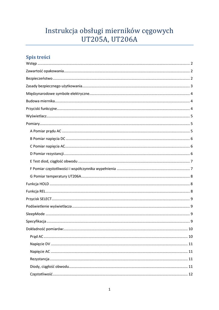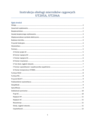 Instrukcja obsługi mierników cęgowych UT205A, UT206A Spis treści Wstęp ...................................................................................................................................................... 2 Zawartość opakowania............................................................................................................................ 2 Bezpieczeństwo ....................................................................................................................................... 2 Zasady bezpiecznego użytkowania.......................................................................................................... 3 Międzynarodowe symbole elektryczne................................................................................................... 4 Budowa miernika..................................................................................................................................... 4 Przyciski funkcyjne................................................................................................................................... 4 Wyświetlacz ............................................................................................................................................. 5 Pomiary.................................................................................................................................................... 5 A Pomiar prądu AC .............................................................................................................................. 5 B Pomiar napięcia DC .......................................................................................................................... 6 C Pomiar napięcia AC........................................................................................................................... 6 D Pomiar rezystancji ............................................................................................................................ 6 E Test diod, ciągłość obwodu .............................................................................................................. 7 F Pomiar częstotliwości i współczynnika wypełnienia ........................................................................ 7 G Pomiar temperatury UT206A ........................................................................................................... 8 Funkcja HOLD .......................................................................................................................................... 8 Funkcja REL .............................................................................................................................................. 8 Przycisk SELECT ........................................................................................................................................ 9 Podświetlenie wyświetlacza .................................................................................................................... 9 SleepMode .............................................................................................................................................. 9 Specyfikacja ............................................................................................................................................. 9 Dokładność pomiarów:.......................................................................................................................... 10 Prąd AC .............................................................................................................................................. 10 Napięcie DV ....................................................................................................................................... 11 Napięcie AC ....................................................................................................................................... 11 Rezystancja ........................................................................................................................................ 11 Diody, ciągłość obwodu..................................................................................................................... 11 Częstotliwość ..................................................................................................................................... 12 1 Współczynnik wypełnienia ................................................................................................................ 12 Temperatura...................................................................................................................................... 12 Serwis .................................................................................................................................................... 12 Uwagi ogólne ..................................................................................................................................... 12 Wymiana baterii ................................................................................................................................ 12 Wstęp Instrukcja zawiera informacje jak bezpiecznie posługiwać się miernikiem. Przeczytaj ją uważnie, zwróć uwagę na Ostrzeżenia i Uwagi. Ostrzeżenie Aby uniknąć porażenia prądem lub uszkodzenia ciała zapoznaj się z działami „Bezpieczeństwo ” oraz „Zasady bezpiecznego użytkowania”. UT205A, UT206A są to cęgowe mierniki pomiaru prądu z funkcją stabilizacji pomiaru, są proste w obsłudze, bezpieczne dla użytkownika, charakteryzują się durzą dokładnością. Dodatkowo mierzą: napięcie AC/DC, rezystancję, test diod, ciągłość obwodu, częstotliwość oraz temperaturę. Zawartość opakowania Sprawdź zawartość opakowania, jeżeli jest niekompletnie skontaktuj się ze sprzedawcą. Zawartość: - Instrukcja obsługi - Przewody pomiarowe - Sonda pomiaru temperatury (UT206A) - 